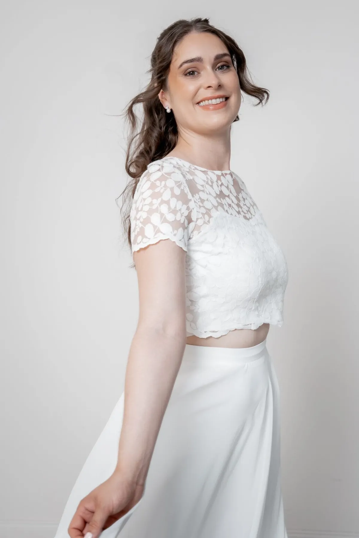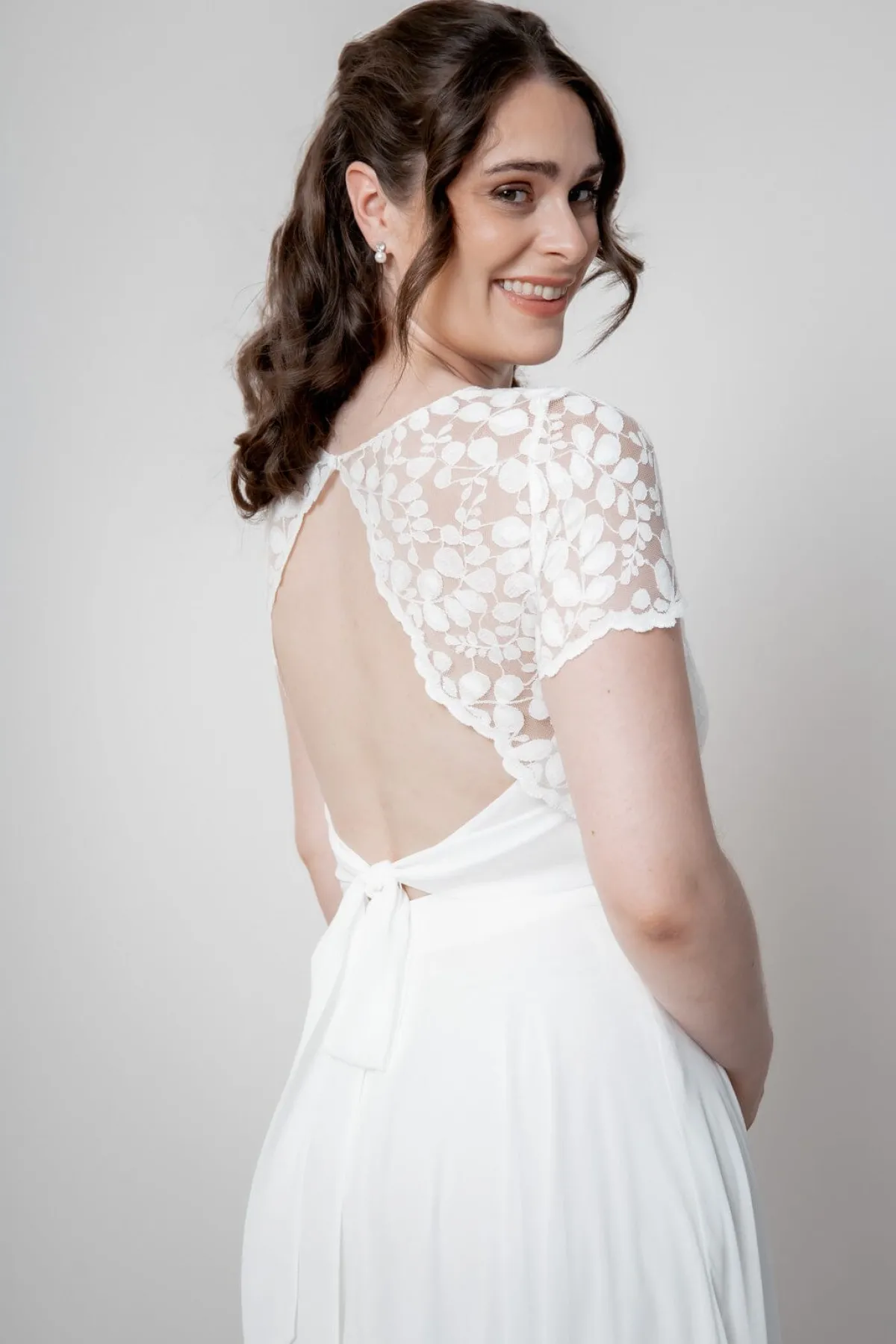 Gemeinsam mit unseren Instagram-Followerinnen haben wir ein Oberteil kreiert, das den Vorstellungen unserer nonibräute entspricht: versehen ist das Sorea-Top mit der beliebten Blätterspitze, kurzen Ärmeln und hübsch geschwungene Bogenkanten. Abgerundet wird das Design durch einen freien Rücken, dekorative Schnürbänder und einer Sweetheart Corsage auf der Vorderseite.