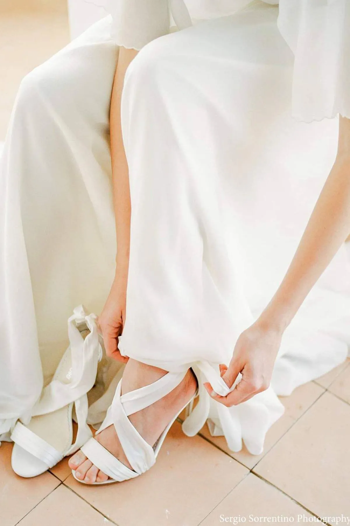 Eleganter Brautschuh mit weichen Seidenbänder, die gekreuzt um deinen Fußspann umwickeln und im Knöchelbereich mit einer großen Schleife abschließen. Der Zehenbereich des stilvollen Stilettos ist offen und und mit einem seidigen Zehenband gearbeitet. Eine Sandalette für die Hochzeit mit Star-Appeal.