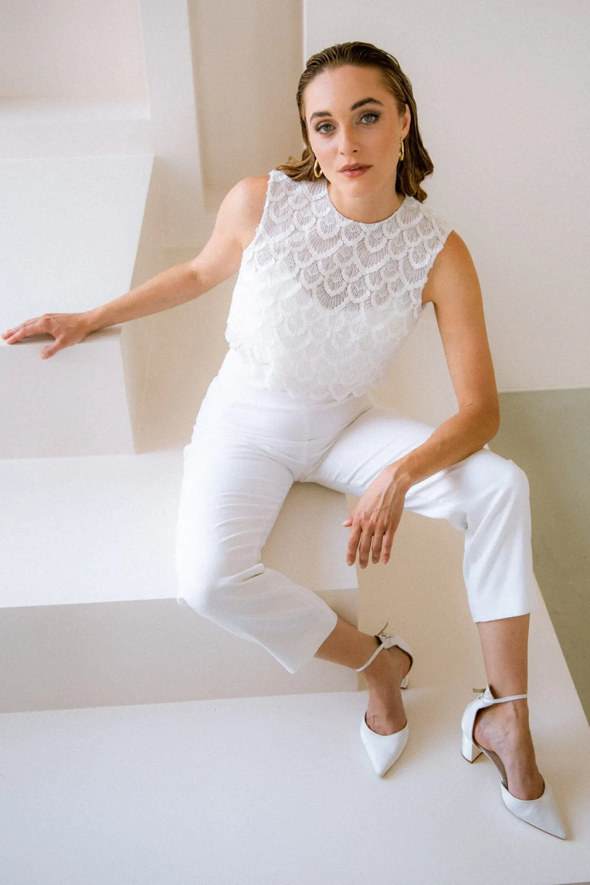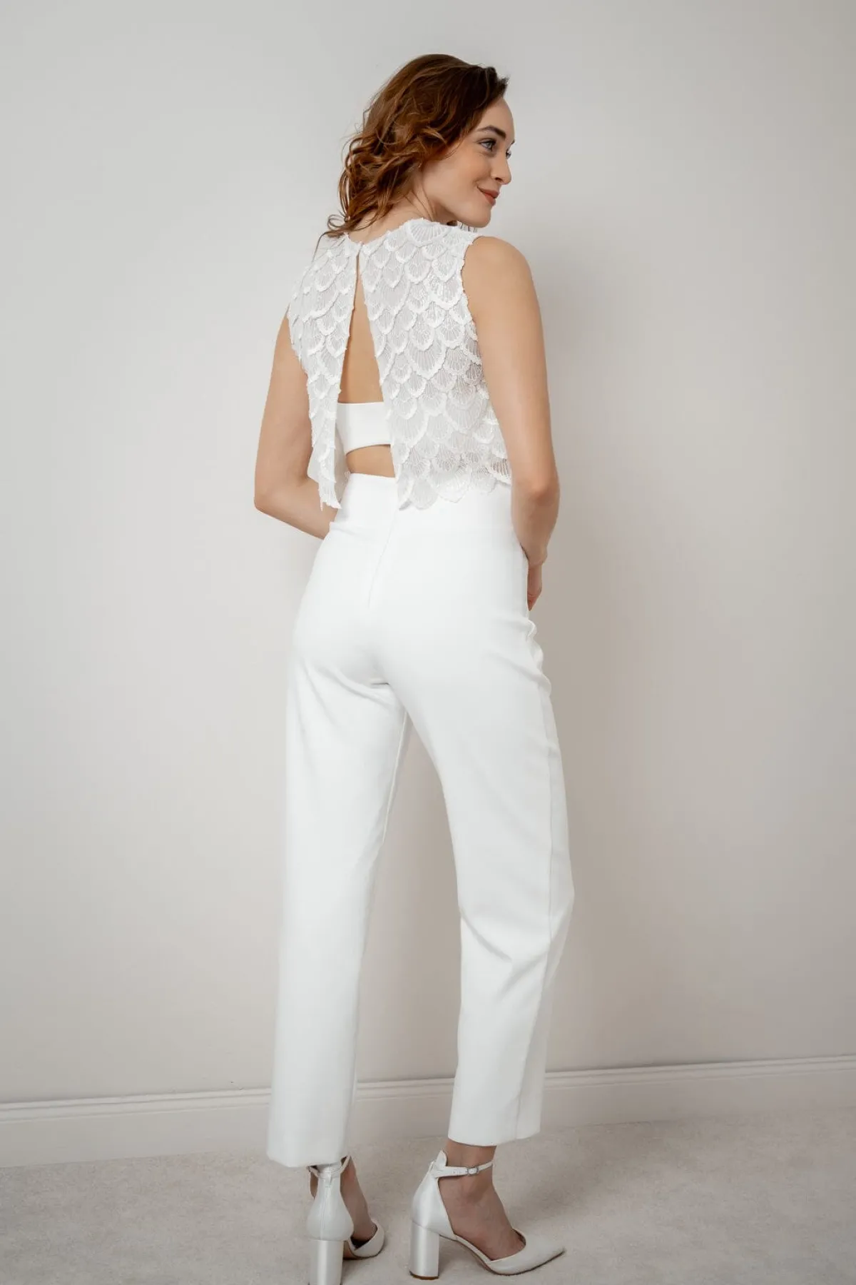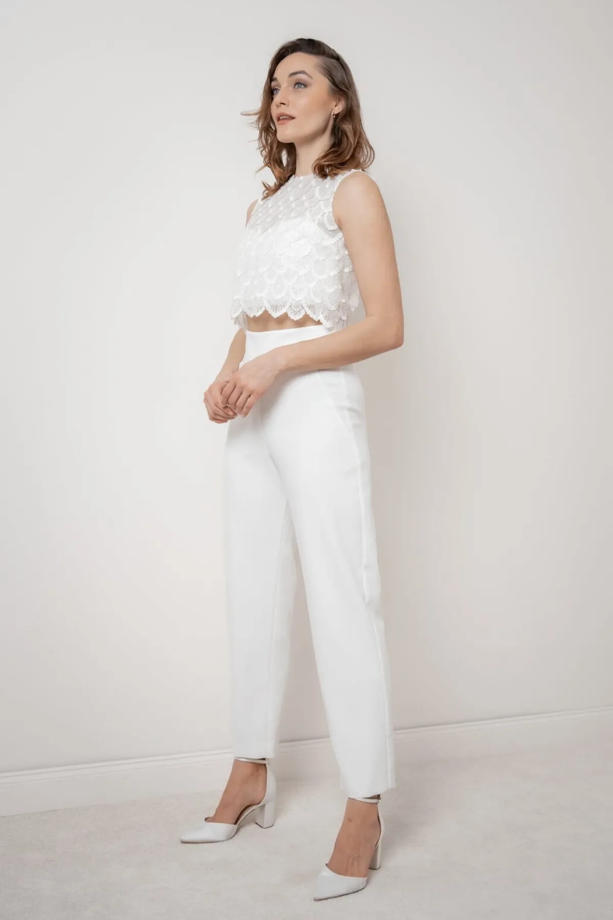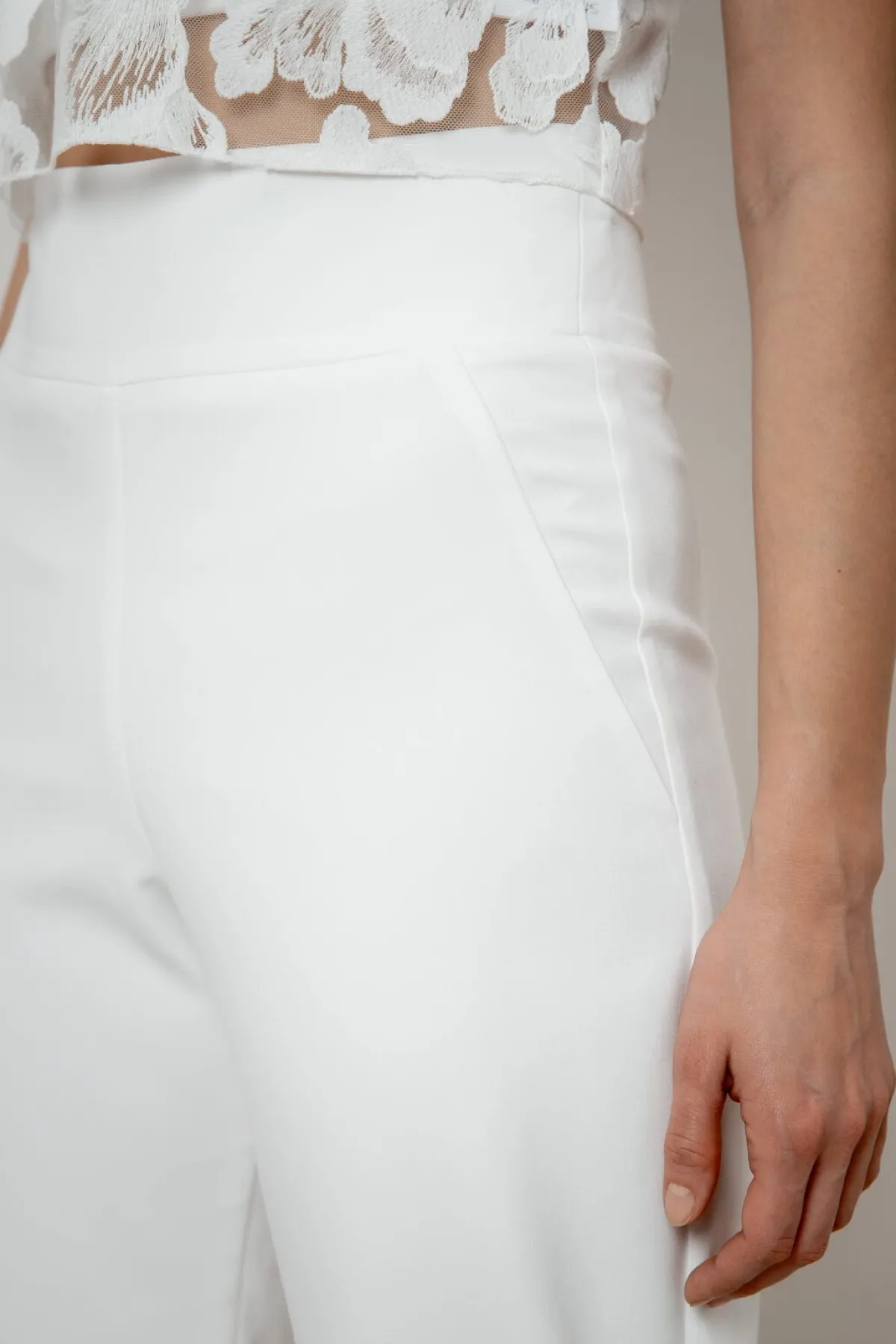 Puristische Hose aus elfenbeinfarbenem Crêpe für vielfältige Hochzeitsoutfits.