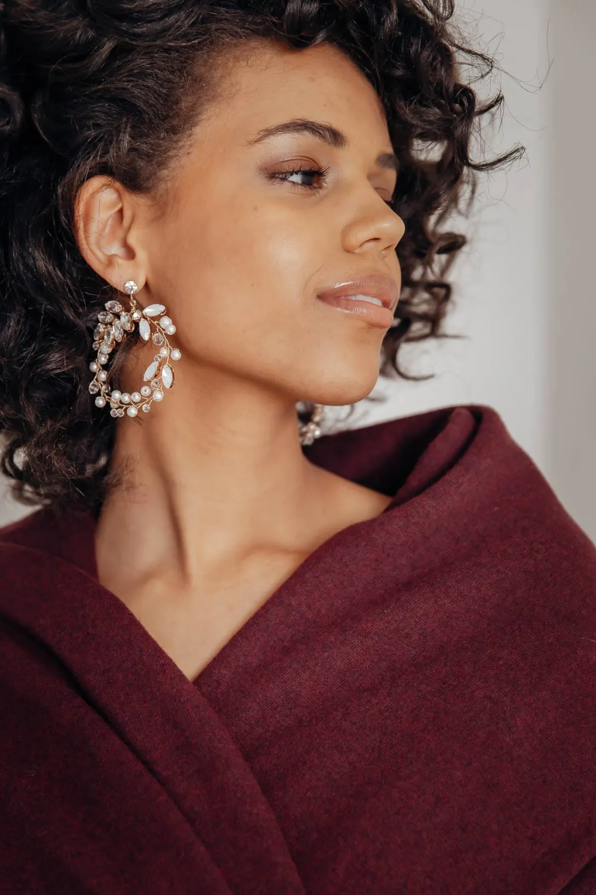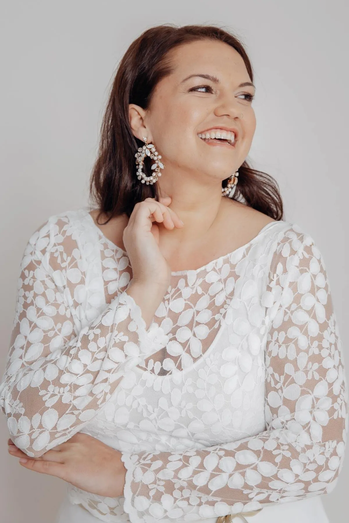 Funkelnde Ohrringe von La Chia in Form von Blütenblättern, die mit Strass und Opalsteinen verziert sind. Durch die kreisförmigen Anhänger erinnern die Ohrringe an stilisierte Lorbeerkränze aus der Zeit des Art Déco und können perfekt zu Brautkleidern im Vintage Stil getragen werden. Boho Looks und cleane, schlichte Hochzeitskleider werden aber genauso schick abgerundet.