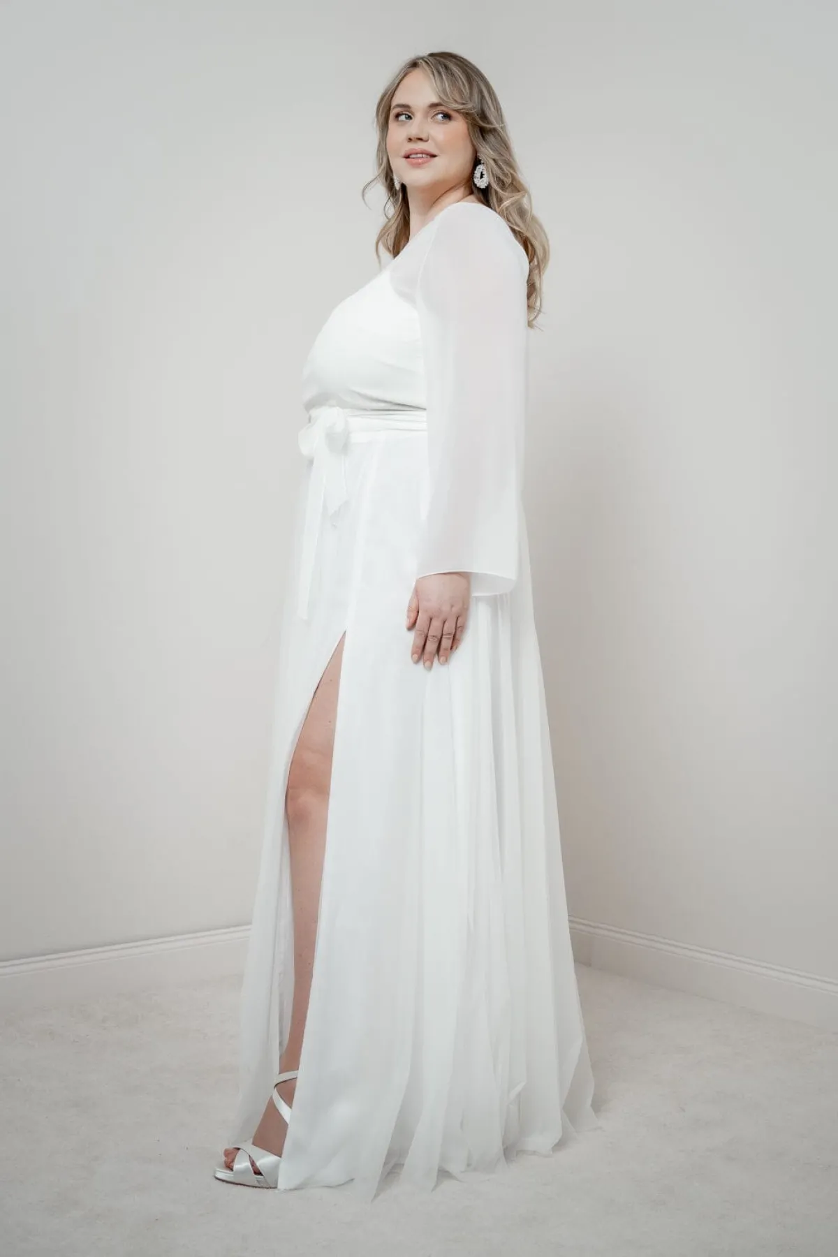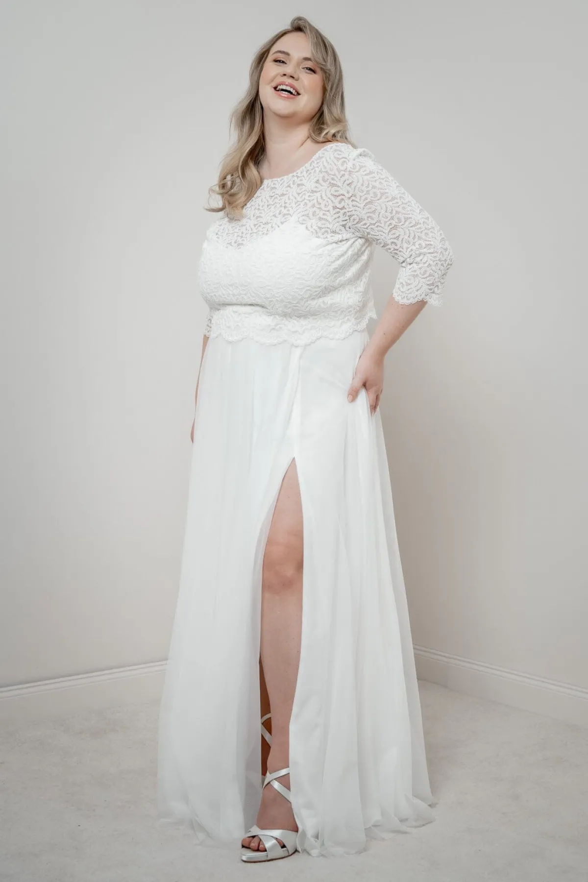 Puristisch gehalten, kommt der Levke Braut-Rock ohne Applikationen aus und ergänzt stimmig minimalistische wie verspielte Zweiteiler-Kombinationen.