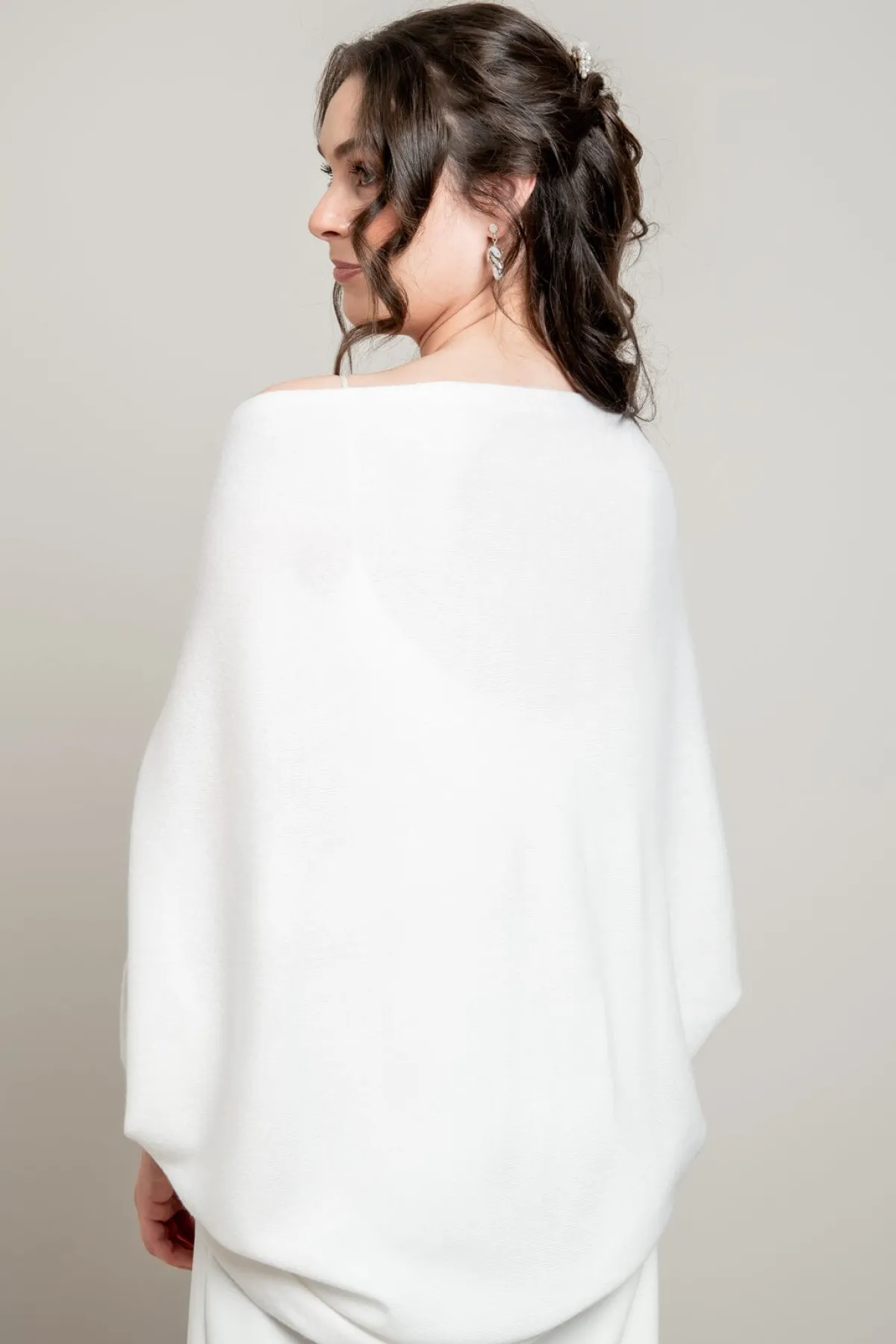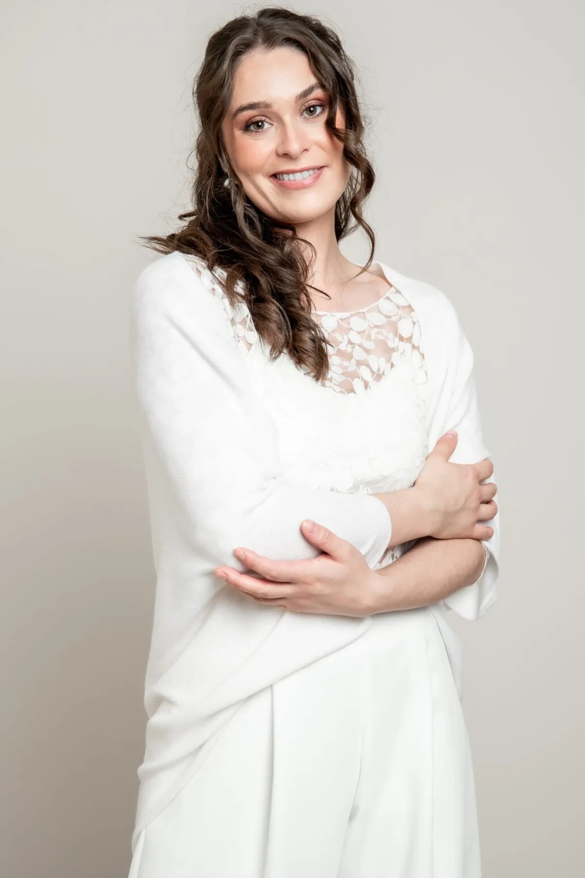 Die Jacke lässt sich mit jeder Art von Brautkleid kombinieren und passt sowohl zu legeren Standesamt- als auch zu glamourösen Brautkleidern.