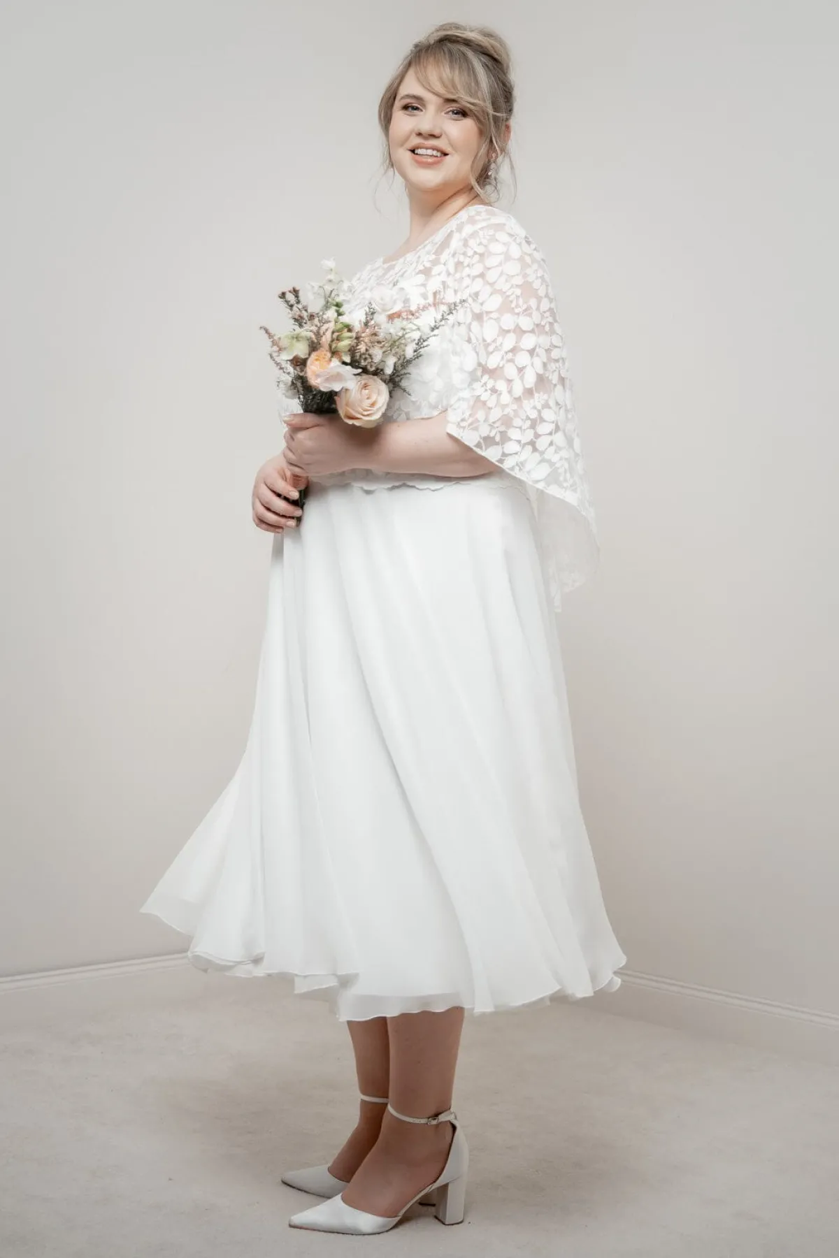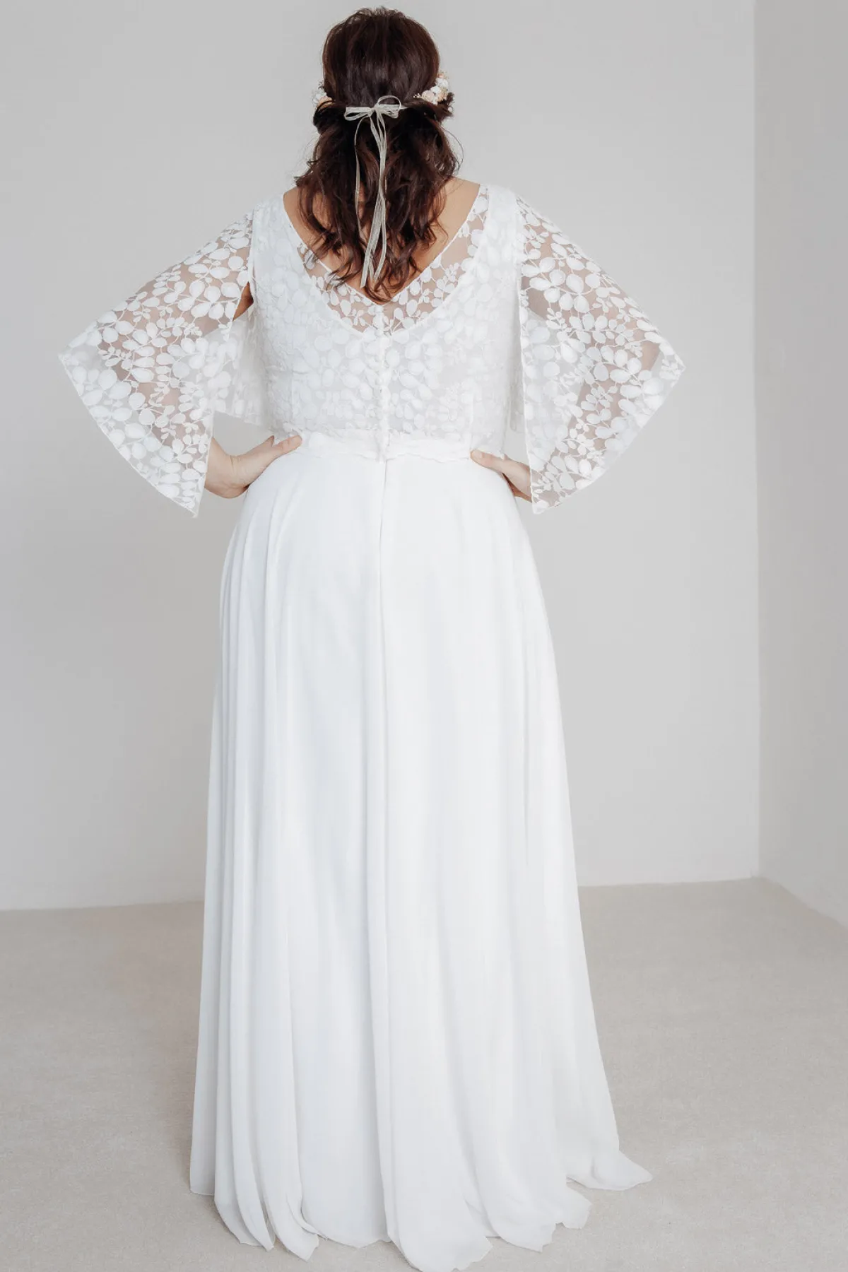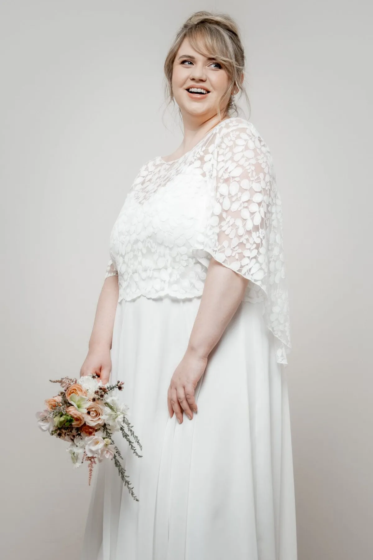 Lucy Curvy ist ein elegantes Bridal Top, das durch seine raffinierten Details überzeugt: sein zeitloser Schnitt, eine romantische Bogenkante, der Bateau-Ausschnitt, der im Rücken zu einem V zusammenläuft sowie eine kleine Knopfleiste im Unterrücken machen das Lucy-Spitzentop zum Key-Piece Deines Brautlooks. Die weiten, fließend fallenden Fledermausärmel sorgen für einen luftig-leichten und beschwingten Look und ein angenehmes Tragegefühl.