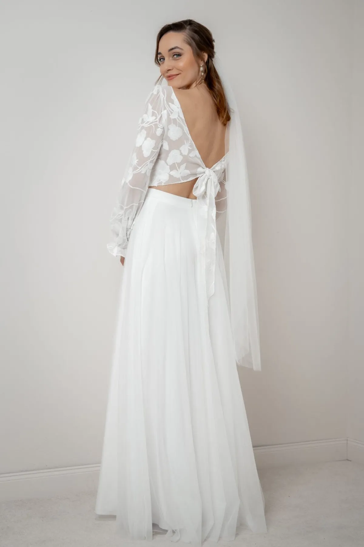 Feminines Braut Top im Blusen-Stil mit klassischem U-Boot-Ausschnitt und langen, gerafften Ärmeln. An den Ärmeln halbtransparent und auf der Vorderseite blickdicht, überrascht das Top mit einem tiefen V-Ausschnitt im Rücken, der in einer gebundenen Schleife endet.