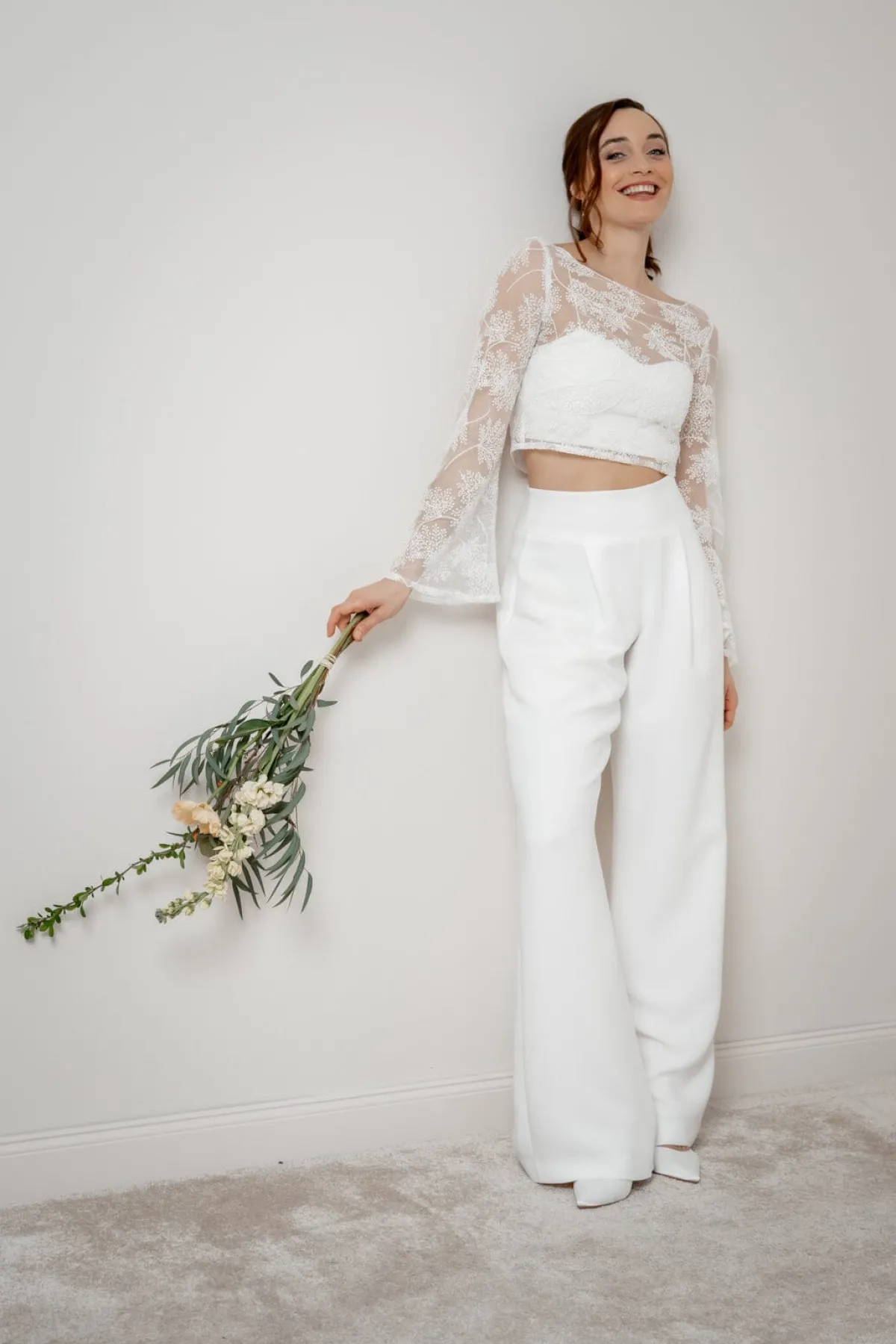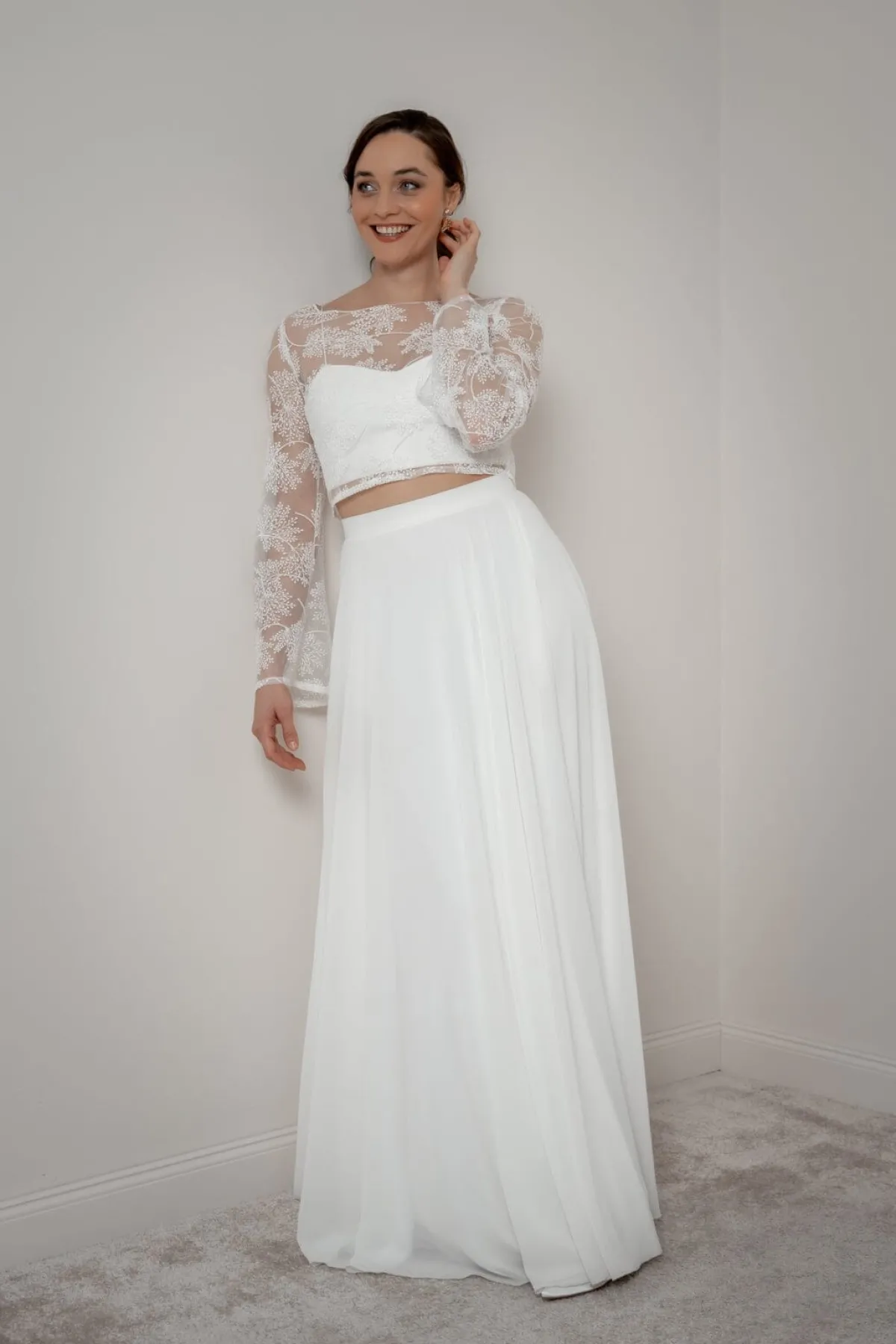 Safi schenkt seiner Trägerin einen ungezwungenen und gleichzeitig erhabenen Look. Weite, lange Trompetenärmel, ein romantisches Allover-Blättermuster und eine durchgängige Knopfleiste im Rücken sind die stilprägenden Details dieses Braut Tops, das sich für moderne Braut Outfits im Mix & Match-Style und auch nach der Hochzeit noch oft gekonnt in Szene setzen lässt.