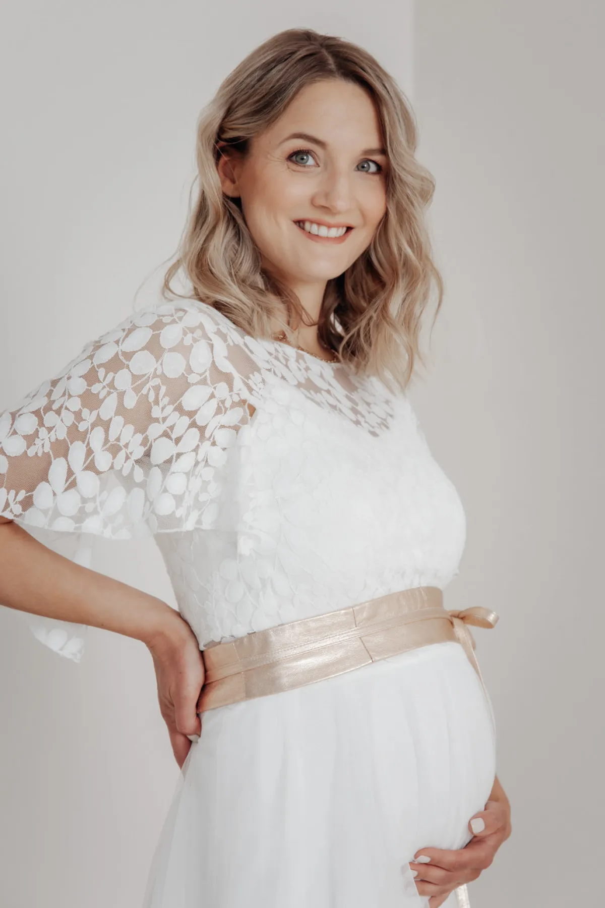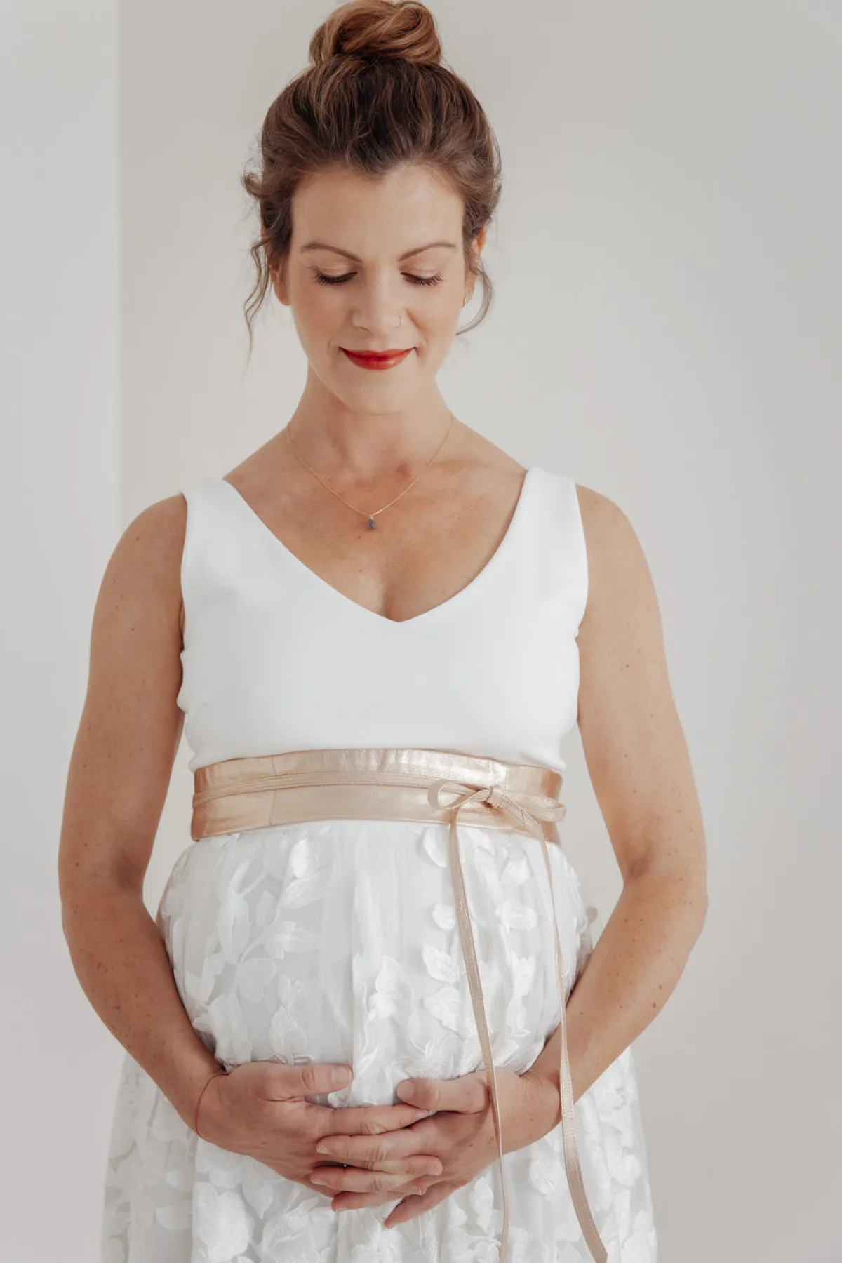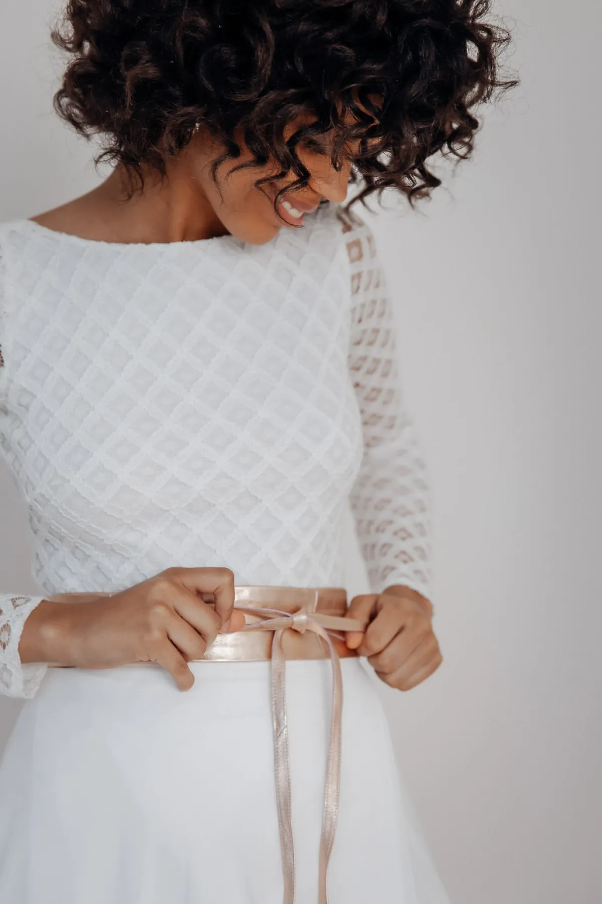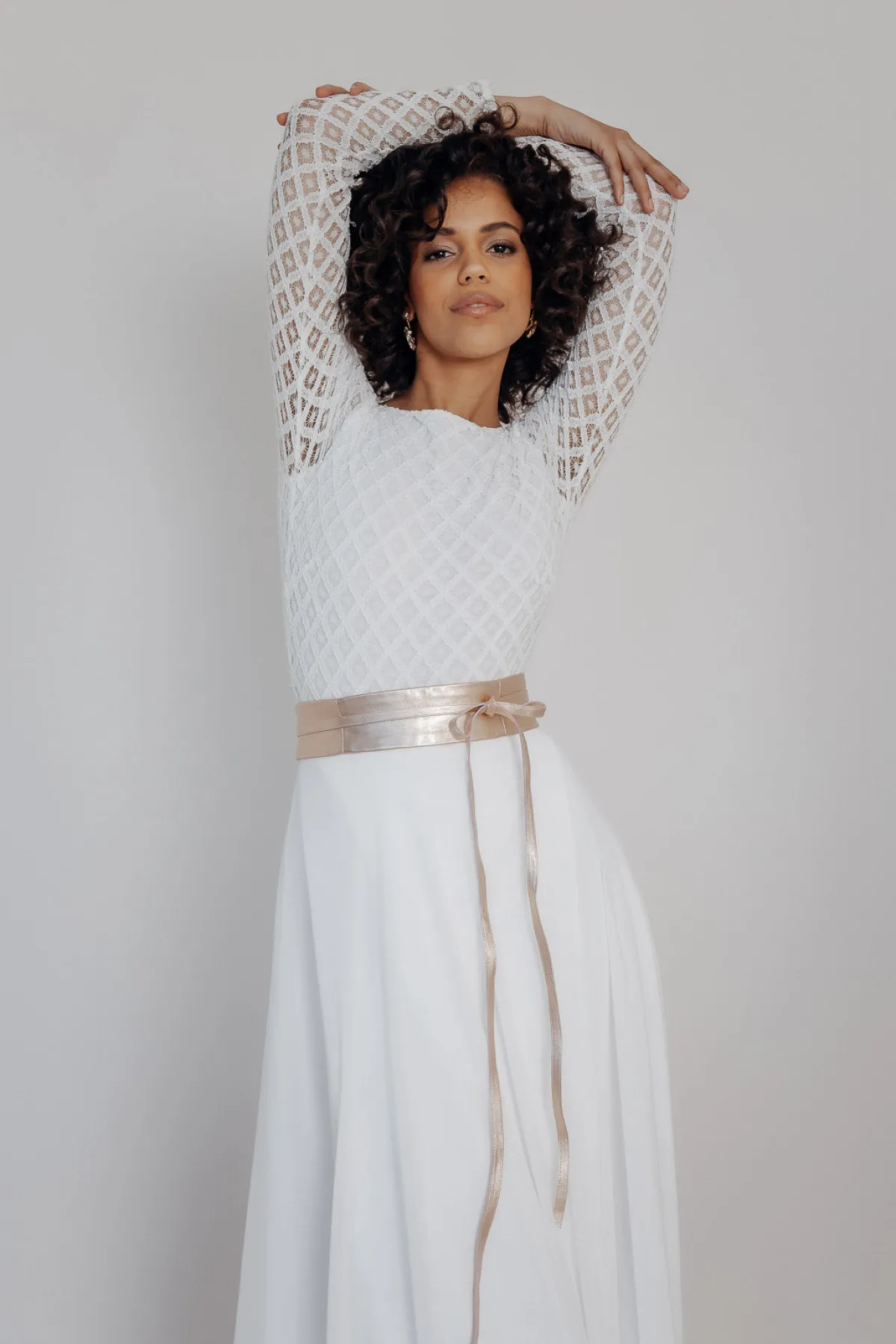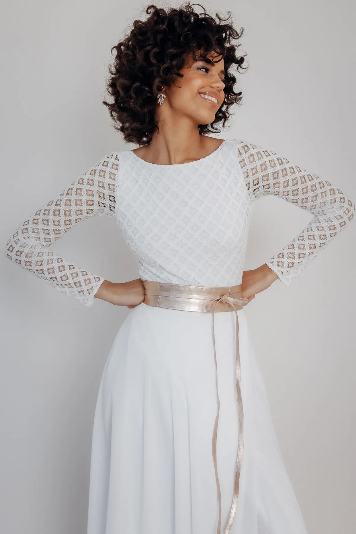 Der Marielle-Brautgürtel in Roségold ist ein wunderschönes Accessoire zum schlichten Brautkleid. Besonders bei modernen zweiteiligen Brautkleidern mit Rock – Top Kombinationen stellt der Brautgürtel eine schöne Verbindung her und betont die Taille der Braut.