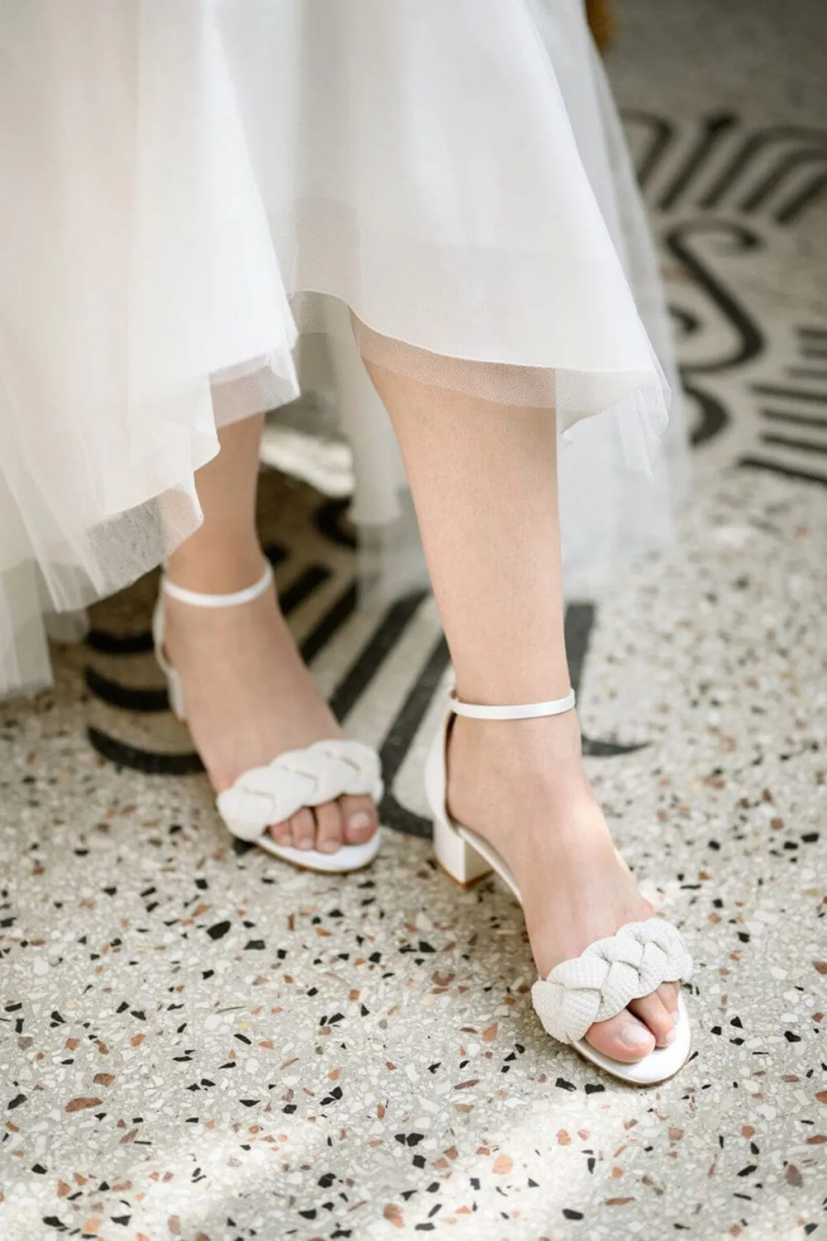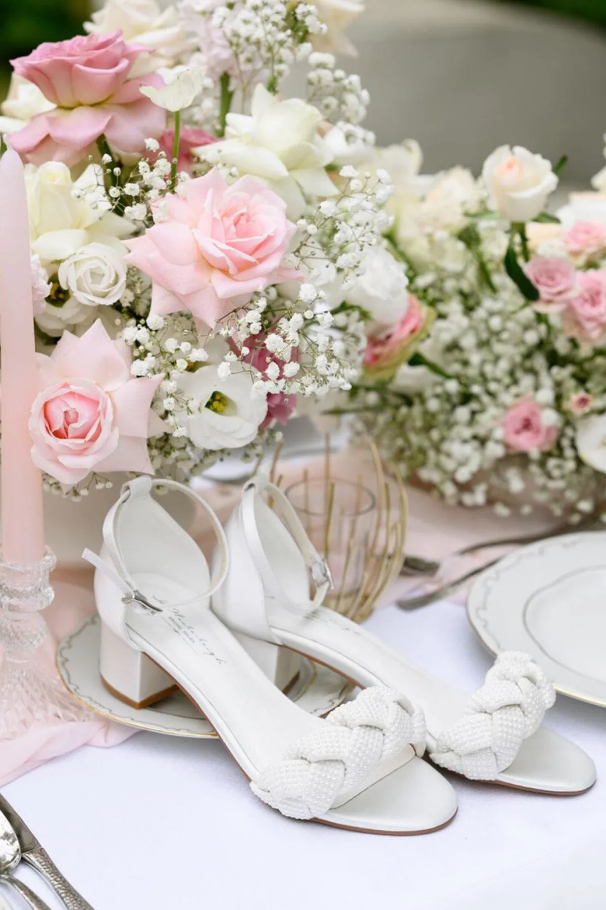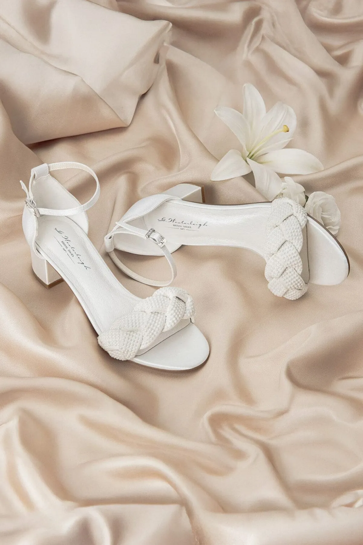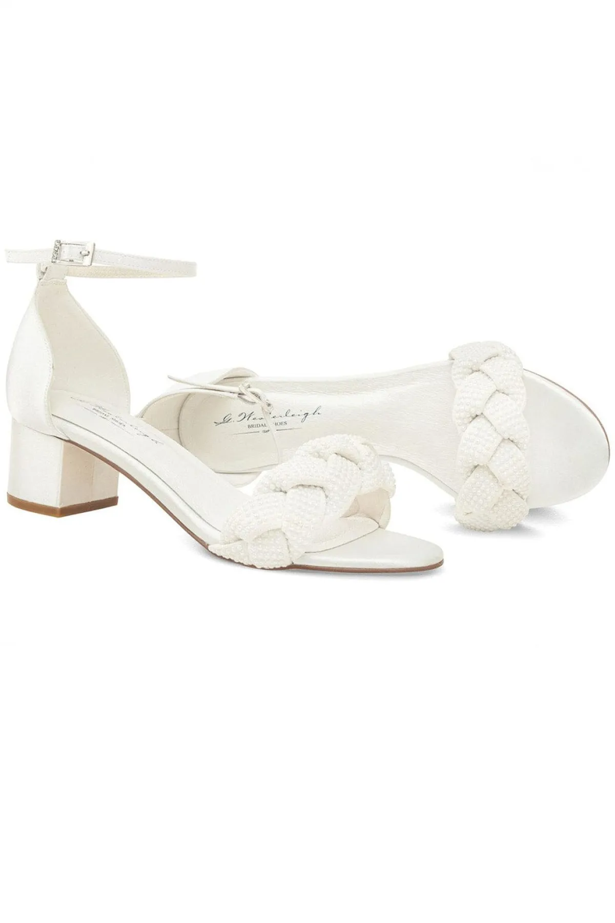Hübsche Sandalen mit modischem Look: die Verzierung aus geflochtenen Perlenriemen trifft auf ivoryfarbenes Satin und ergibt einen stylishen und glamourösen Sommerschuh.