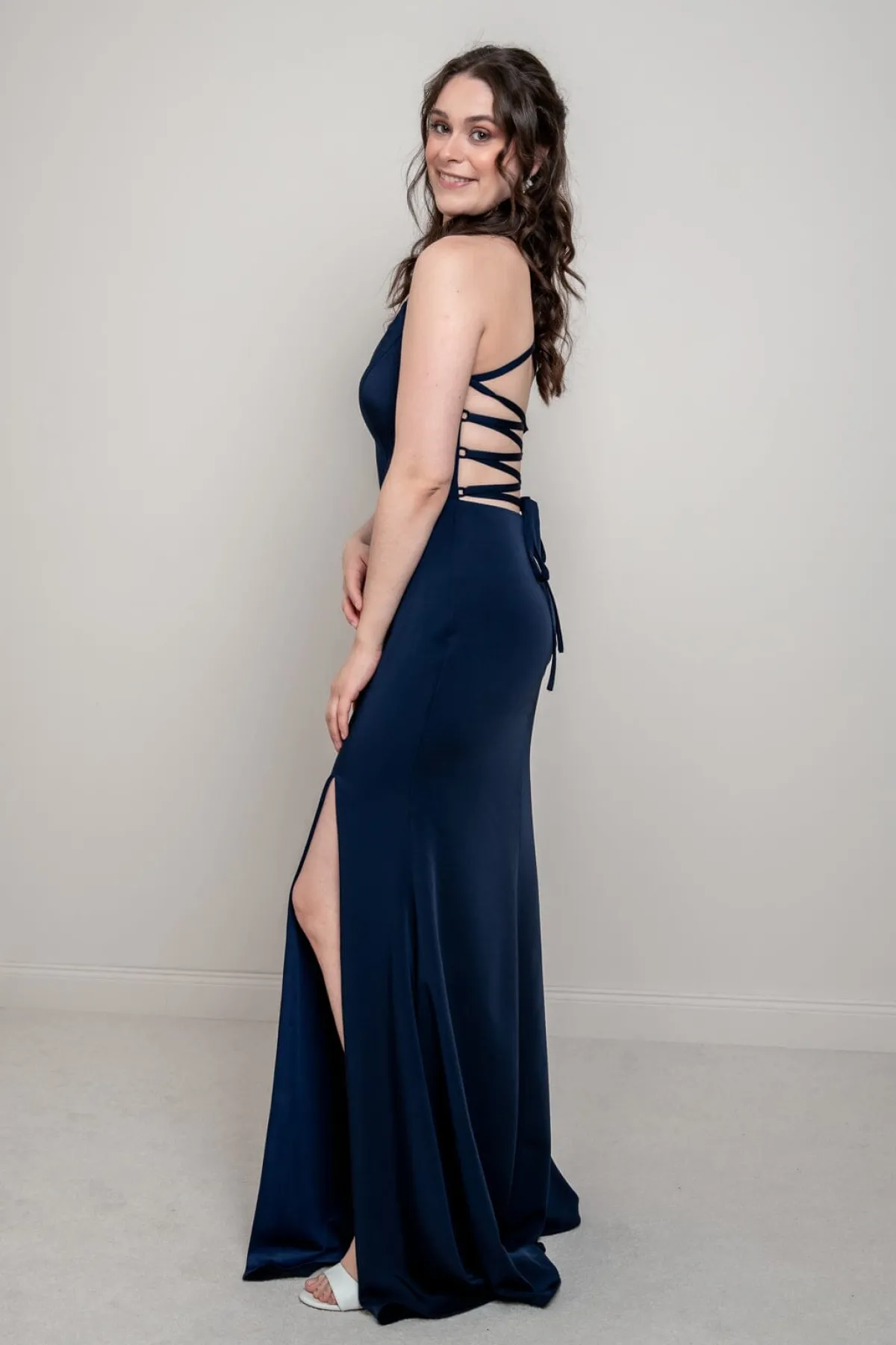 Aus intensivem Dunkelblau strahlt es besondere Eleganz aus. Weitere feminine Details sind sein Beinschlitz und die aufregende Rückenschnürung.