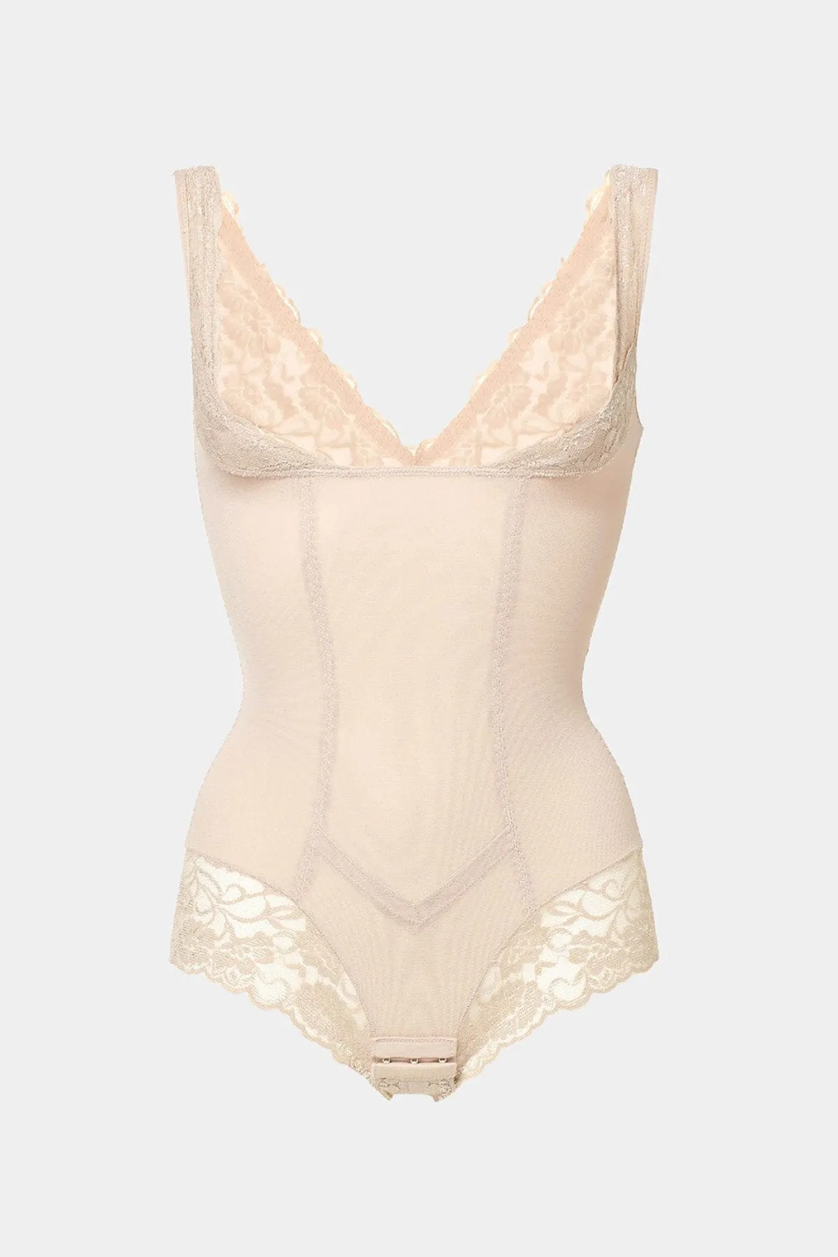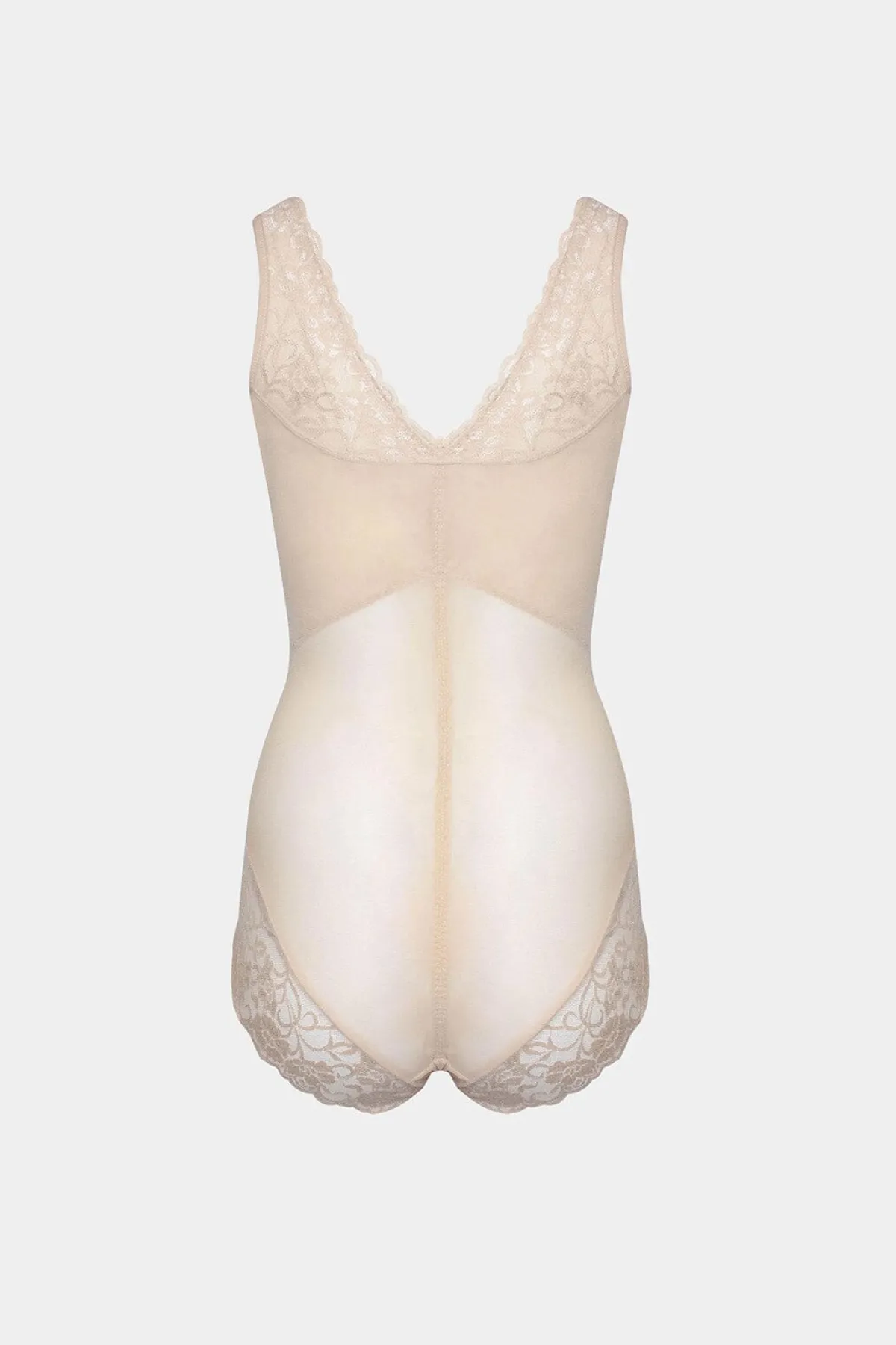 Formgebender Body in der Farbe Latte/Beige mit weicher Spitze und leichtem Netzstoff. Mittlere Formung von Bauch, Taille und Rücken.