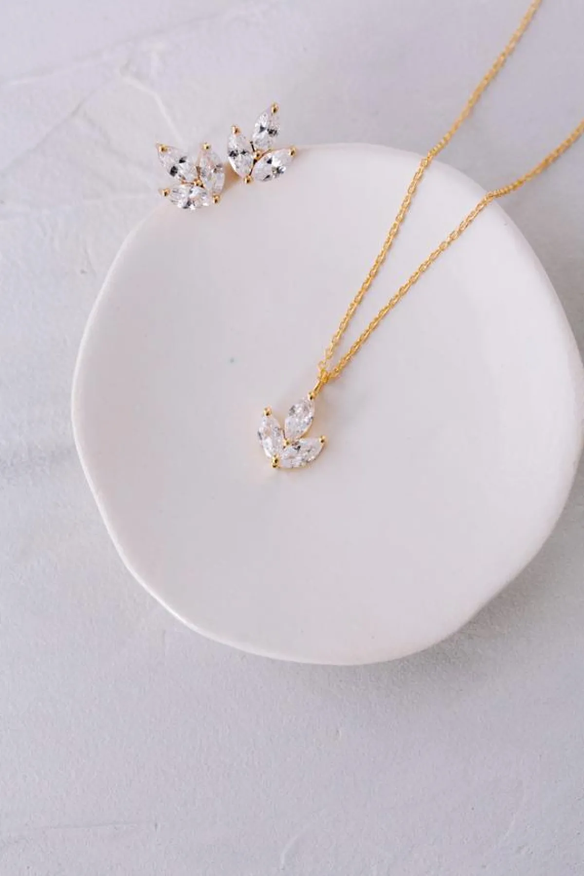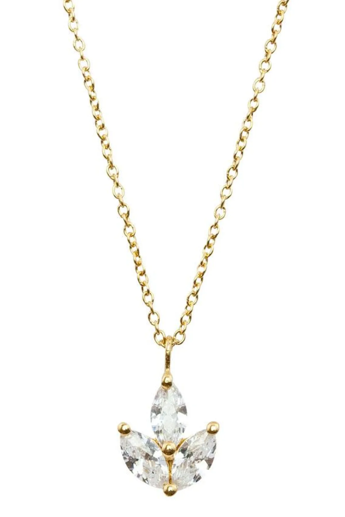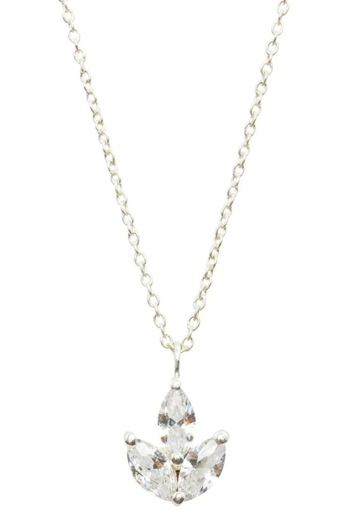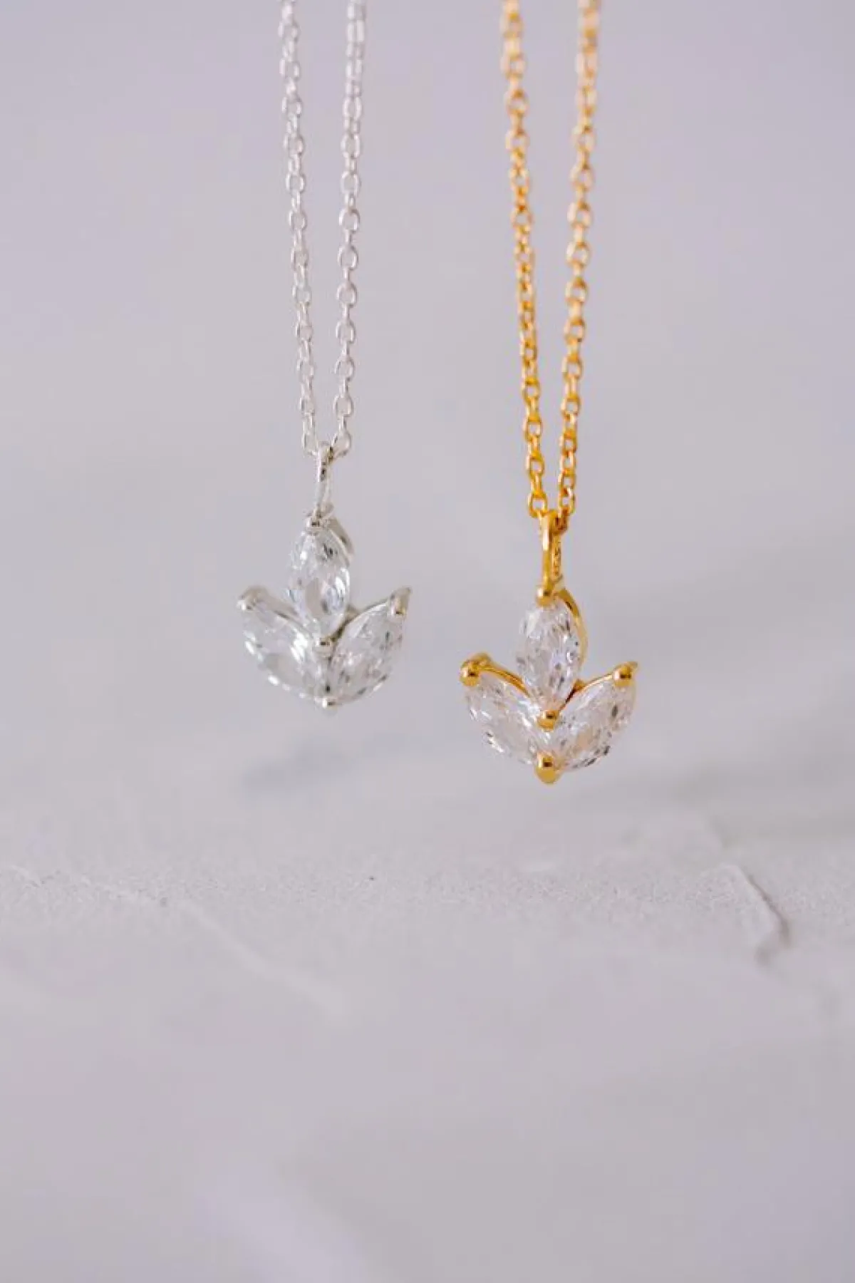 Diese filigrane Halskette, geschmückt mit einem Anhänger aus Zirkonia-Kristallen in Blätteroptik, ist ein dezenter und gleichzeitig femininer Hingucker. Die klassische und dennoch extravagante Brautkette ist sie das perfekte Accessoire zur Hochzeit und später eine wertvolle Erinnerung an den schönsten Tag im Leben.