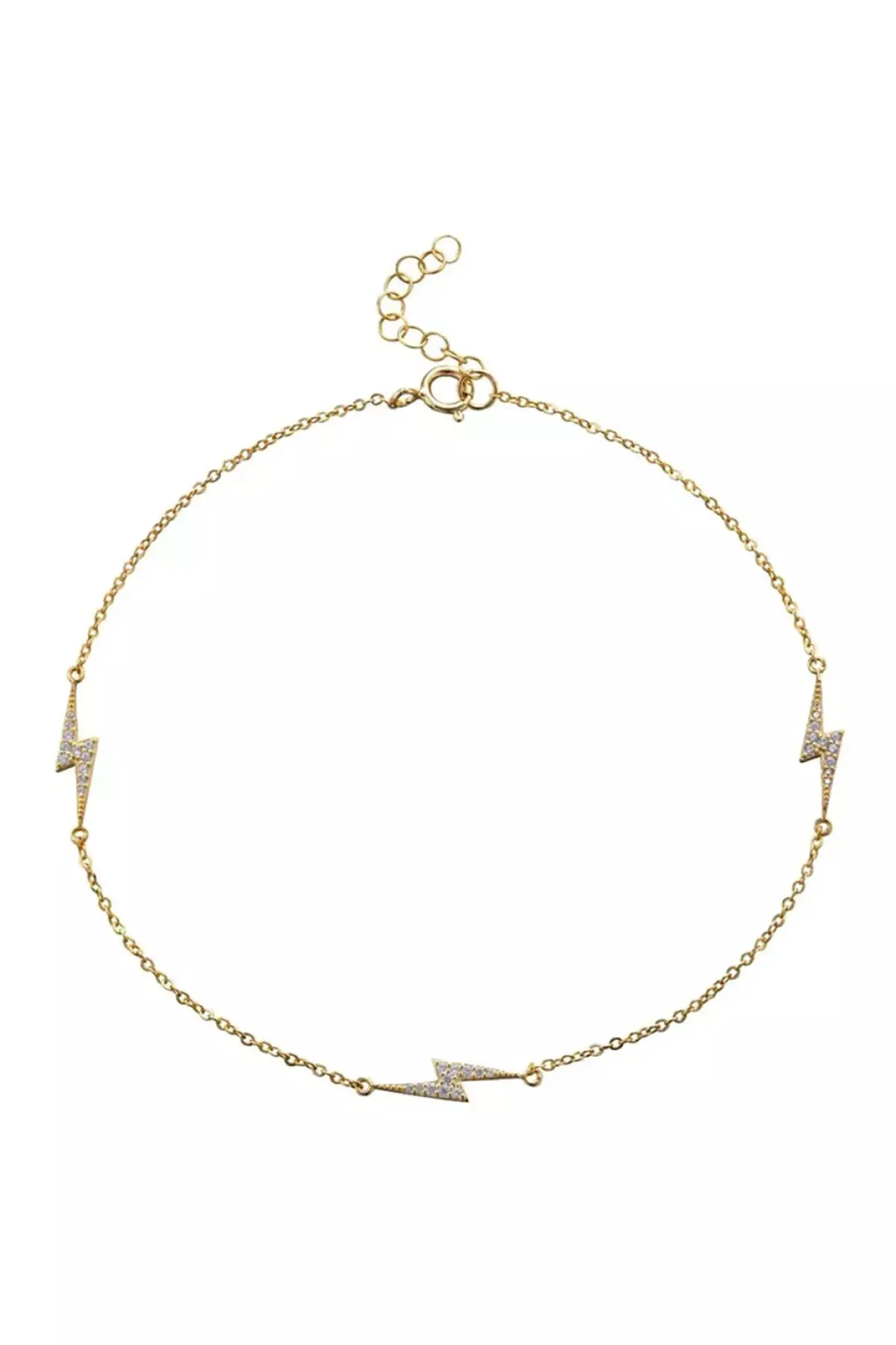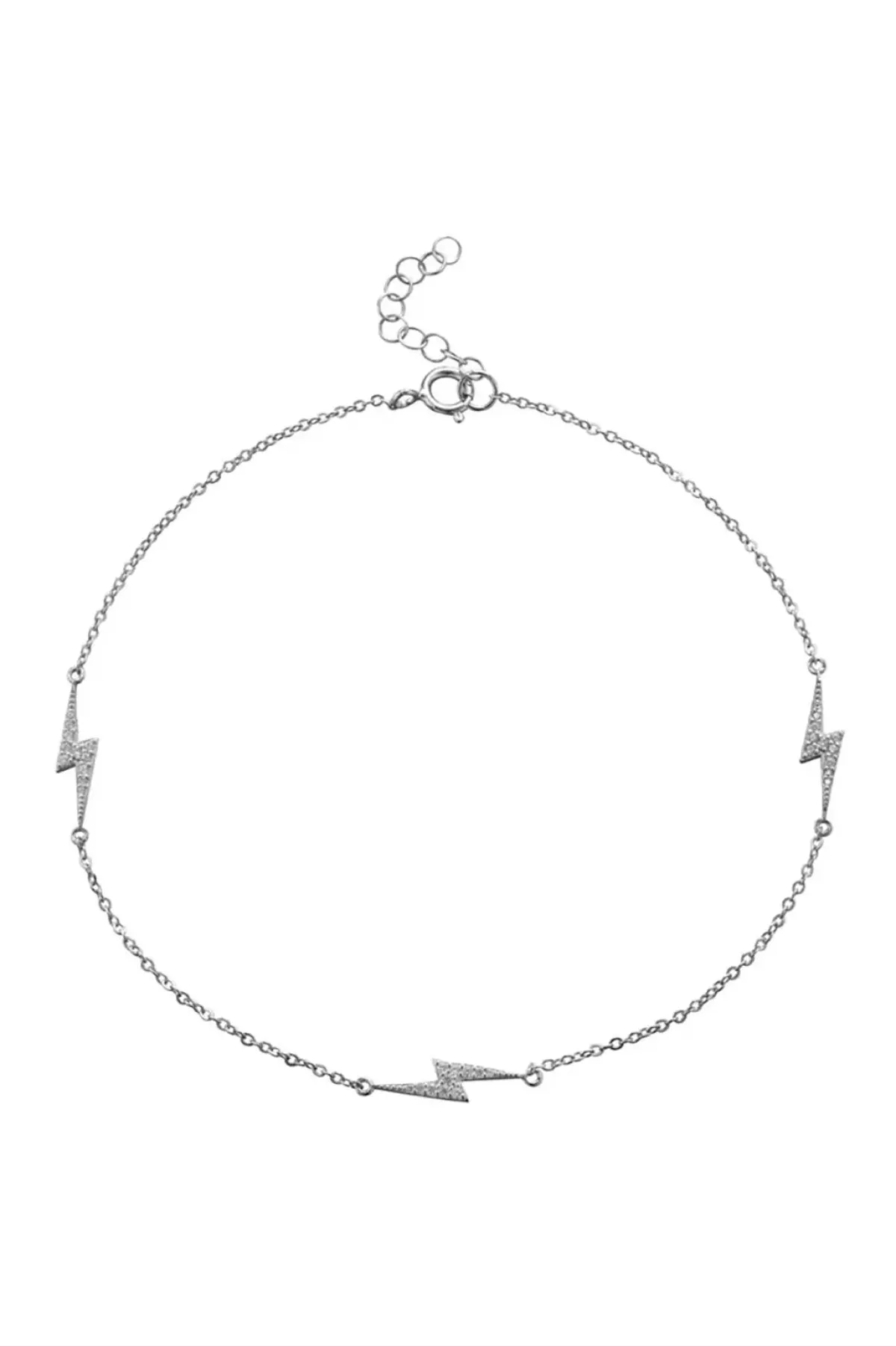 Die filigrane Kette mit kleinen Anhängern fällt sofort ins Auge: Kleine Blitze, verziert mit eingefassten funkelnden Zirkonia-Kristallsteinchen geben dem Schmuckstück einen modernen und originellen Touch. Eine schöne Alternative zu Perlen oder floralen Elementen.