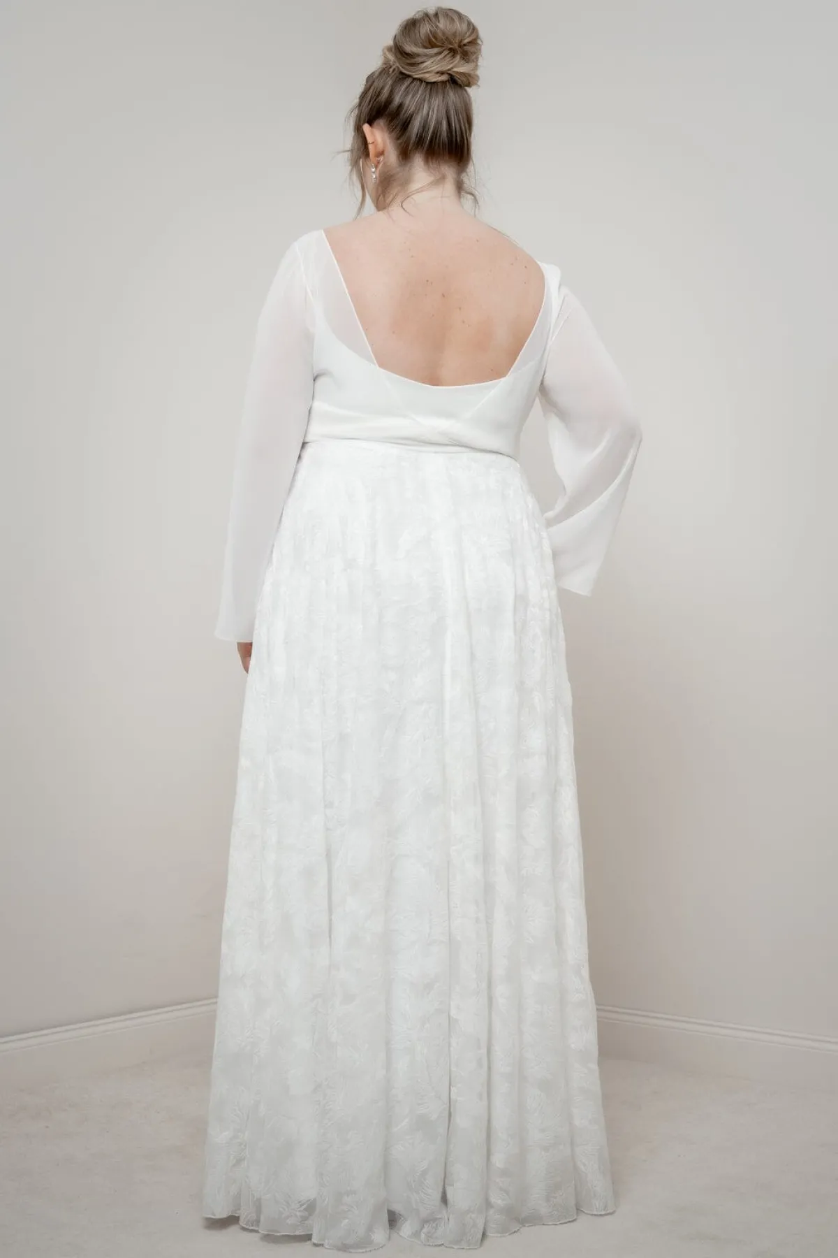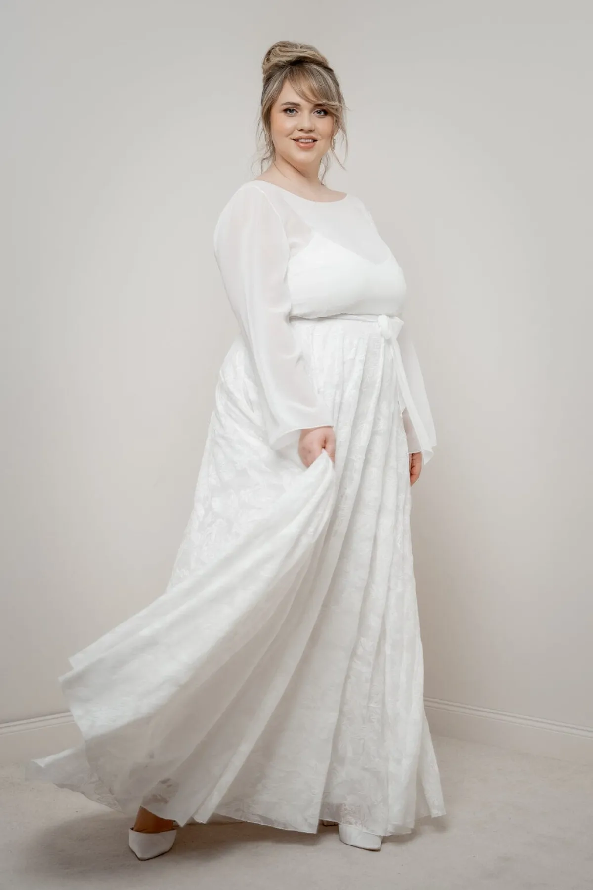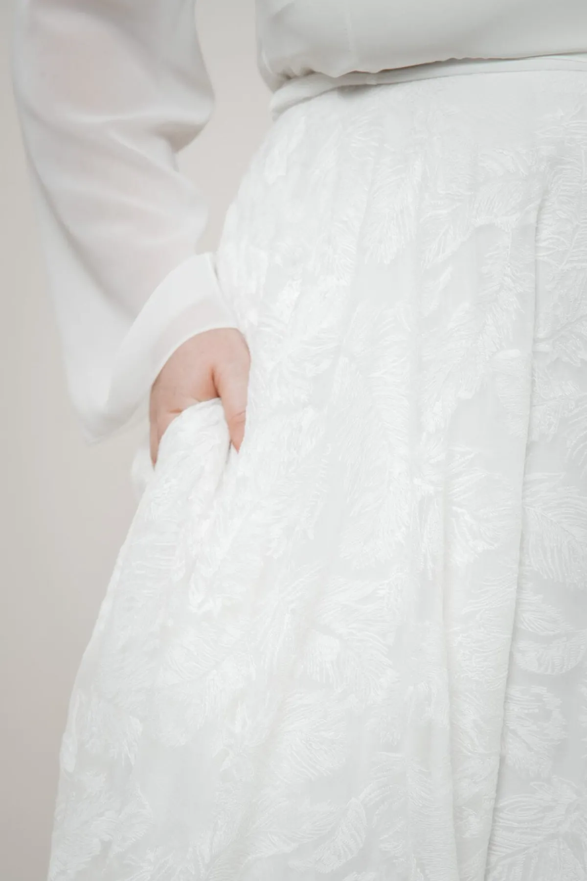 Es müssen nicht immer Blüten oder Perlen sein: Gillianne ist ein Braut Rock aus fließend fallendem Chiffon mit einem originellen Federmuster.