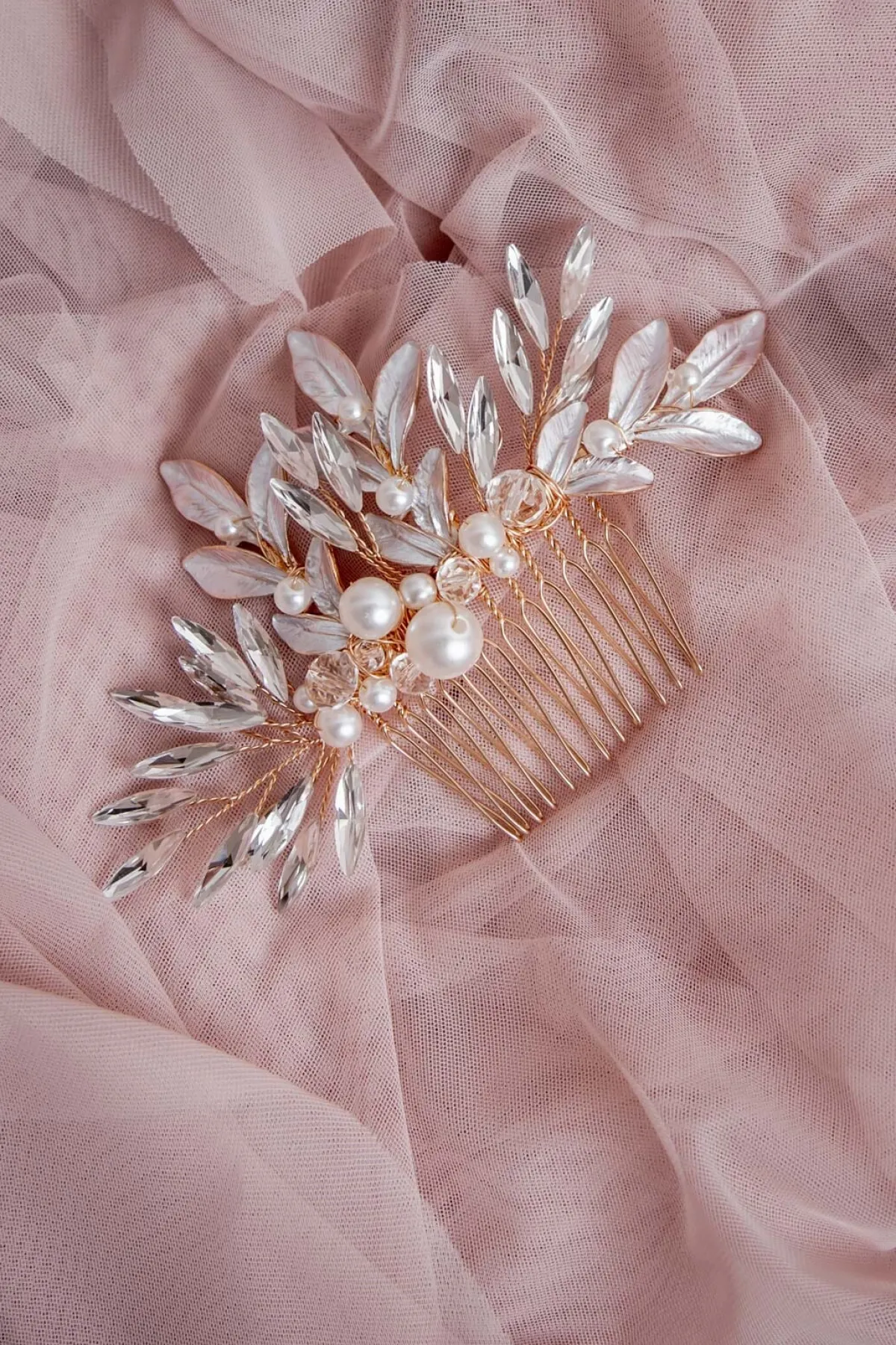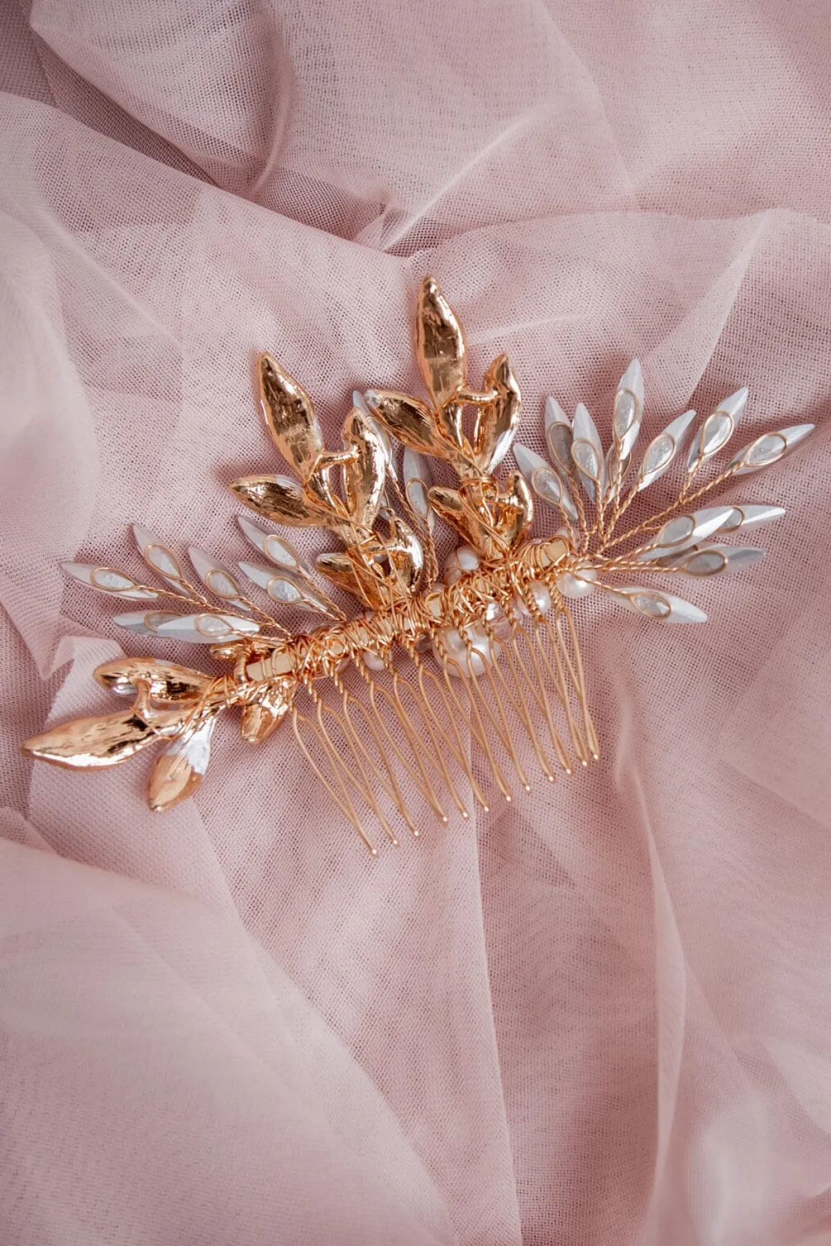 Liebevoll handgefertigter Braut Haarschmuck aus goldenem Metalldraht und Schmuckperlen, die mit glamourösen Blättern um die Wette funkeln. Der Haarkamm lässt sich unkompliziert am Hinterkopf im Dutt feststecken und passt zu einer Vielzahl von Outfits.