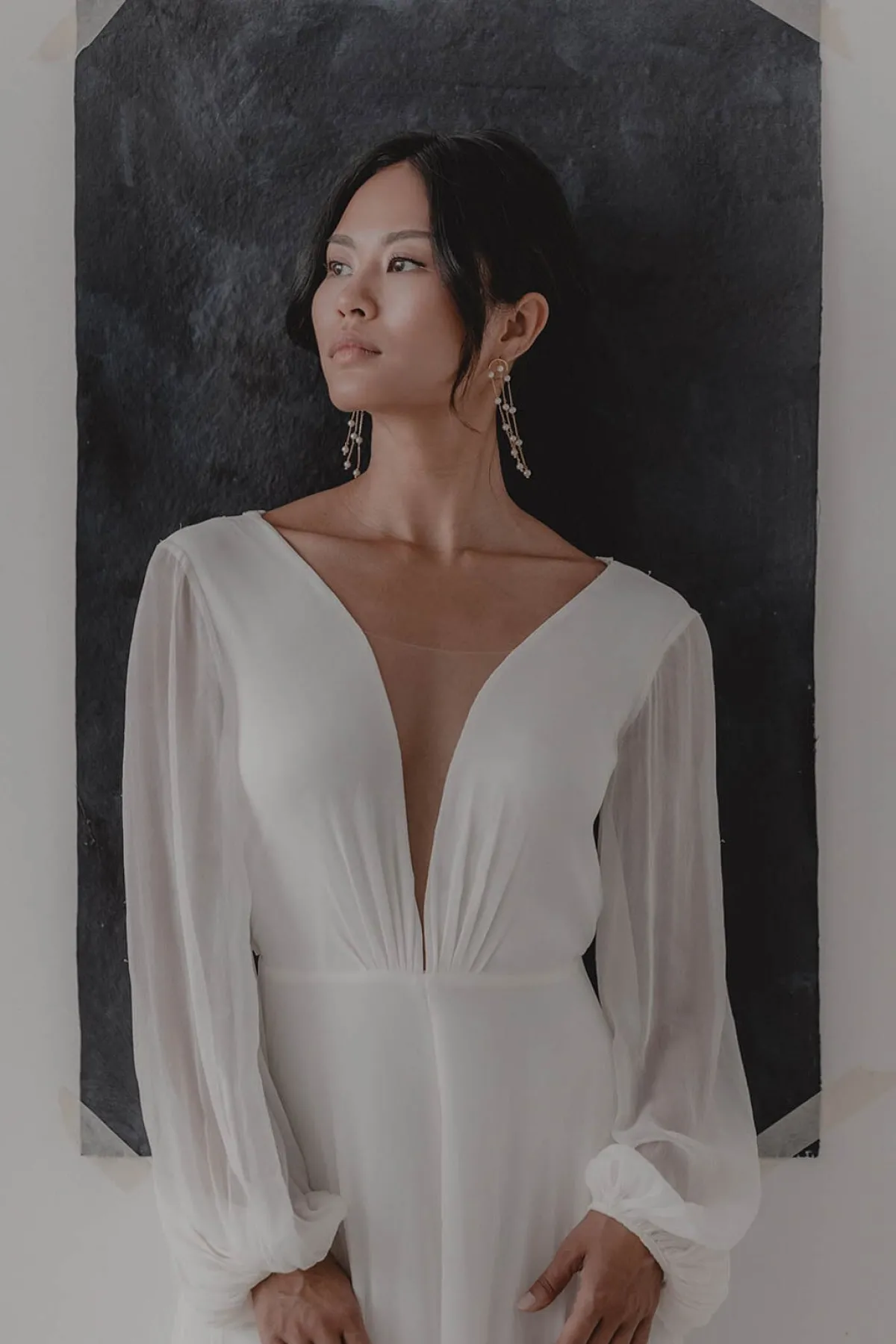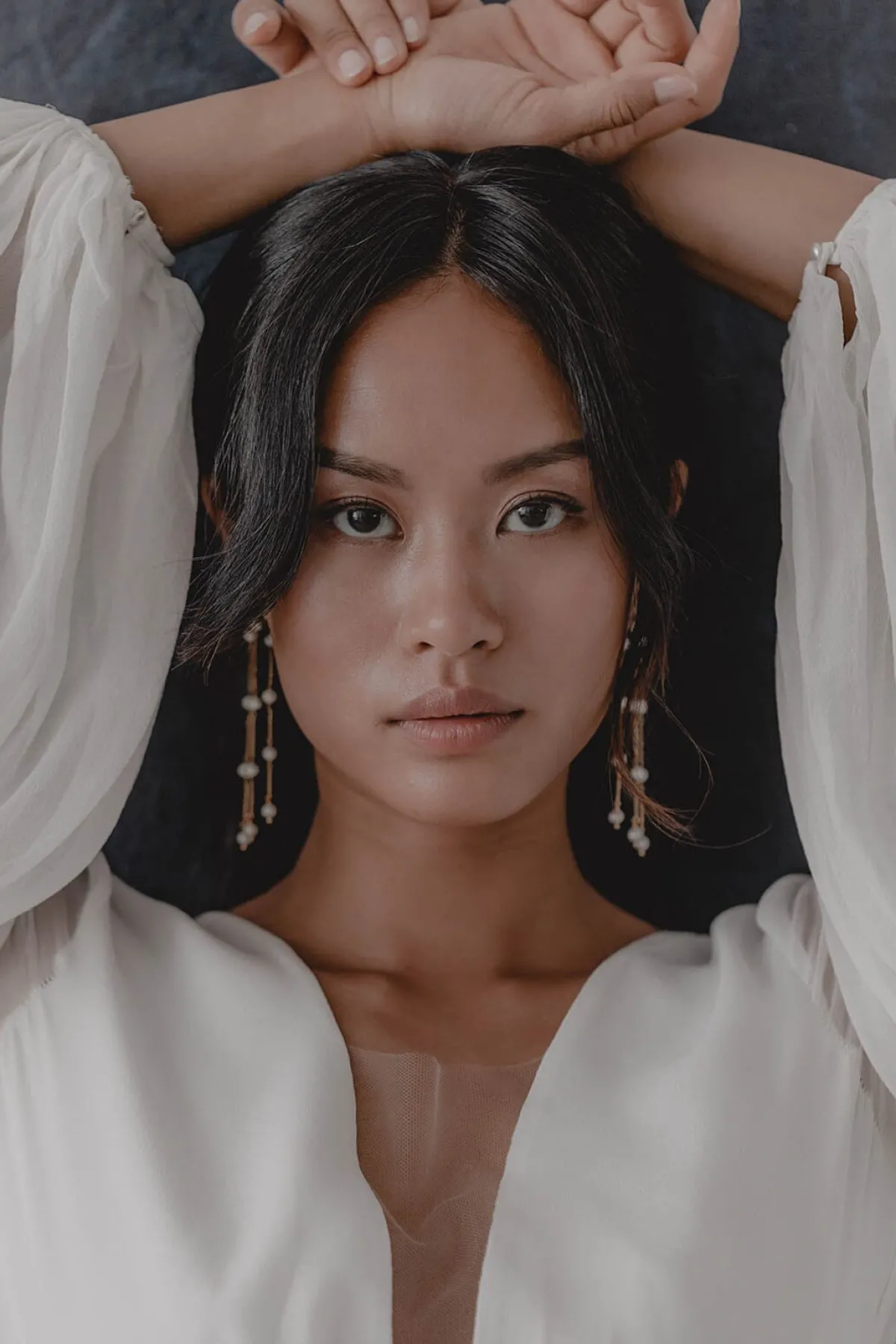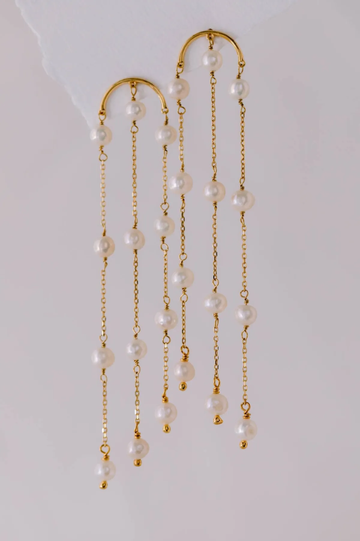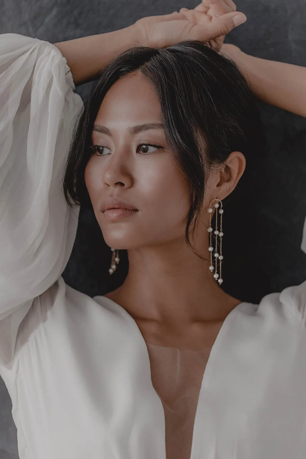 Glamouröse Statement Pieces für die Hochzeit. Die Eliza-Ohrringe verbinden zeitlose Süßwasserperlen mit modernem Design: auf halbrunde Ohrstecker folgen lange, diamantisierte Kettenstränge, versehen mit vielen schimmernden Perlen. Glamouröse Ohrhänger, die deinen eleganten Brautlook unterstreichen.