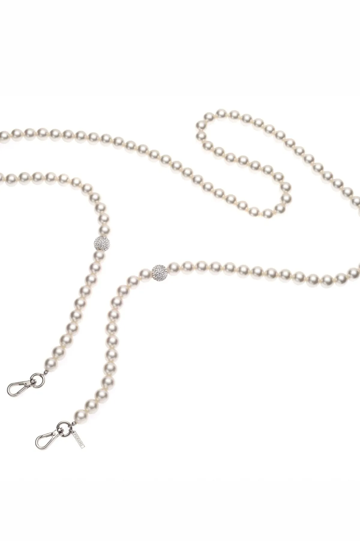 Extravagantes Accessoire mit luxuriösem Touch – nicht nur zur Hochzeit! Die lange Handykette ist verziert mit schimmernden Kunstperlen in Ivory und zwei funkelnden Strasskugeln. Durch die großen Ösen lässt sich die Handykette problemlos an der Handyhülle fixieren.
