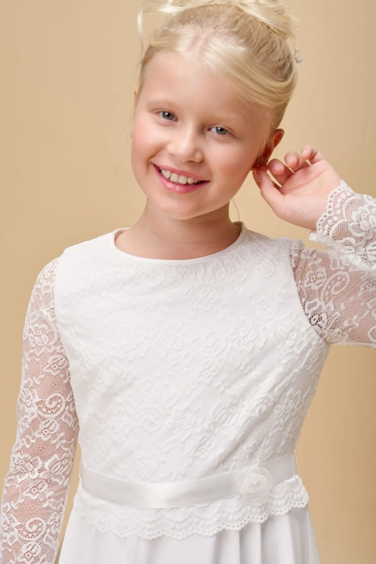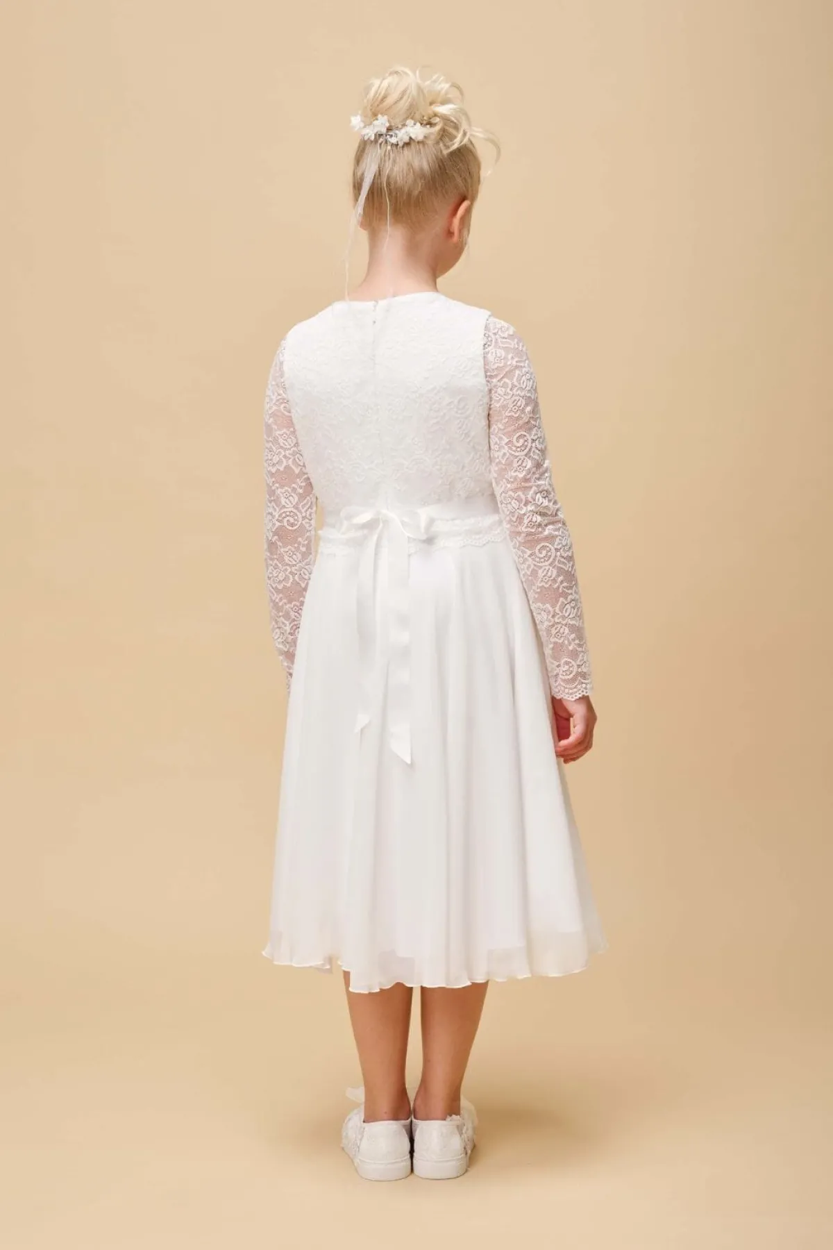 Langarm-Mädchenkleid in Ivory mit wadenlangem Rock