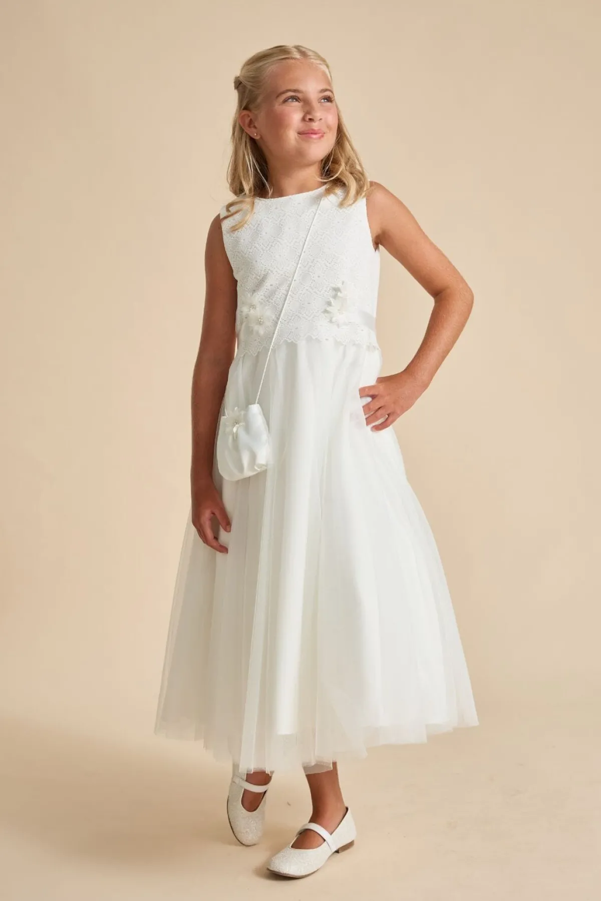 Schön schwingendes, ärmelloses Kommunionkleid in 7/8-Länge mit glitzerunterlegtem zarten Spitzenoberteil und blütenverziertem Satinband zur Weitenregulierung für eine bequeme Passform.