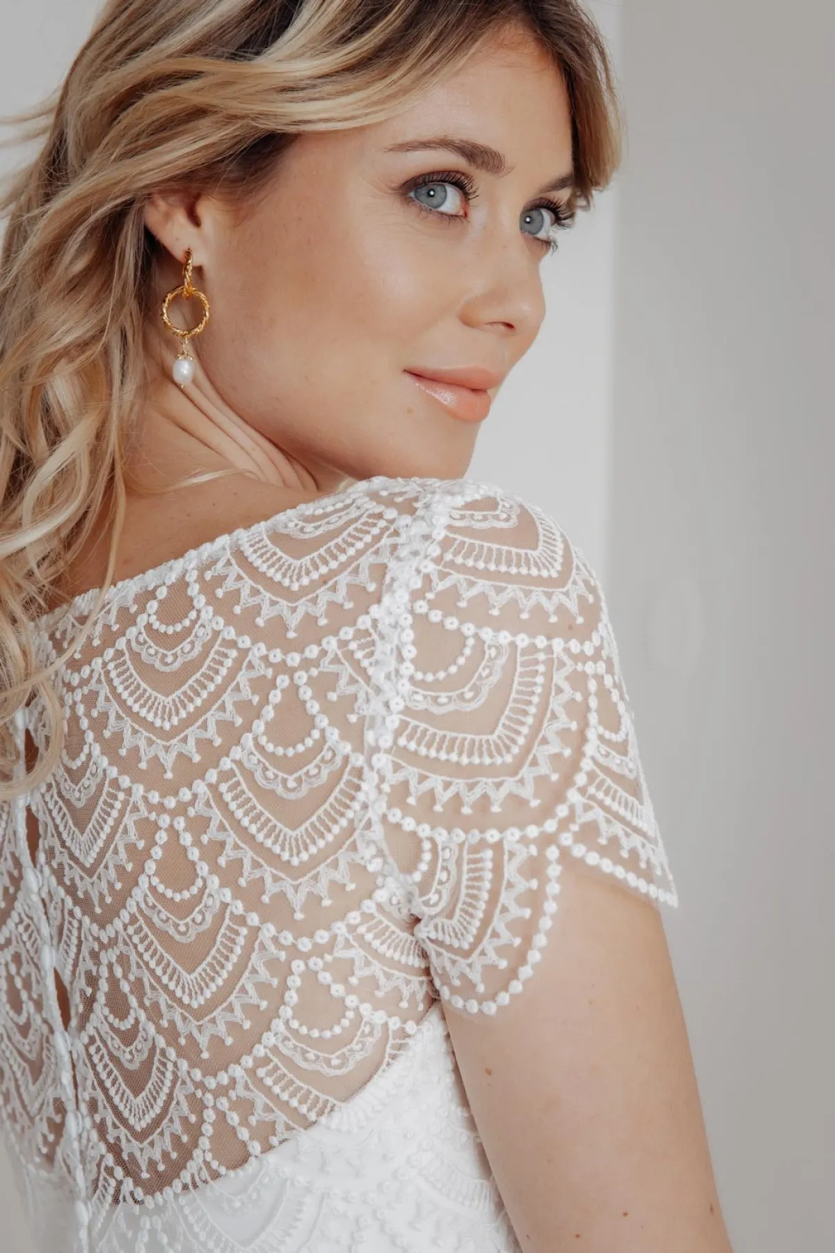 Schön geschwungene Bogenkanten und kurze Ärmel sind weitere charmante Details sowie die Knopfleiste im Rücken für eine lässig-elegante Jäckchen-Optik, die gerade bei einer Sommerhochzeit unbekümmerte Leichtigkeit versprüht.