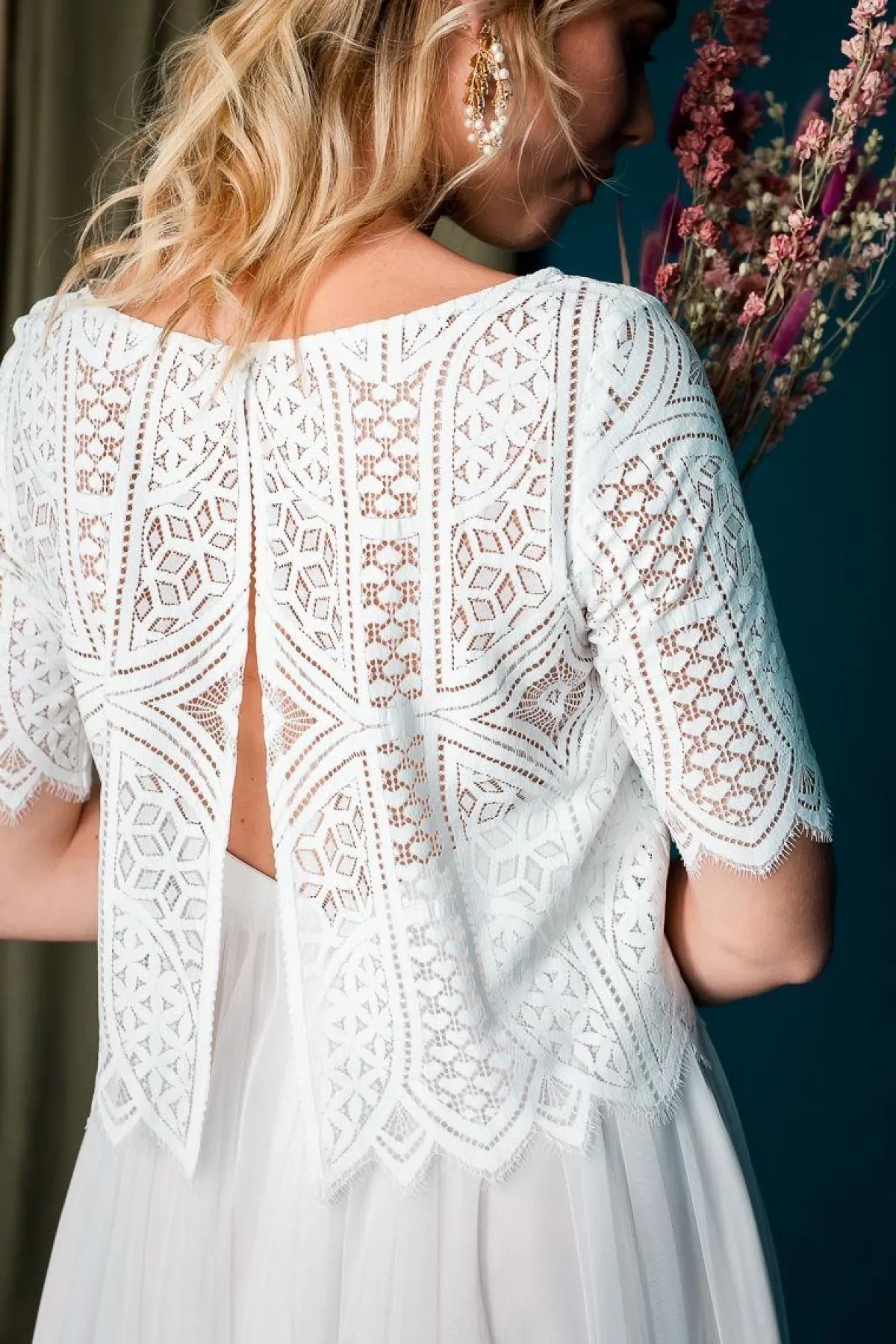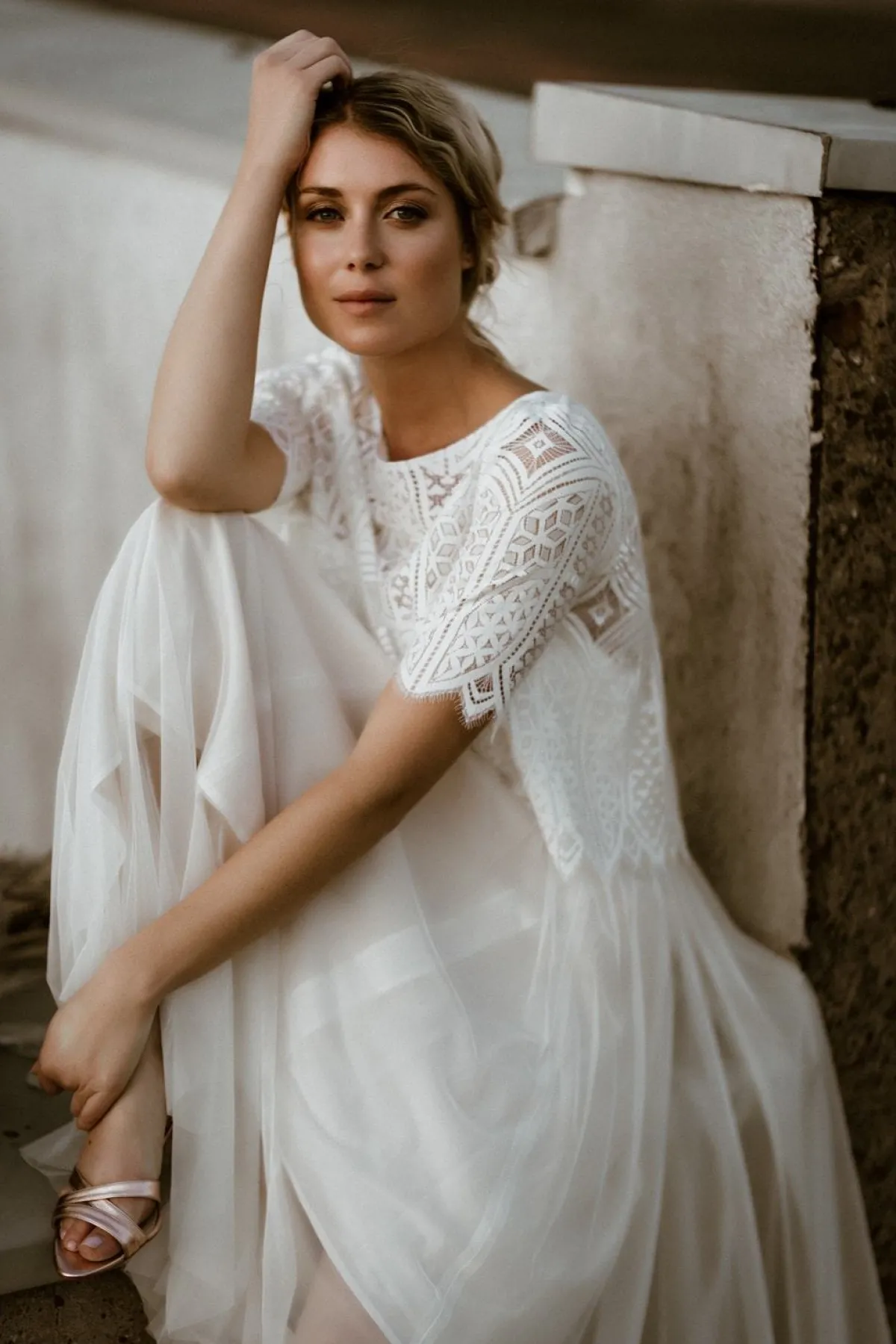 Calista in Ivory weiß wie ihre Vorgängerinnen Louise Ivory und June zu begeistern: Das dekorative Muster aus floralen und grafischen Elementen aus fester Spitze macht auch mit kurzen Ärmeln eine gute Figur.