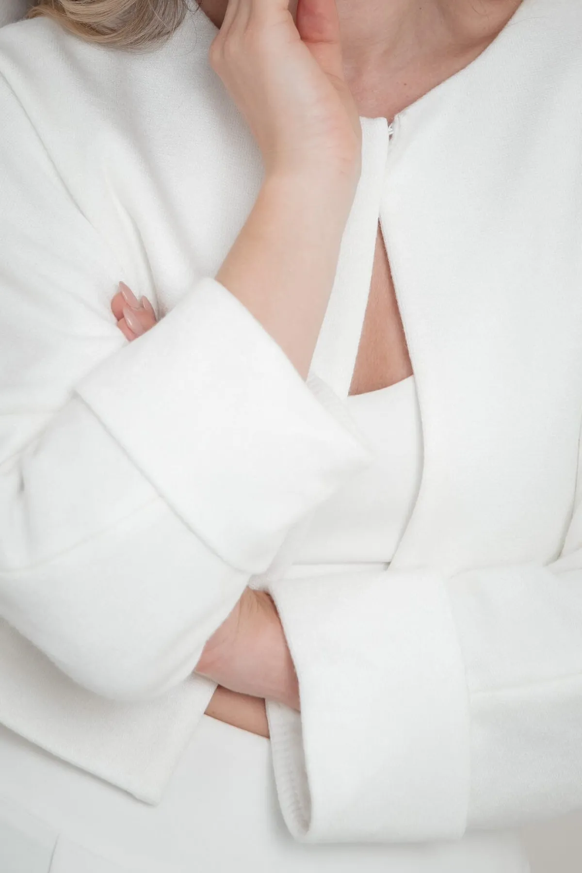 Puristischer Cardigan aus weichem Strickmix mit Kaschmir-Anteil für ein besonders sanftes Tragegefühl. Taillenkurzer Schnitt und minimalistisches Design, das sich problemlos zu jedem Braut Look tragen lässt.