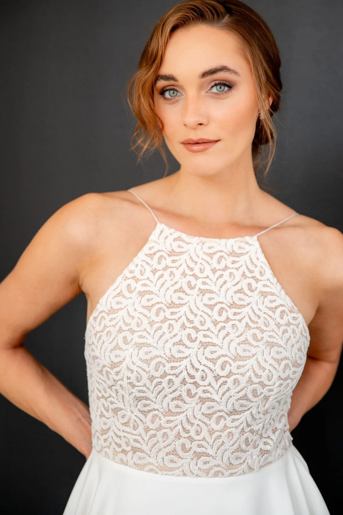 Junia ist ein Hochzeitskleid in Wadenlänge für einen romantisch-sinnlichen Look am großen Tag. Ein Oberteil mit Vintagemuster und zarten Spaghettiträgern trifft auf einen Rock aus fließend fallendem Crêpe für eine feminine Silhouette.
