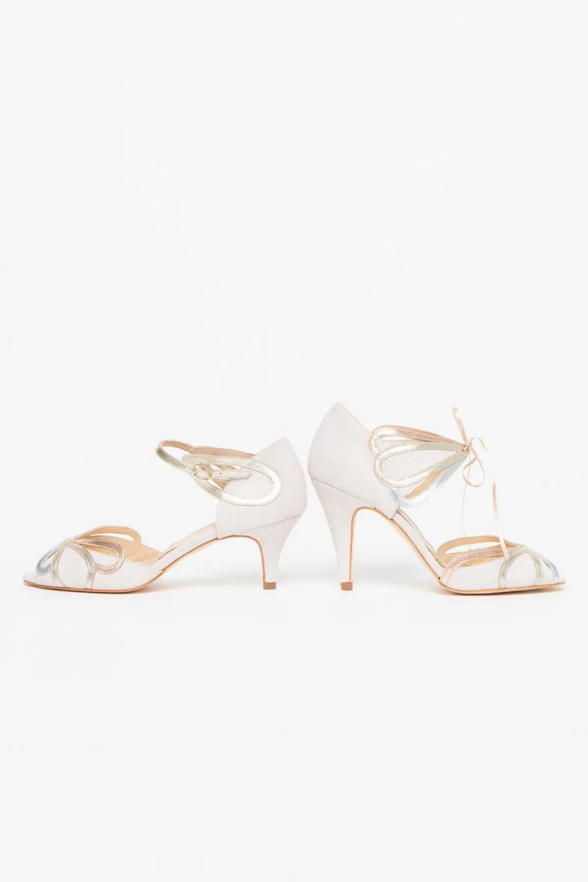 Durch eine tolle Metallic-Mix-Farbkombination wirken sie modern und stylish, greifen gleichzeitig aber klassische Art Déco Ornamente auf: die Braut Peeptoes aus Wildleder in zartem Blush werden von den typischen Cecelia-Tropfen in Gold, Silber und Roségold veredelt.
