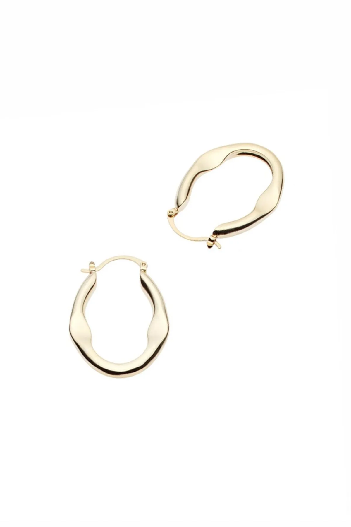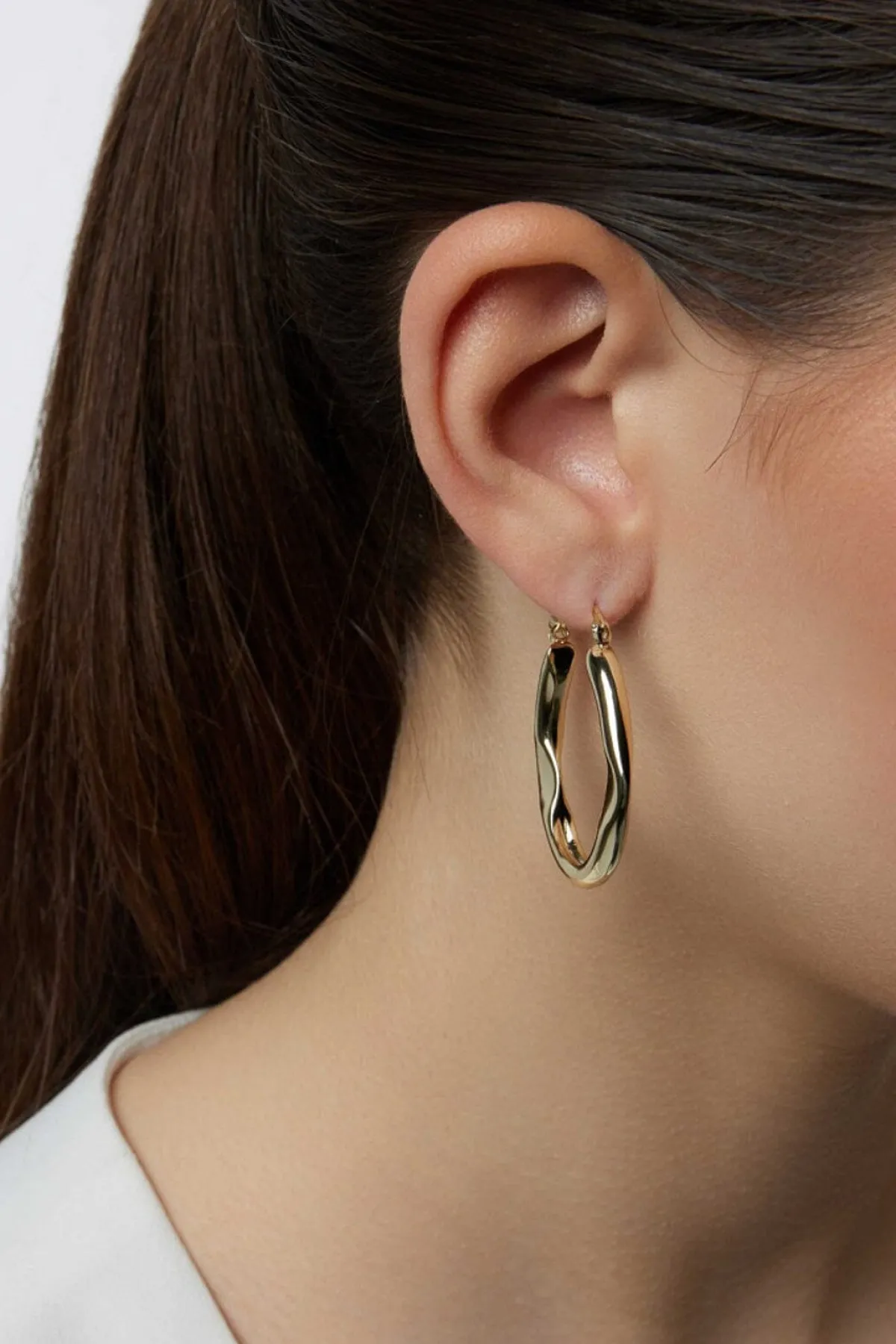 Hübsche, unebene Creolen in ovaler Form für einen extravaganten Look. Überzogen mit 14-Karat-Gold ergeben diese Schmuckstücke für ein modisches und feminines Accessoire, das sich problemlos zu jedem Outfit in Szene setzen lässt.