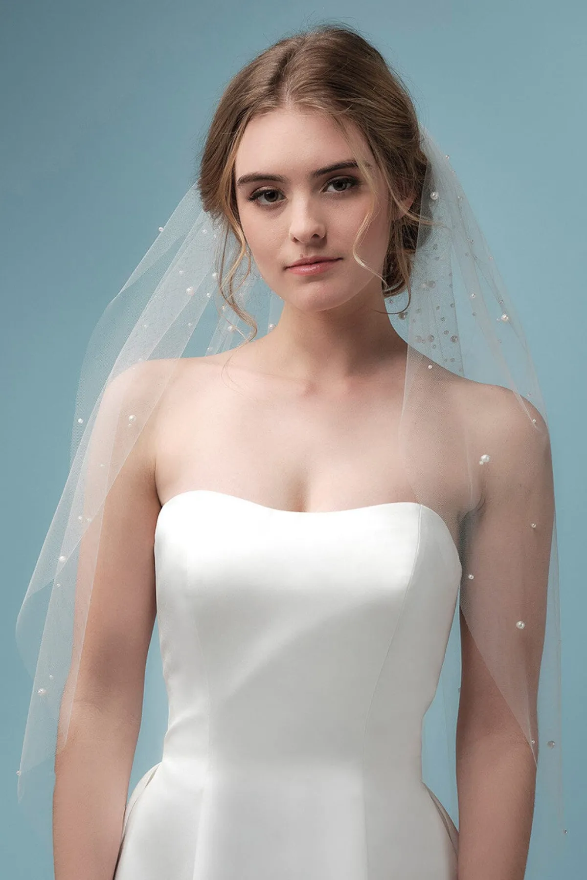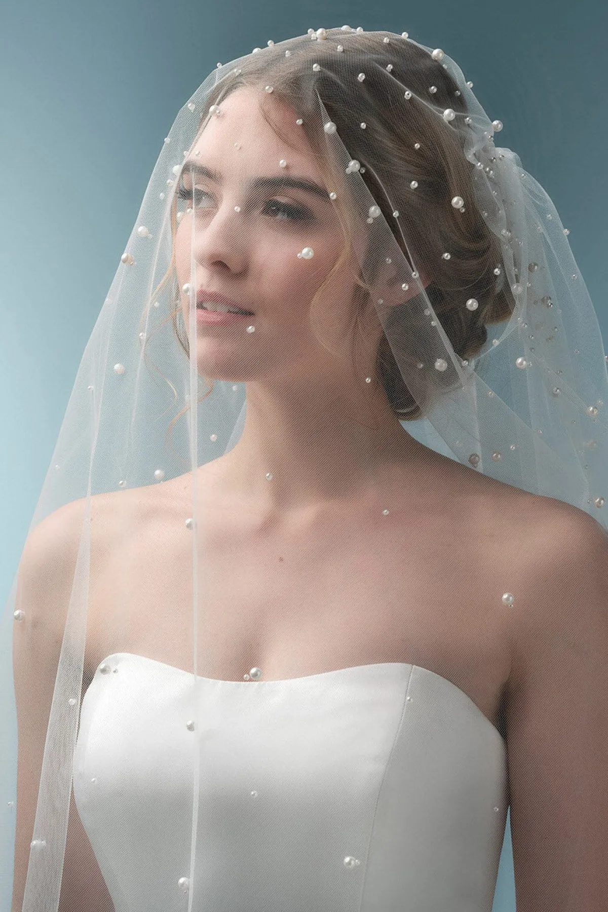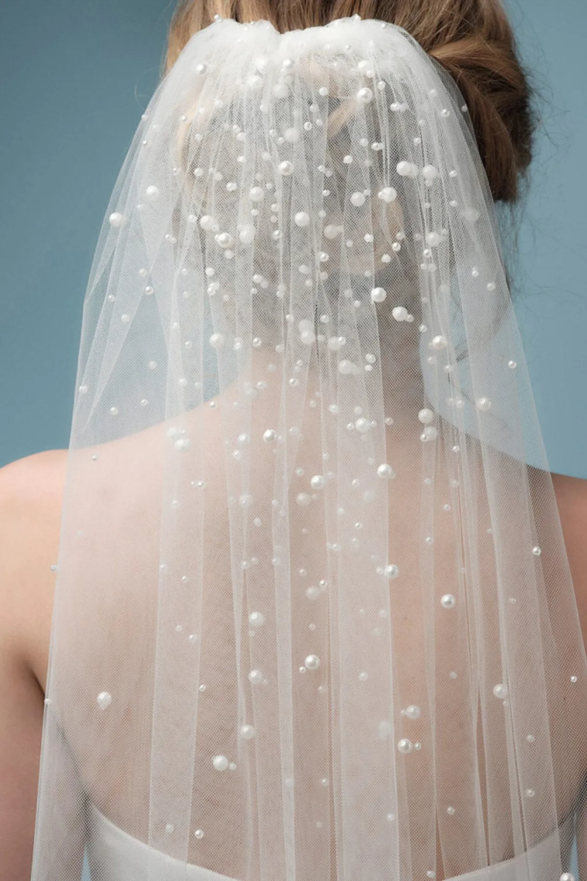 Applizierte Kunstperlen, die sich über den kompletten Schleier erstrecken, sorgen für einen romantischen und stylishen Look.