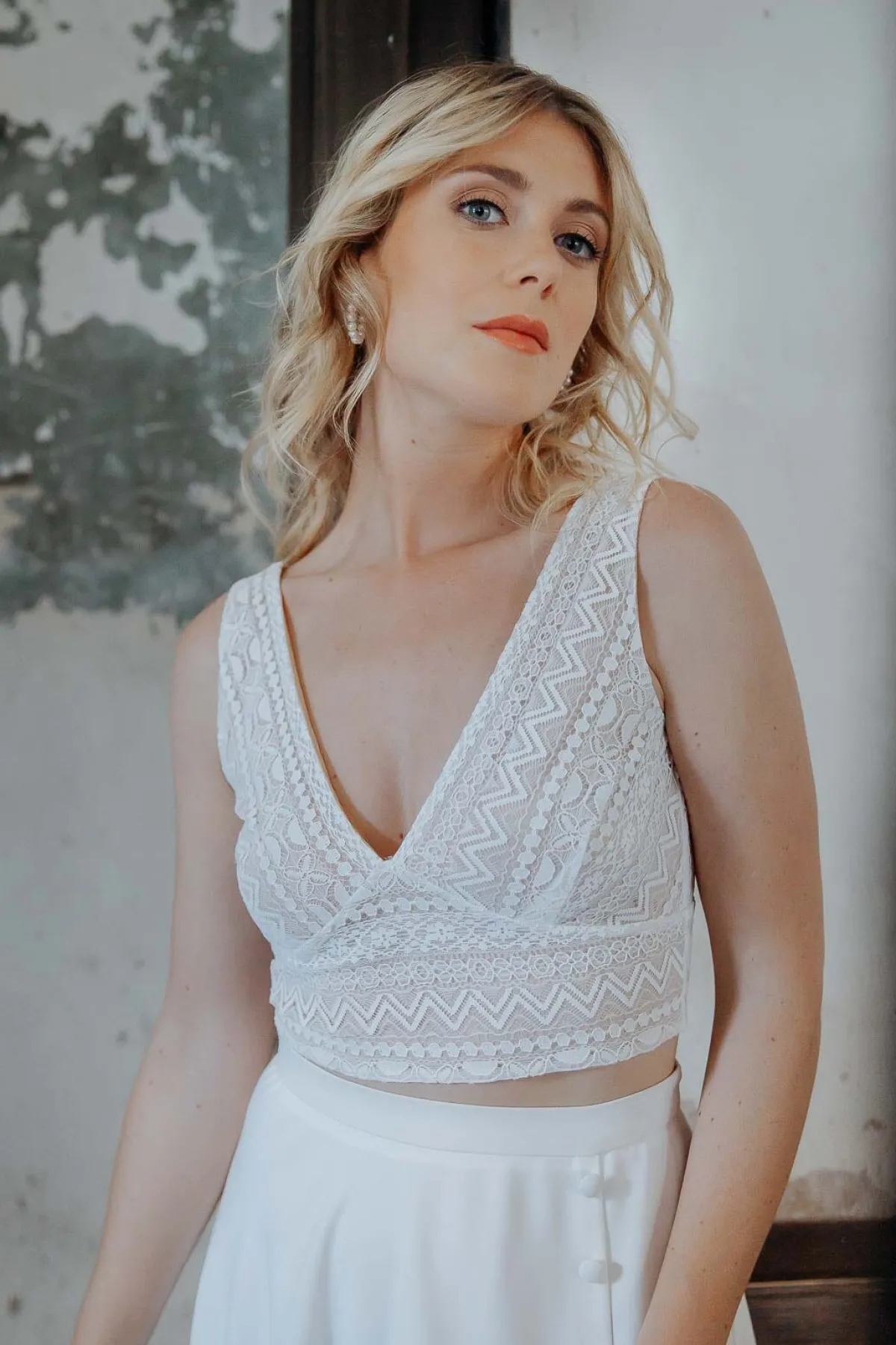 Halb-transparentes Braut Top aus Boho-Spitze mit eckigem Rückenausschnitt