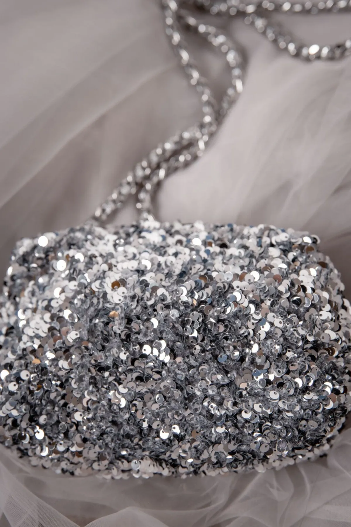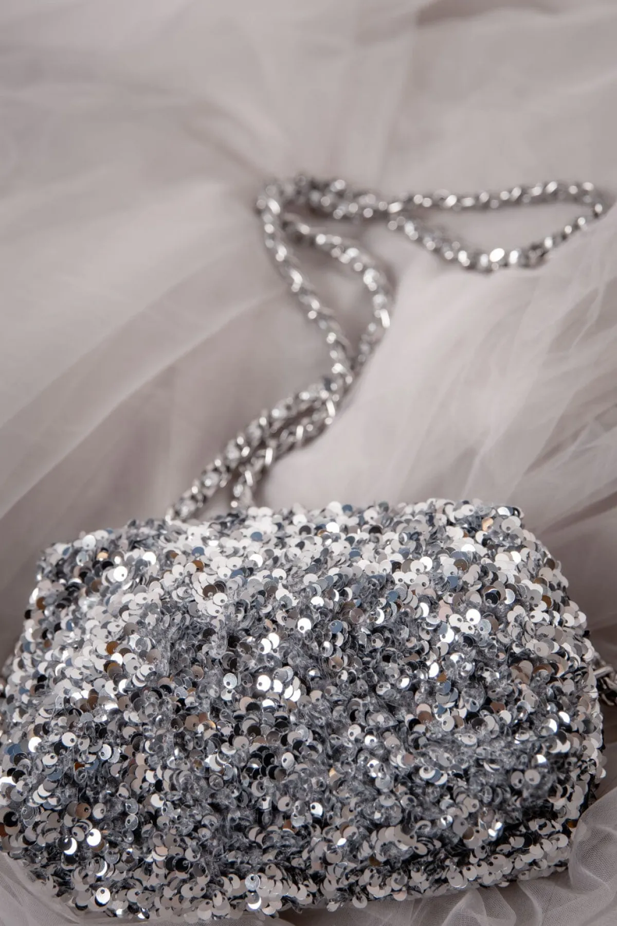 Für eine extra Portion Glamour ist die Tasche außen mit silberfarbenen Pailletten versehen. Hochwertige Details sind italienisches Rindsleder, das farblich auf die funkelnden Pailletten abgestimmt ist.