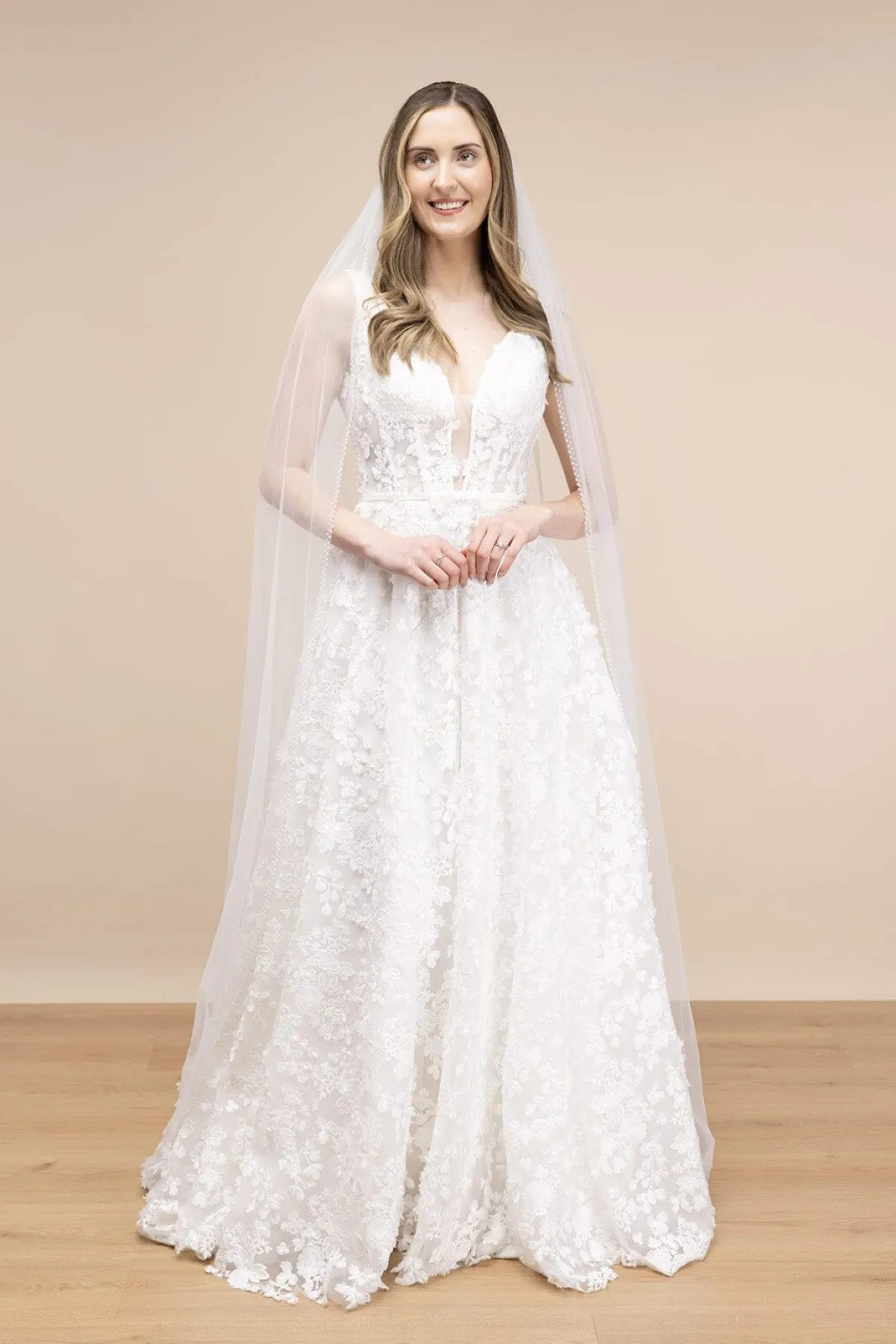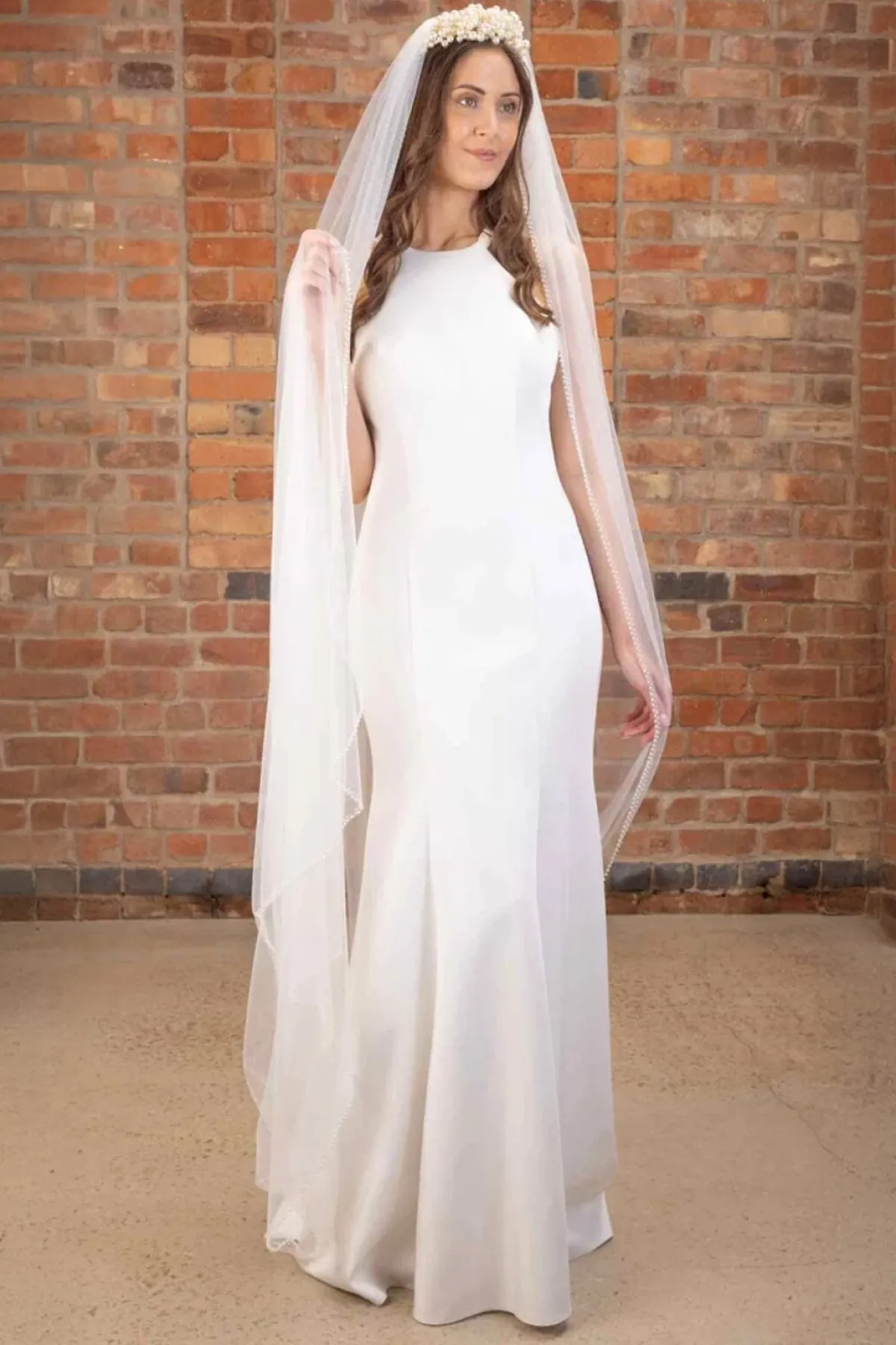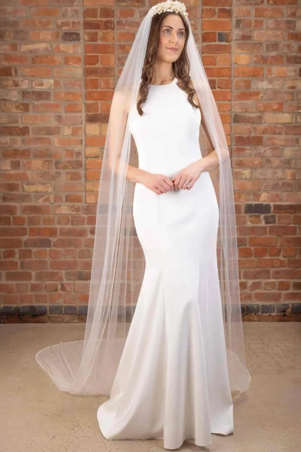 Extra-langer Schleier in Ivory mit doppelreihigem Perlenrand für einen ausgefallenen, aber dezenten Look.