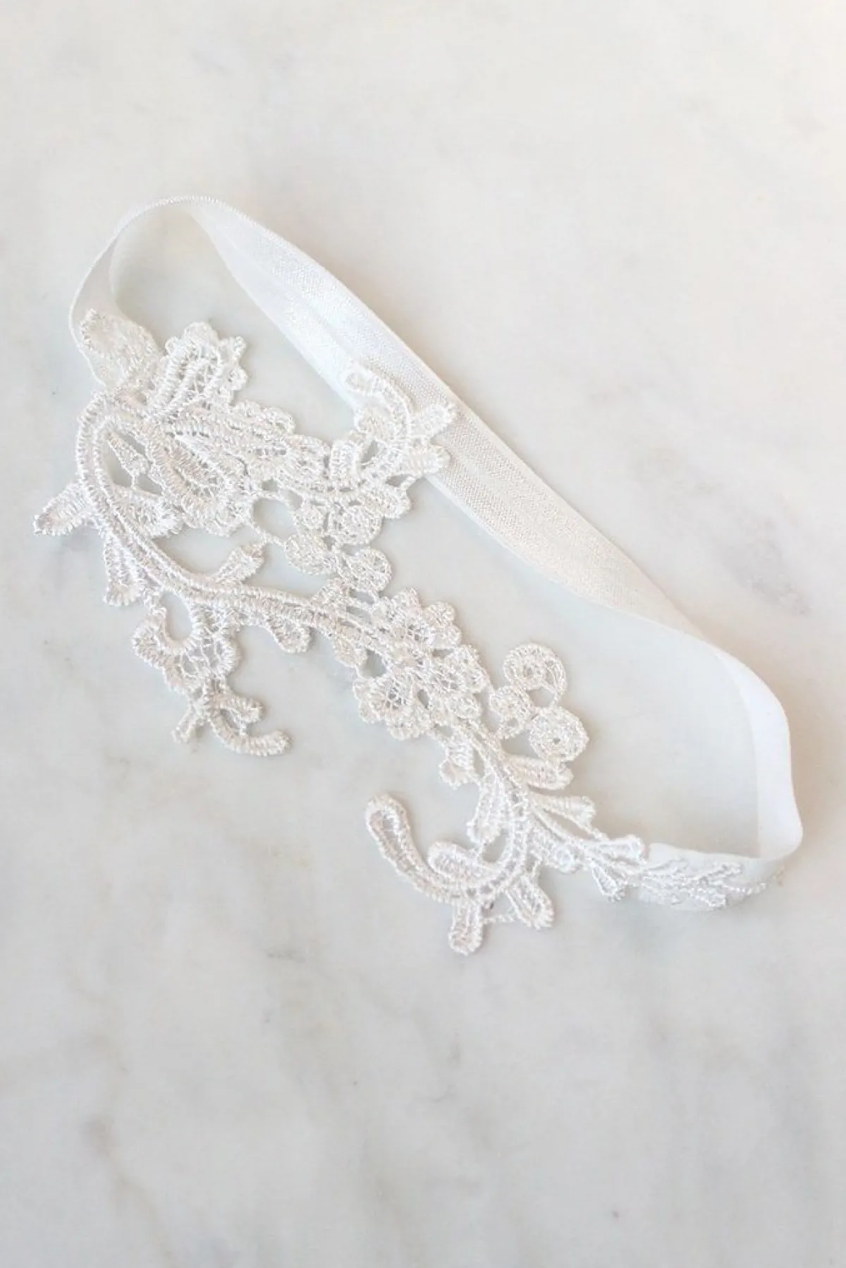 Romantisches Strumpfband mit Spitze in Ivory für einen vollendeten Brautlook. Das traditionelle Accessoire für die Hochzeit besteht aus schlichter, weicher Spitze und einem Gummiband, das sich durch das elastische Material deinem Oberschenkel anpasst. Das Strumpfband ist in klassischem Hochzeits-Weiß gehalten und passt ideal zu einem Brautkleid im Boho-Stil.