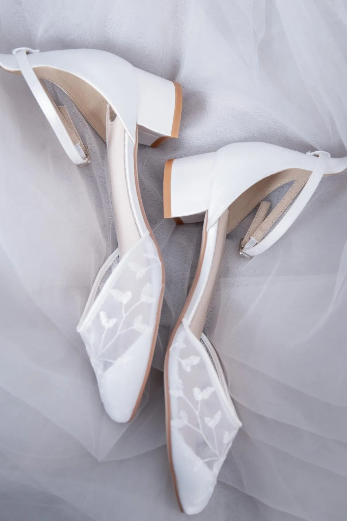 Hübsche Brautschuhe mit niedrigen Blockabsatz und spitzer Zehenkappe