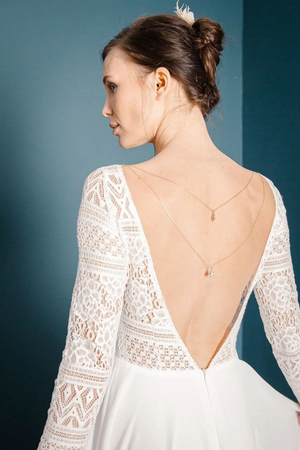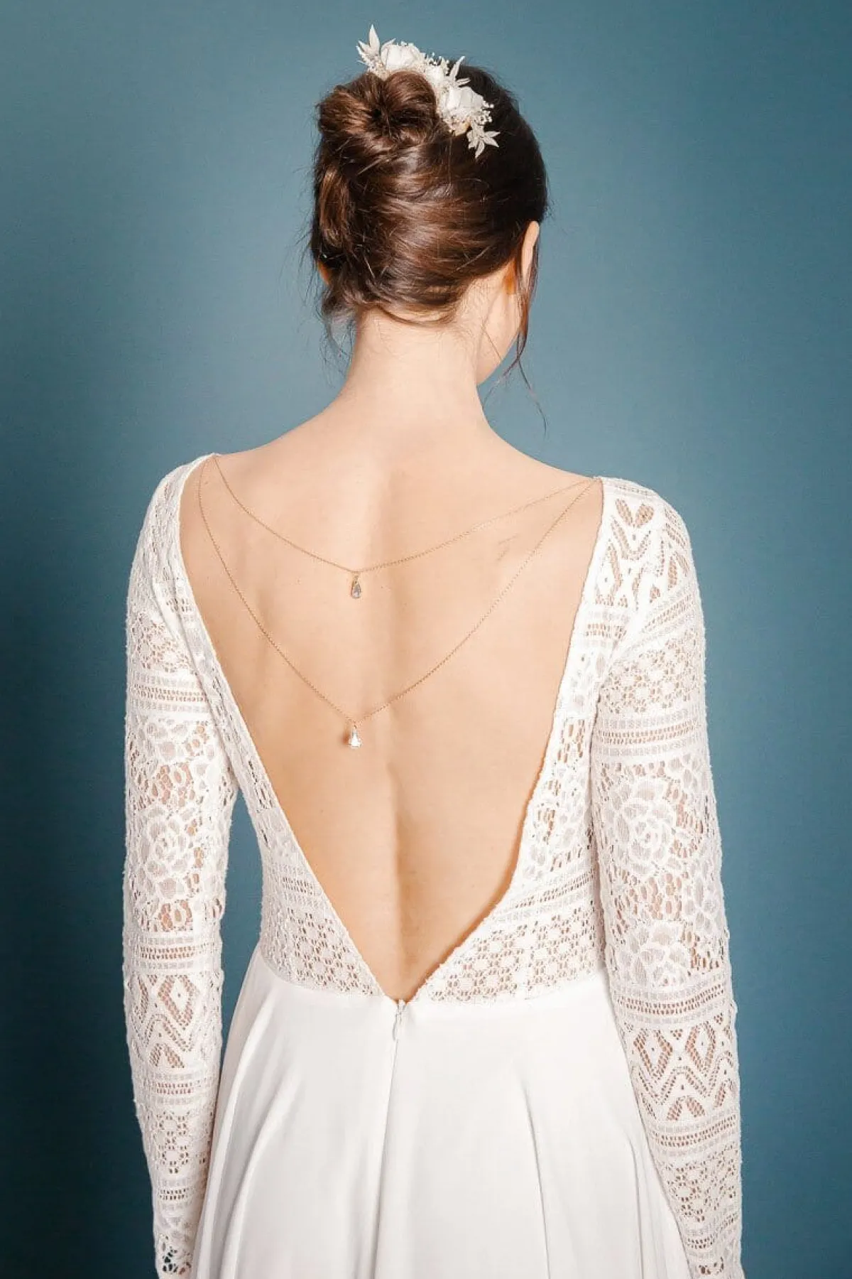 Die Rückenkette wird links und rechts mit je einem praktischen Haken am Rückenausschnitt deines Brautkleides oder deiner BH-Schlaufe befestigt, du hast also keine komplizierten, unhandlichen Verschlüsse.