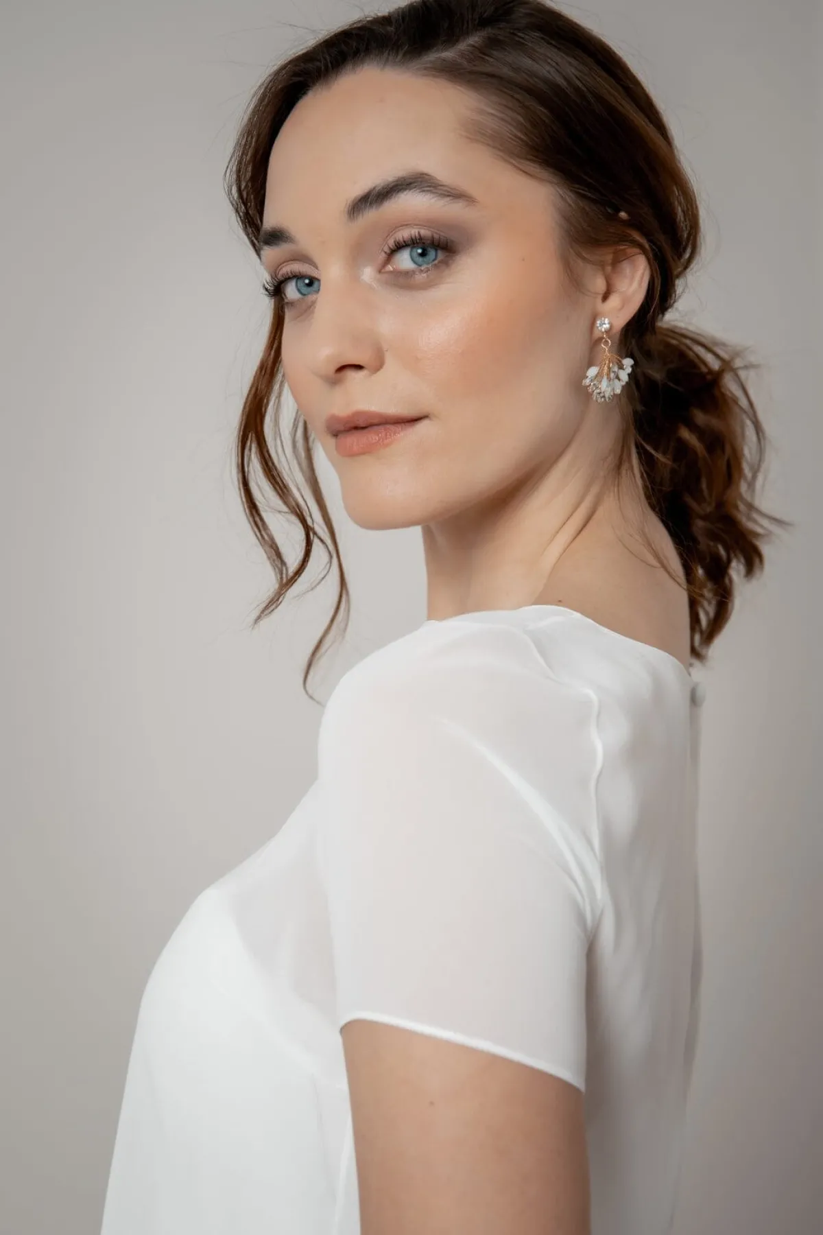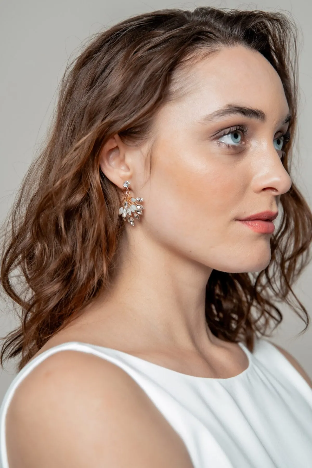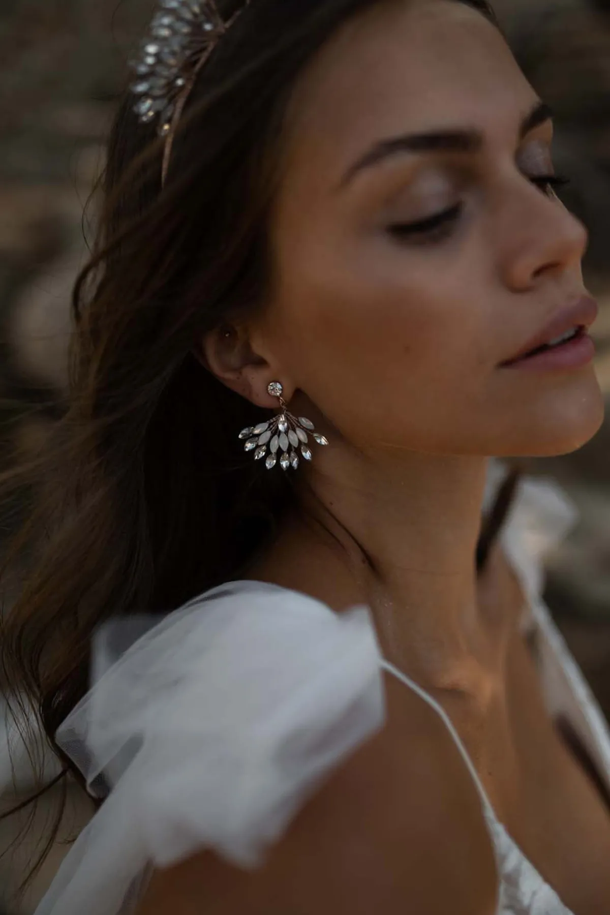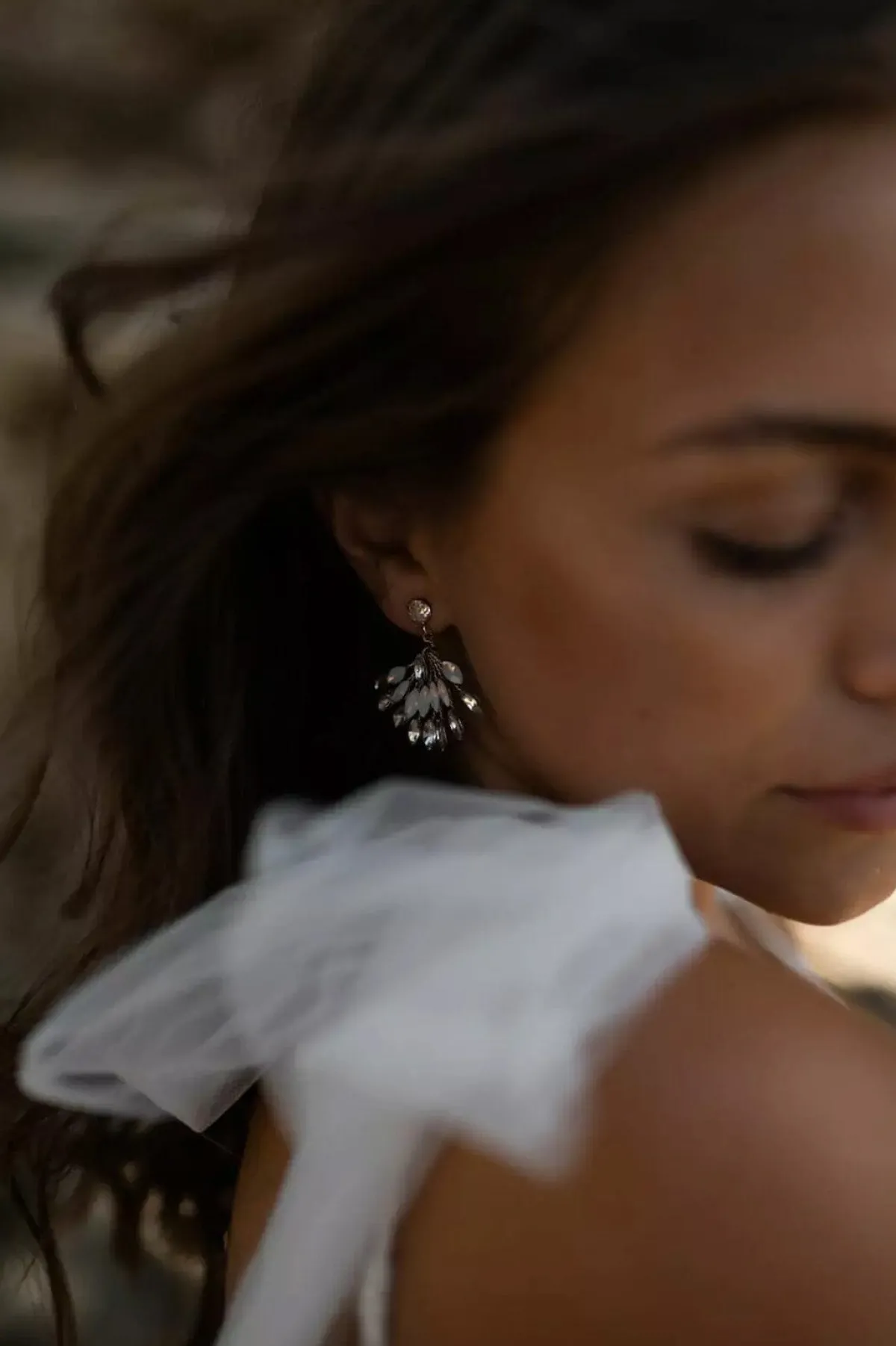Feminin, elegant und zeitlos: diese Ohrstecker bezaubern durch ihren nonchalanten, luxuriösen Look. Funkelnde Schmucksteine aus Strass und milchigem Opal, kunstvoll in Fächerform angeordnet, verleihen den Ohrsteckern ihren Charakter im Stil des Art Déco. Trage sie zu cleanen, schlichten Brautkleidern oder Outfits im Boho Style – durch ihr besonderes Design lassen sie sich vielseitig und immer wieder zu verschiedenen Anlässen kombinieren.
