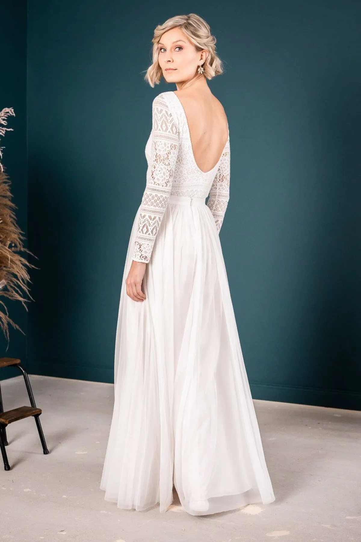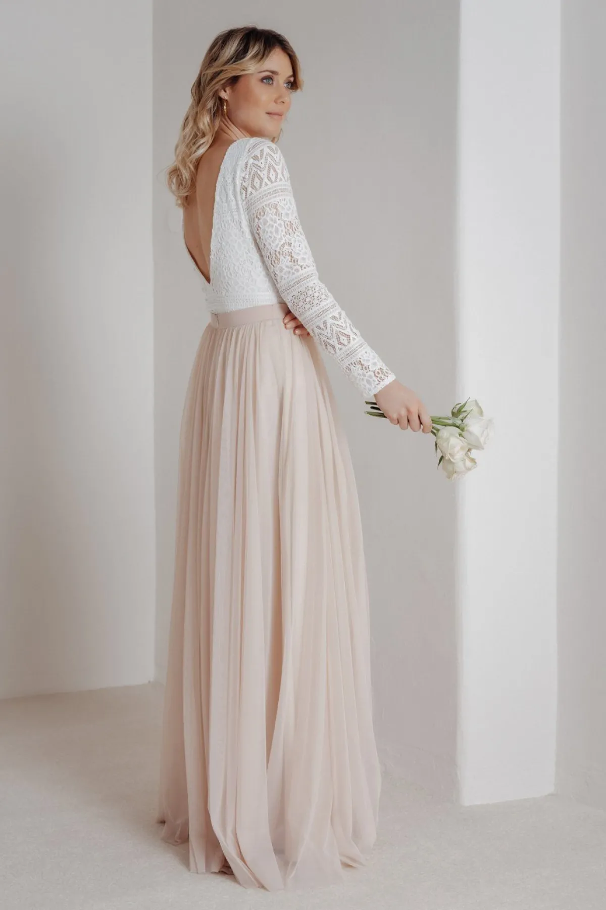 Rückenfreier Braut Body mit Spitze im Boho-Stil