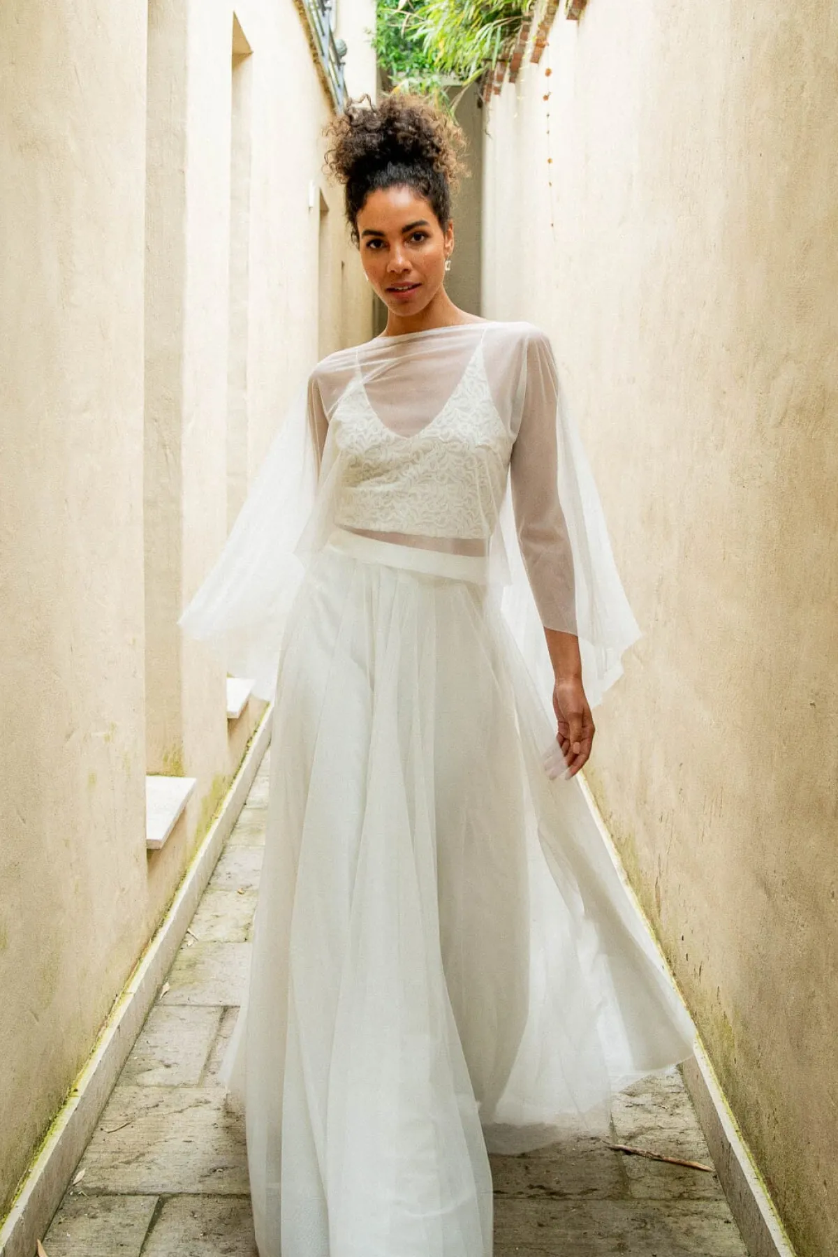 Aus transparentem, duftigem Softtüll in Ivory sorgt es mit seinem dramatischen Schnitt für eine nonchalante Note: vorne kurz, gleichzeitig im Rücken weich fließend herabfallend und in einer Schleppe endend ist dieses Cape eine schöne Alternative zum klassischen Brautschleier.