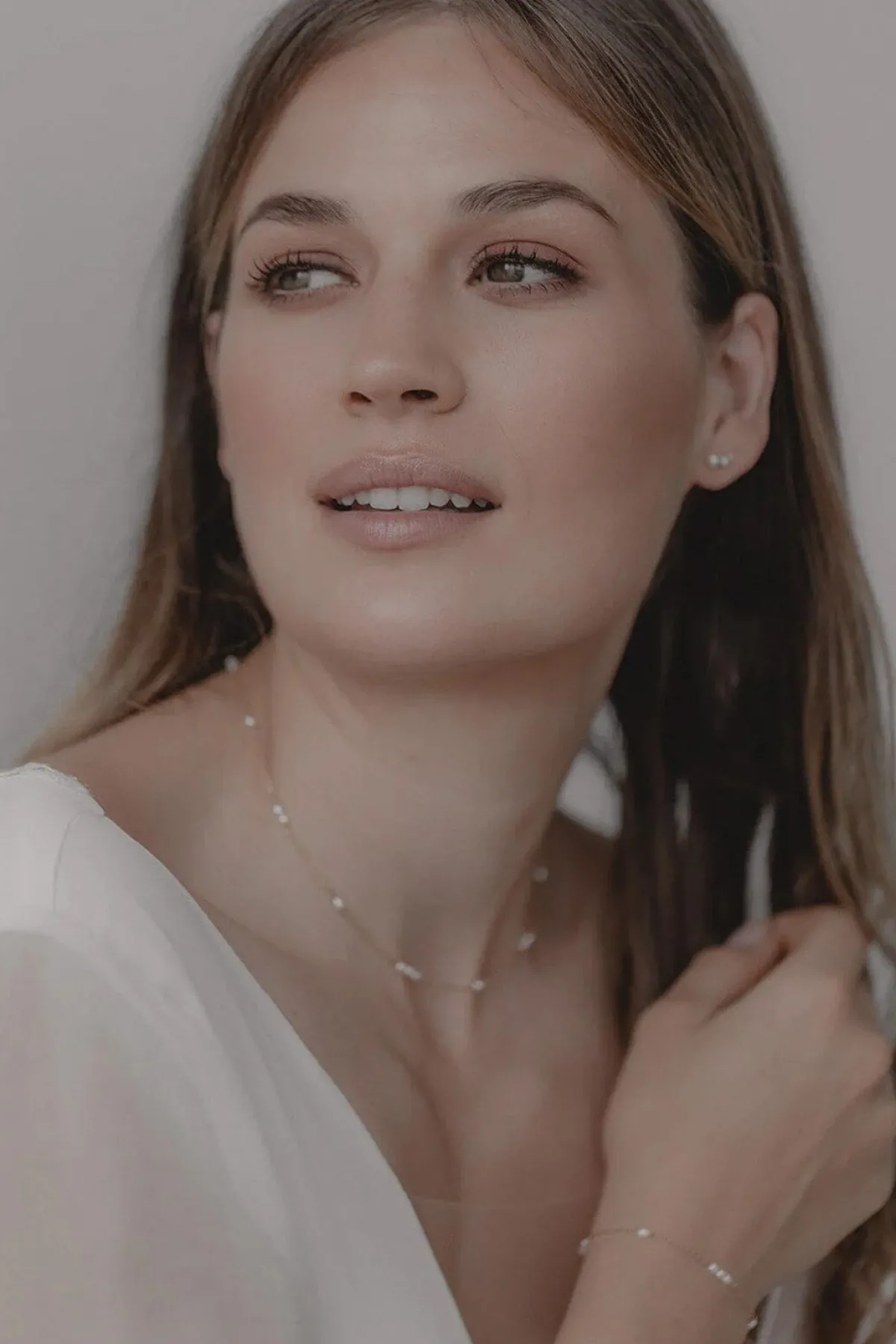 Minimalistisch und trotzdem effektvoll: die Celine-Halskette des Labels Juvelan überzeugt durch ihren unkomplizierten wie charmanten Look. Unaufgeregt und gleichzeitig feminin, lässt sie sich zu einer Vielzahl von Brautkleidern kombinieren oder als dezentes Schmuckstück im Alltag in Szene setzen.