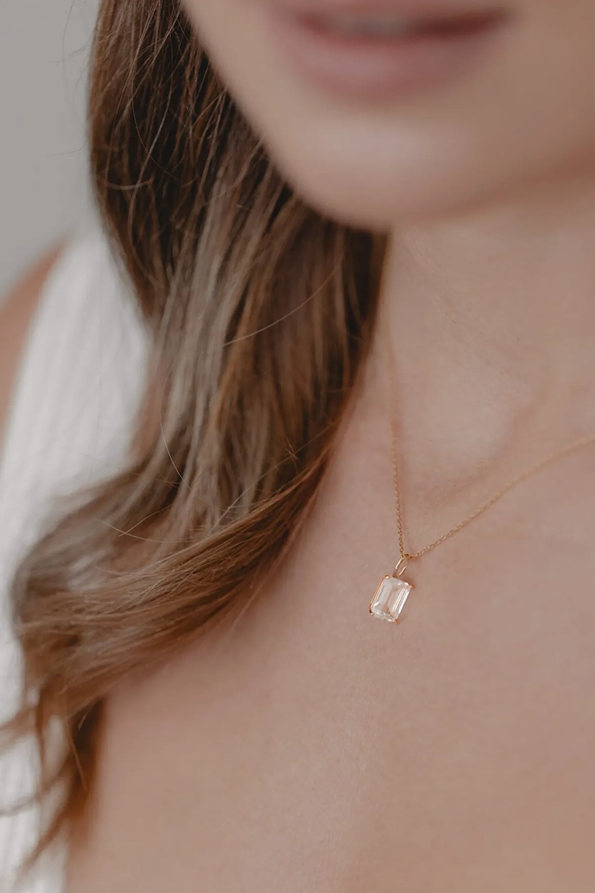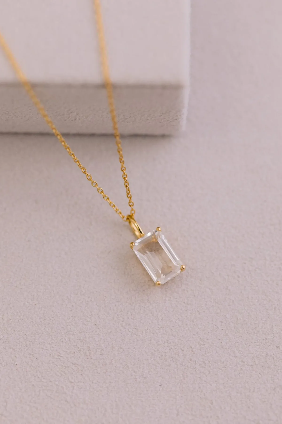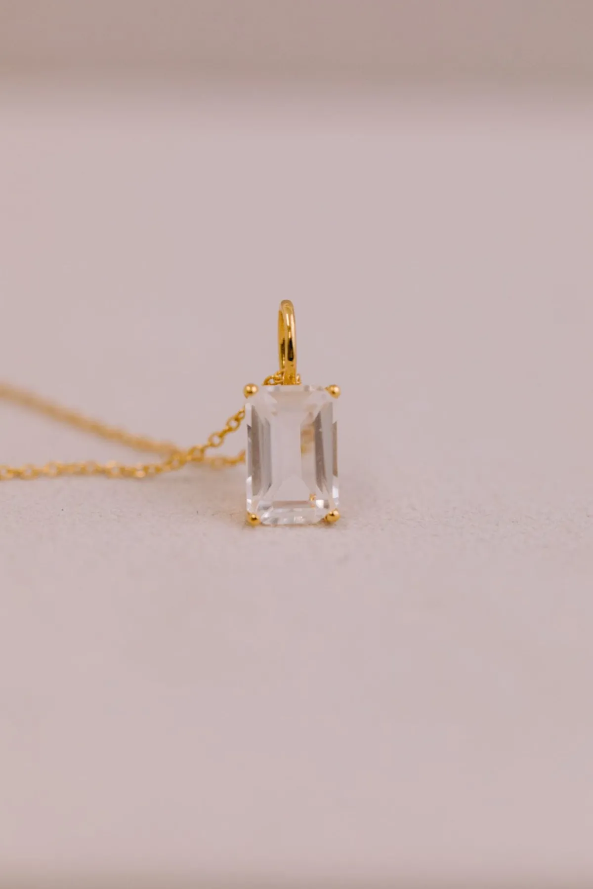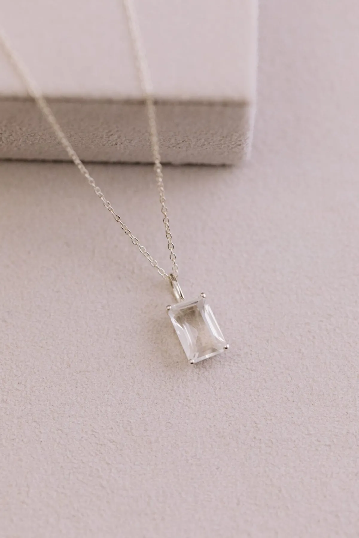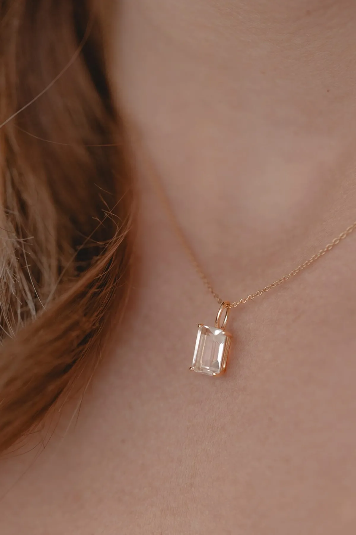 Schlichte zartgliedrige Damenhalskette, die – wahlweise in Gold oder Silber – mit einem luxuriösen Kristallanhänger aufwartet: der hübsche Kristall in außergewöhnlichem Smaragdschliff strahlt mit seiner Trägerin um die Wette!