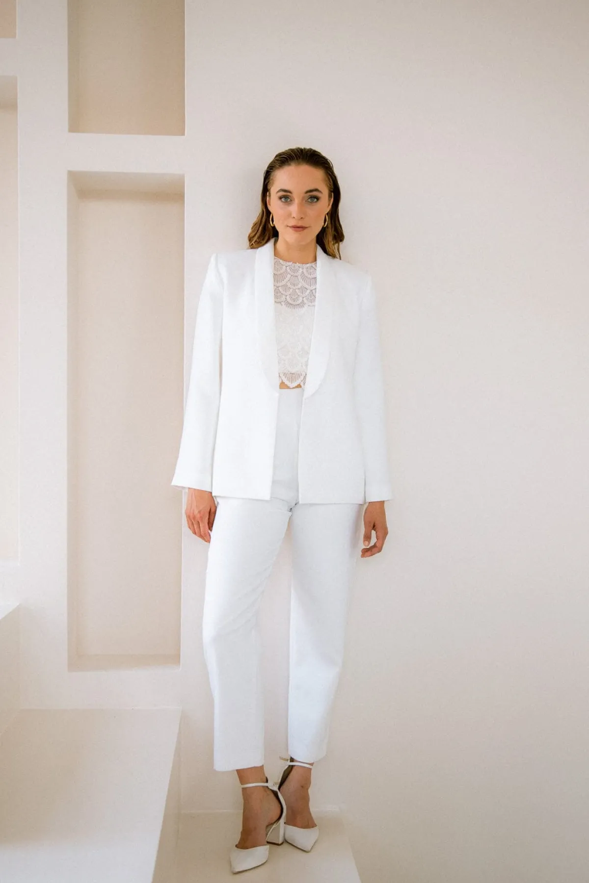 Puristische Hose aus elfenbeinfarbenem Crêpe für vielfältige Hochzeitsoutfits.