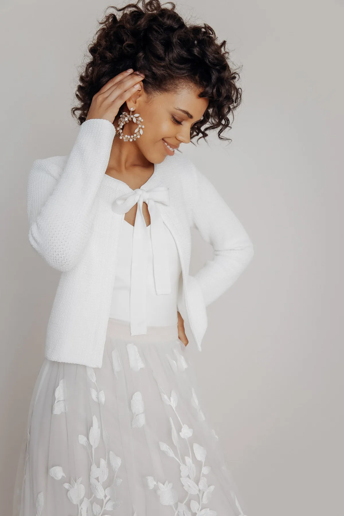 Funkelnde Ohrringe von La Chia in Form von Blütenblättern, die mit Strass und Opalsteinen verziert sind. Durch die kreisförmigen Anhänger erinnern die Ohrringe an stilisierte Lorbeerkränze aus der Zeit des Art Déco und können perfekt zu Brautkleidern im Vintage Stil getragen werden. Boho Looks und cleane, schlichte Hochzeitskleider werden aber genauso schick abgerundet.