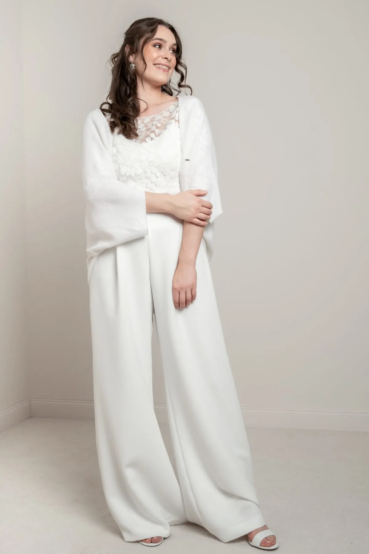 Die Jacke lässt sich mit jeder Art von Brautkleid kombinieren und passt sowohl zu legeren Standesamt- als auch zu glamourösen Brautkleidern.