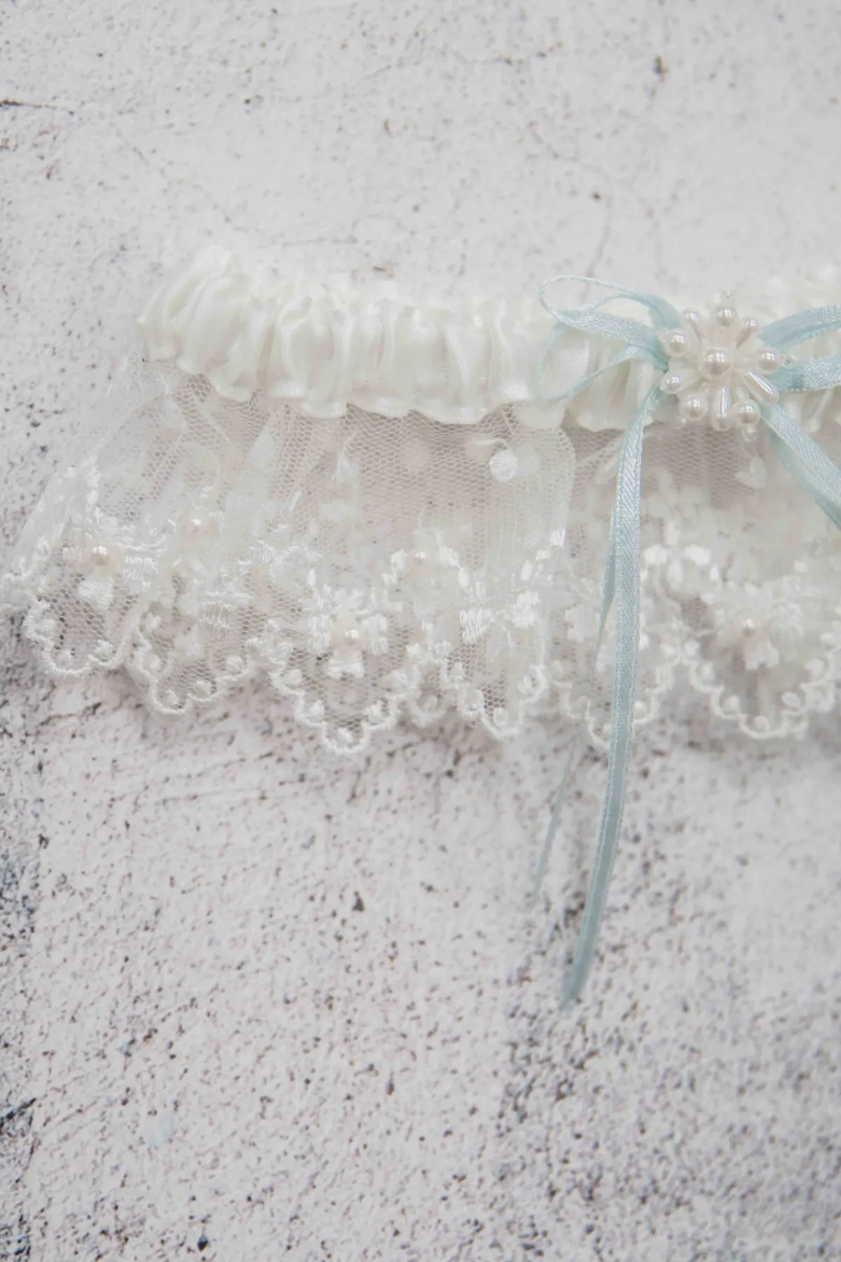 Elastisches Strumpfband mit Spitze, Kunstperlen und blauer Satinschleife