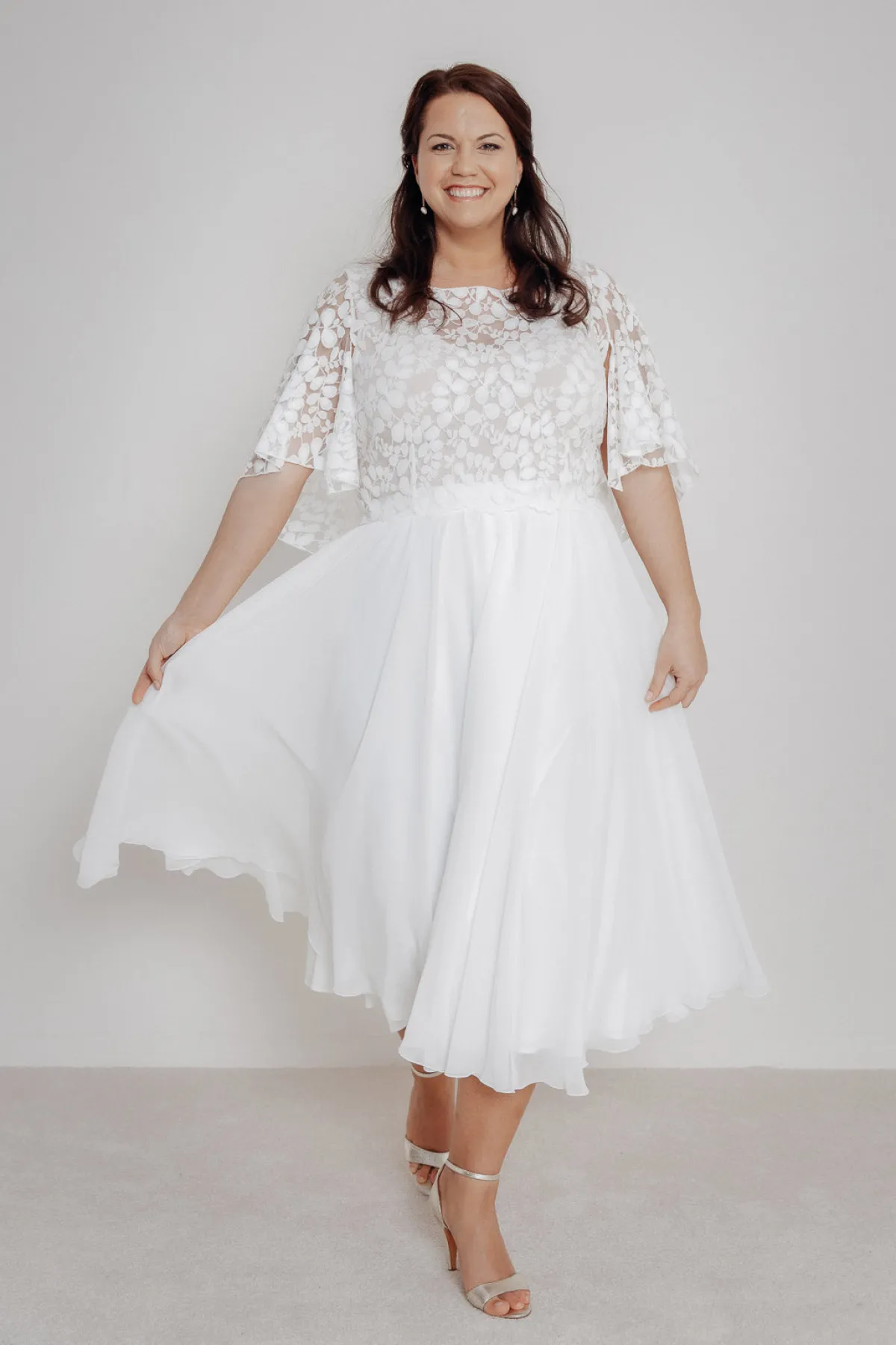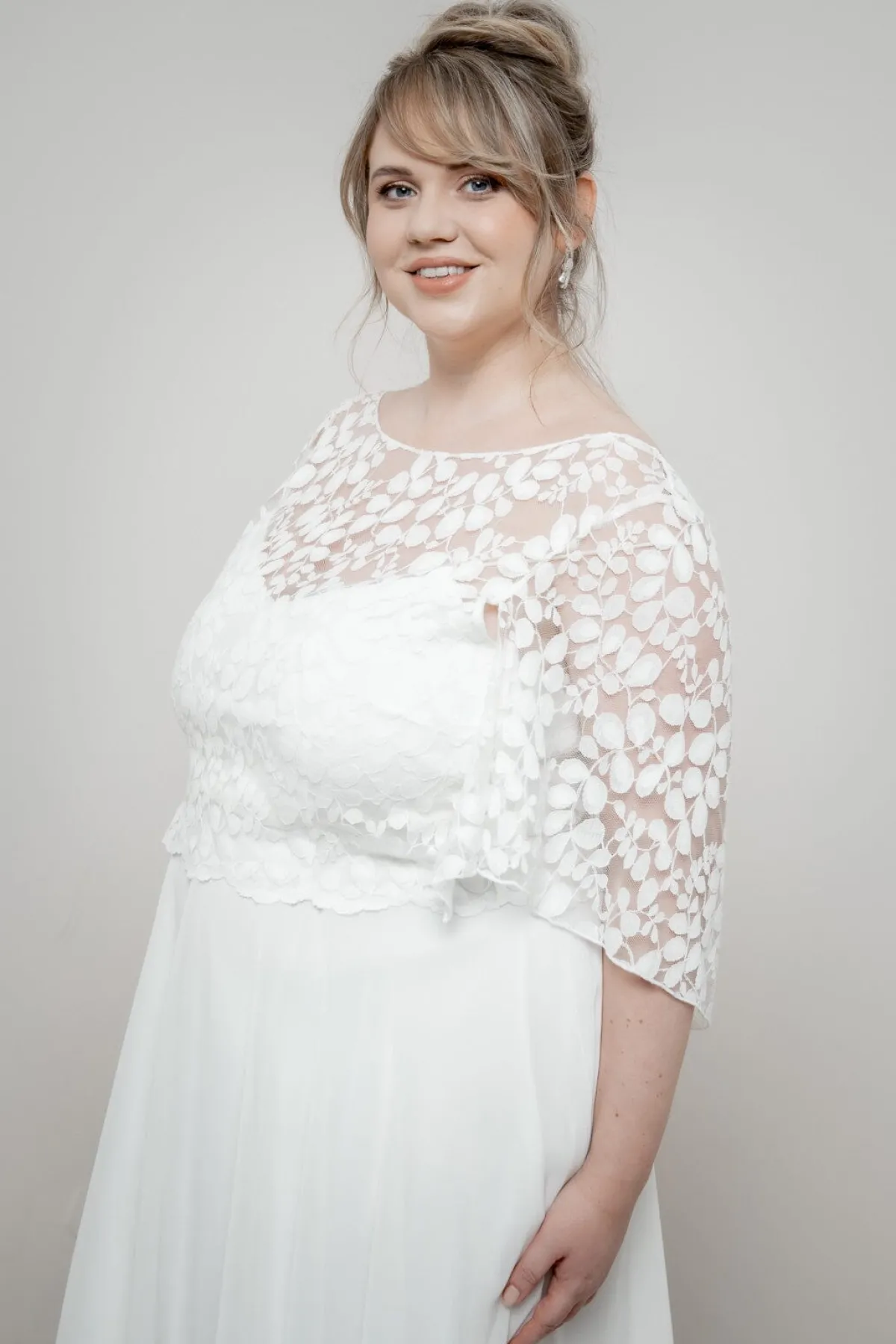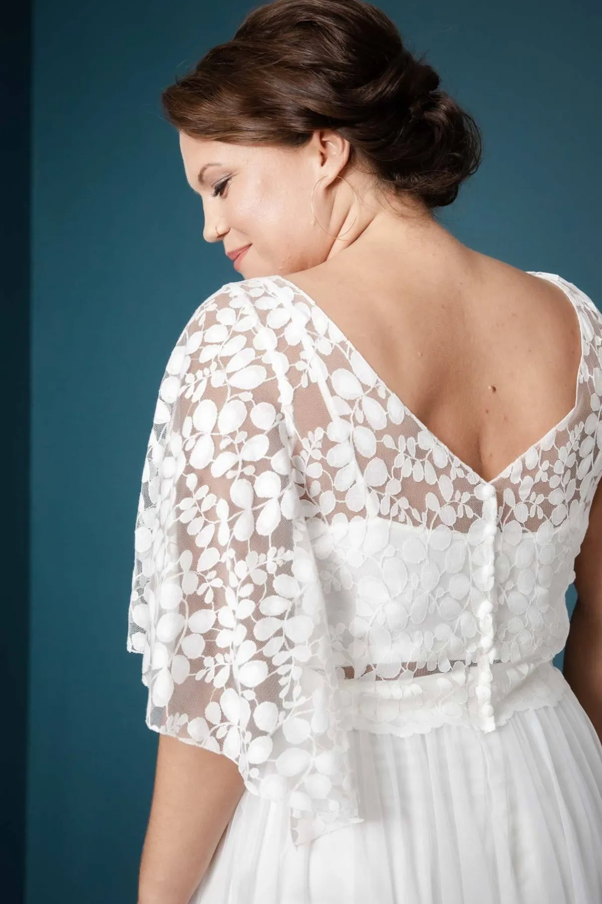 Lucy Curvy ist ein elegantes Bridal Top, das durch seine raffinierten Details überzeugt: sein zeitloser Schnitt, eine romantische Bogenkante, der Bateau-Ausschnitt, der im Rücken zu einem V zusammenläuft sowie eine kleine Knopfleiste im Unterrücken machen das Lucy-Spitzentop zum Key-Piece Deines Brautlooks. Die weiten, fließend fallenden Fledermausärmel sorgen für einen luftig-leichten und beschwingten Look und ein angenehmes Tragegefühl.