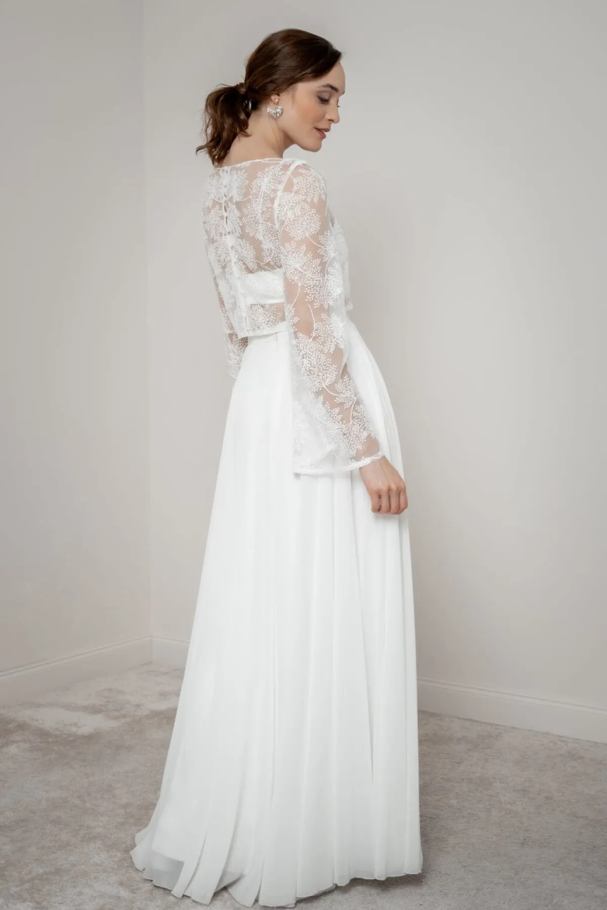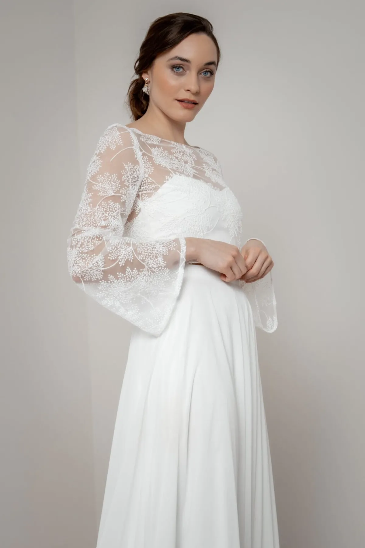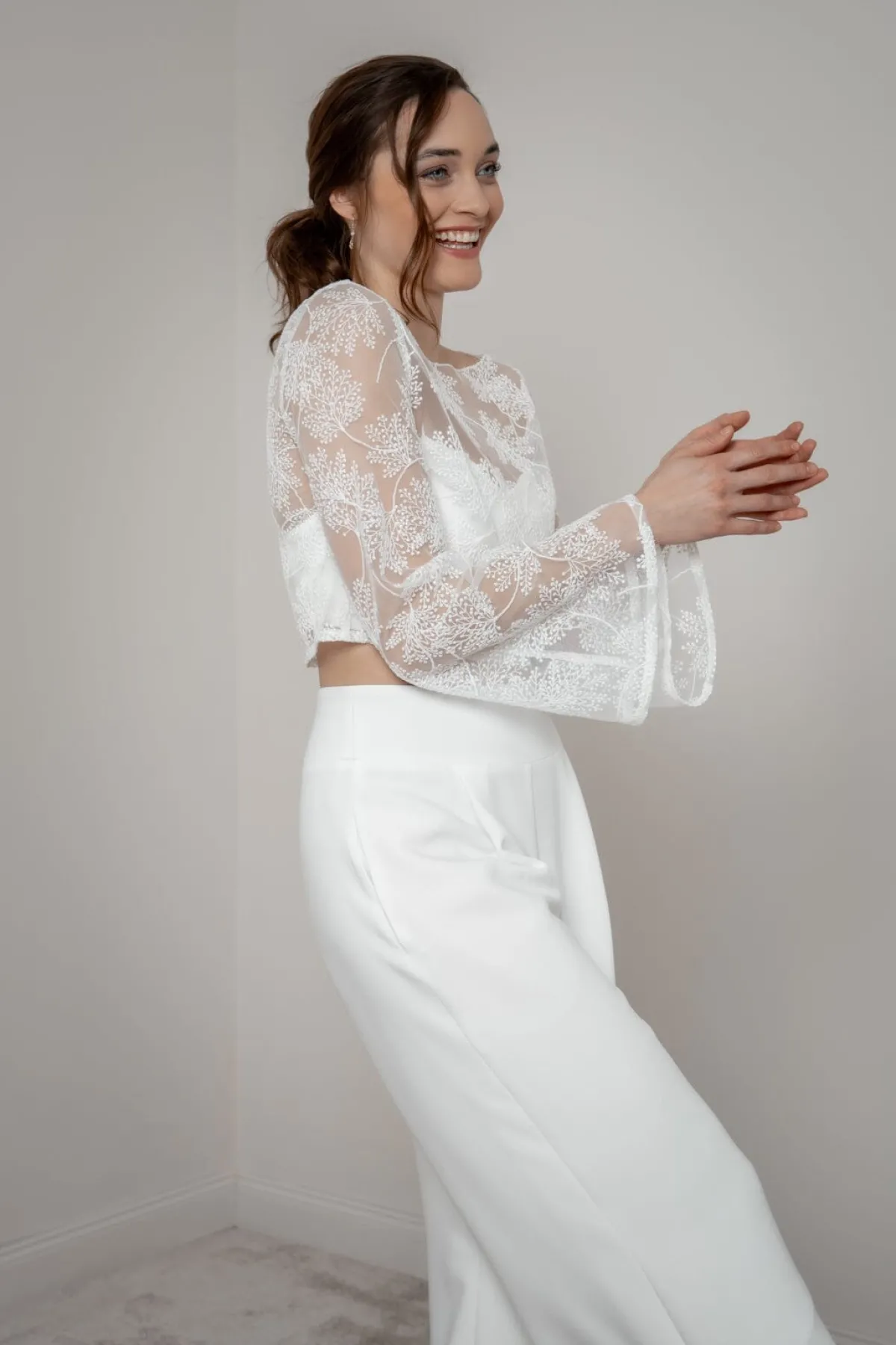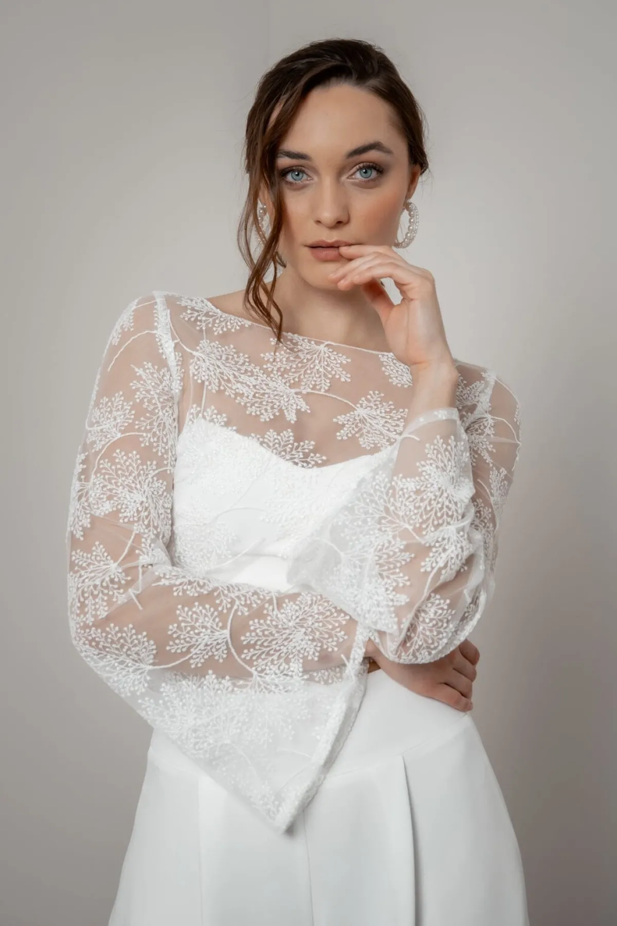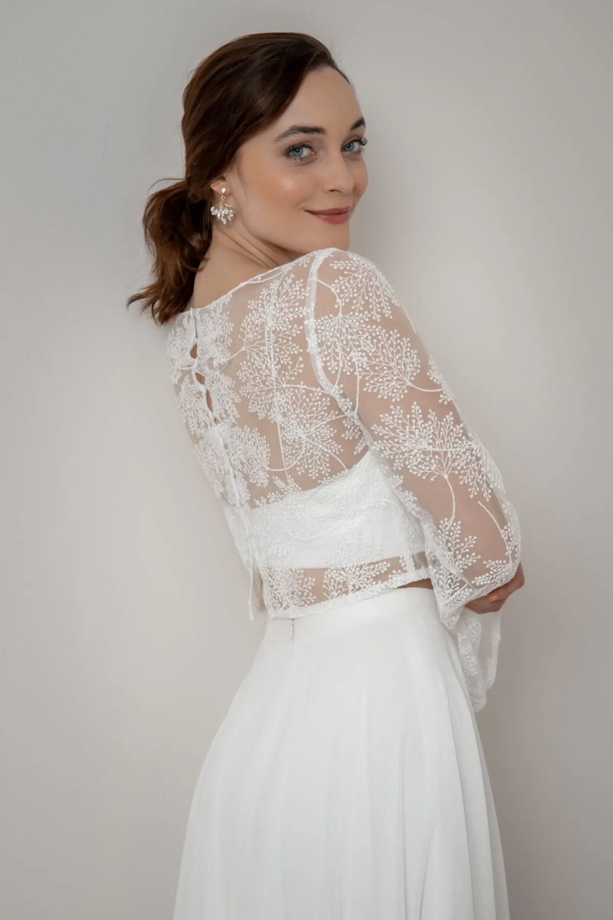 Safi schenkt seiner Trägerin einen ungezwungenen und gleichzeitig erhabenen Look. Weite, lange Trompetenärmel, ein romantisches Allover-Blättermuster und eine durchgängige Knopfleiste im Rücken sind die stilprägenden Details dieses Braut Tops, das sich für moderne Braut Outfits im Mix & Match-Style und auch nach der Hochzeit noch oft gekonnt in Szene setzen lässt.
