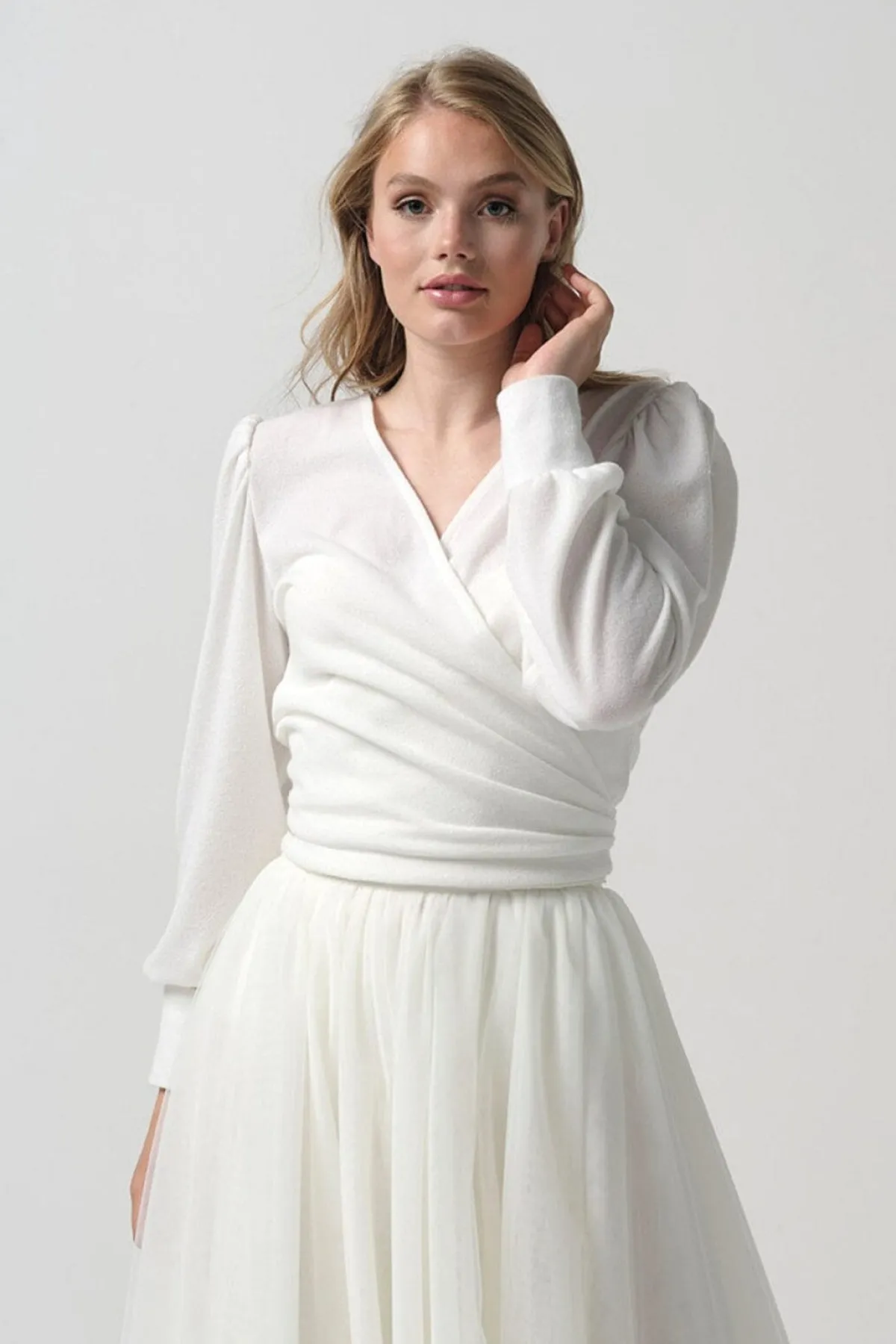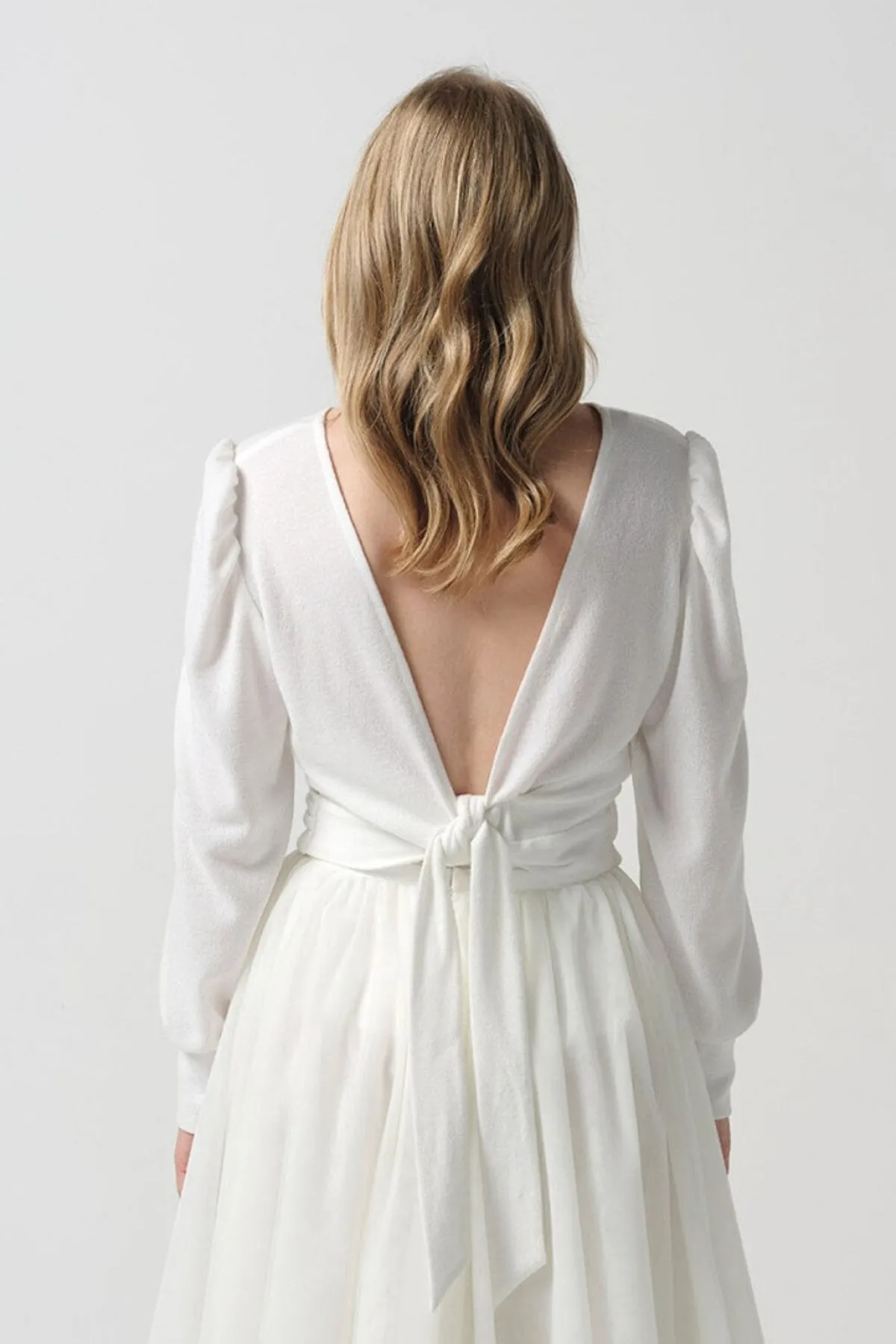 Schlichtes Top aus Strickmix in cremigem Ivory. Besondere Details sind der tiefe Ausschnitt im Rücken, der in Wickelbändern endet, die breiten Manschetten am Handgelenk und die gebauschten Puffärmel.