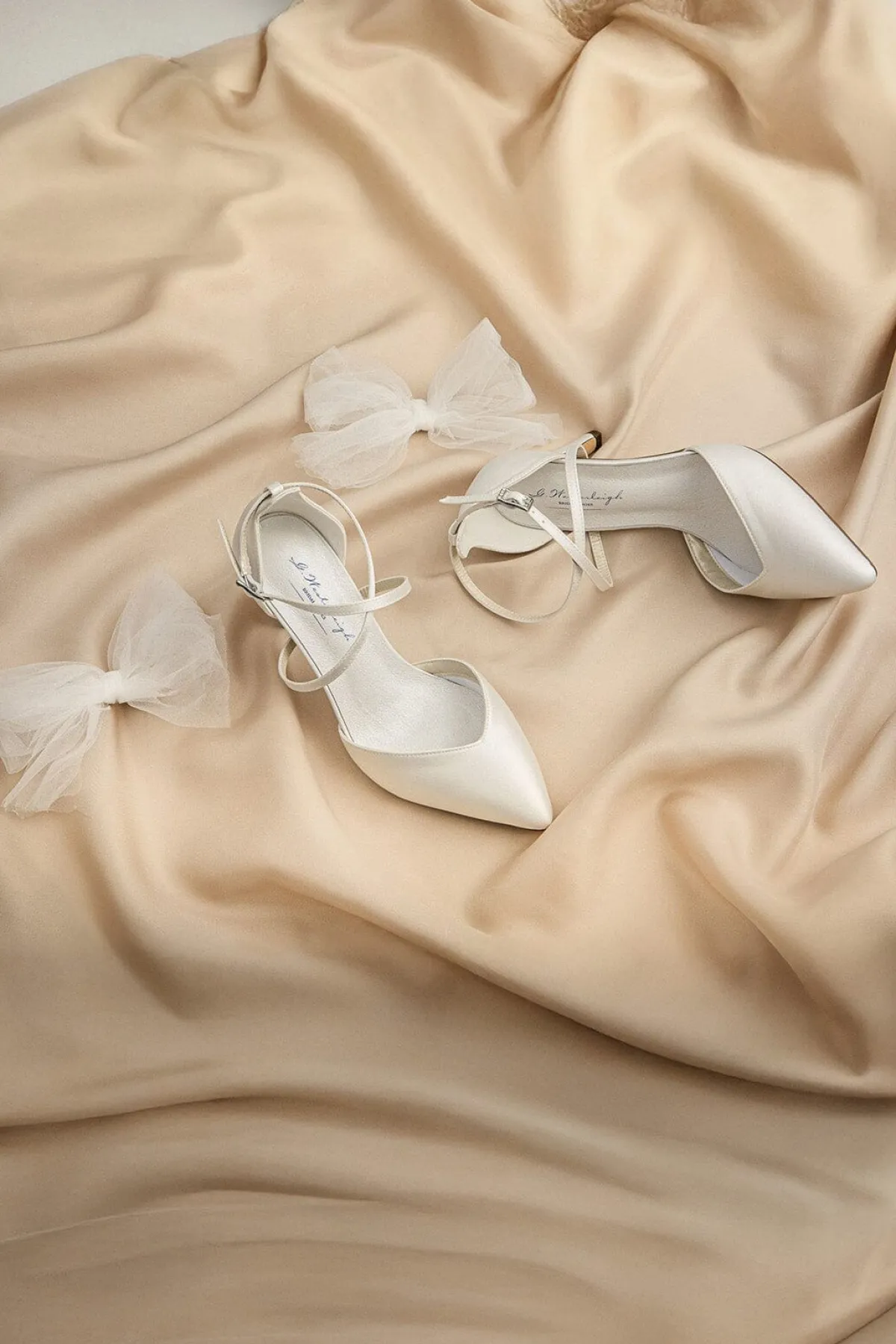 Zauberhafte Brautschuhe mit verspielten Details, die einen romantischen Look erzeugen: eine abnehmbare schleife aus luftigem Tüll, eine stylishe spitze Zehenkappe und ein mit kleinen funkelnden Steinchen verzierte Schließe am Knöchelband machen den Florence Brautschuh zu einem ganz besonderen Modell.