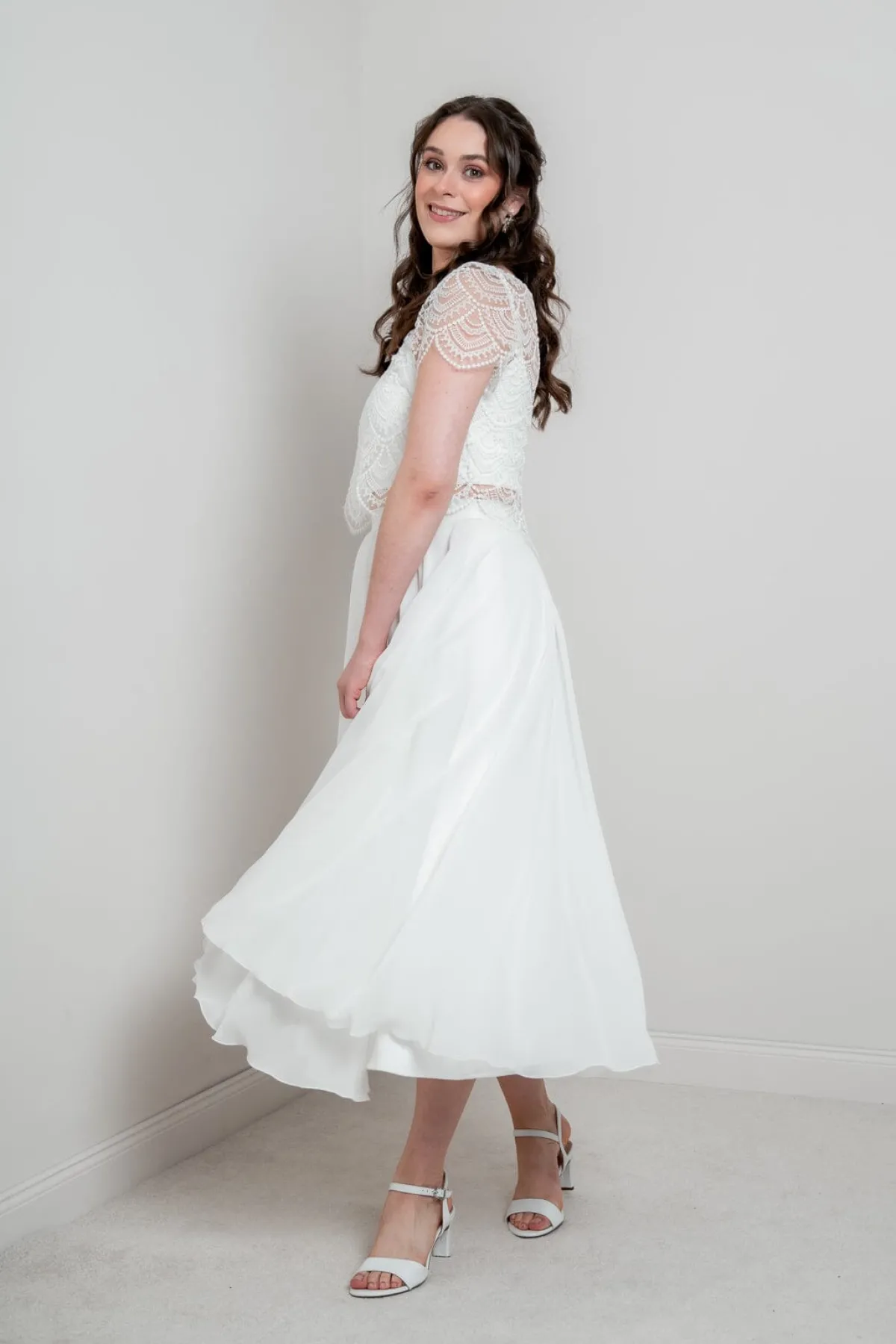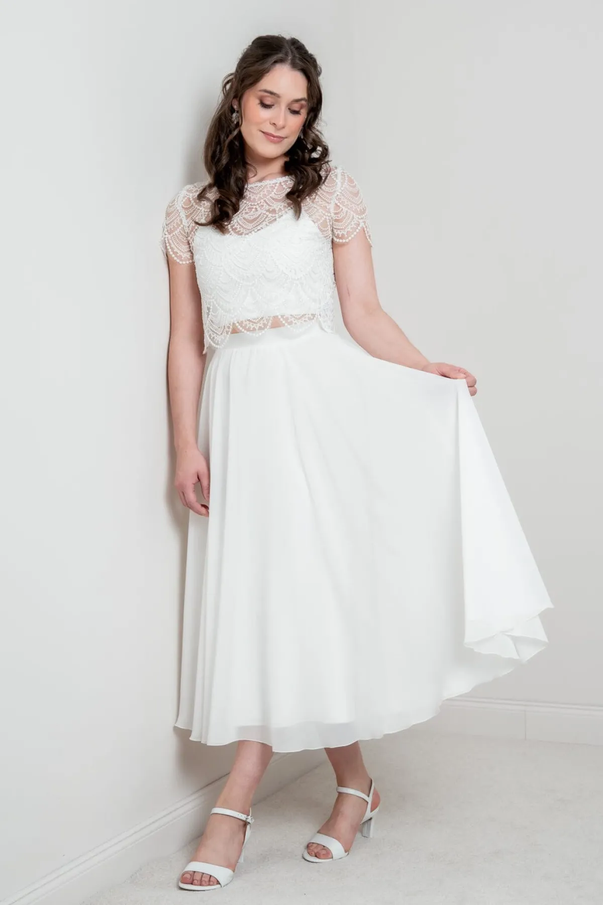 Stelle dir deinen individuellen Brautkleid Zweiteiler zusammen: mit einem Top, Pullover oder Body lassen sich einzigartige Looks kreieren, die sich bestens für Standesamt, Kirche oder Freie Trauung eignen.