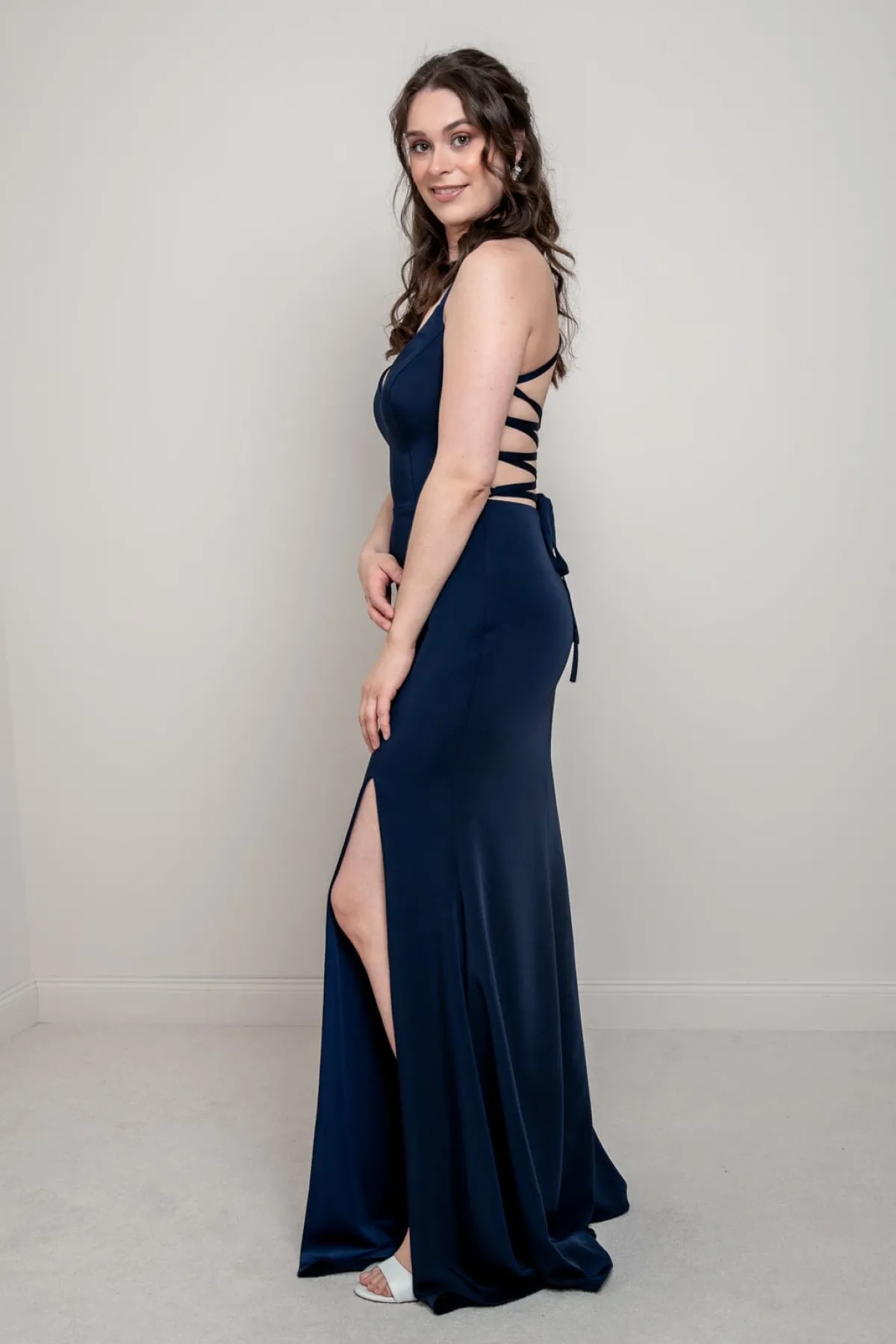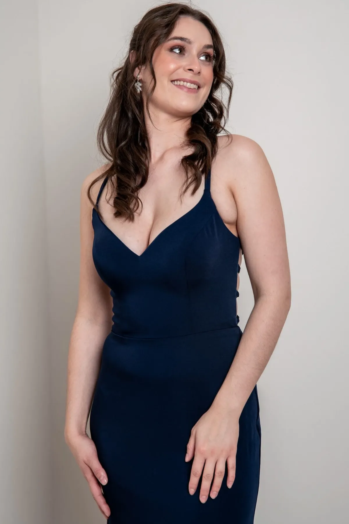 Aus intensivem Dunkelblau strahlt es besondere Eleganz aus. Weitere feminine Details sind sein Beinschlitz und die aufregende Rückenschnürung.