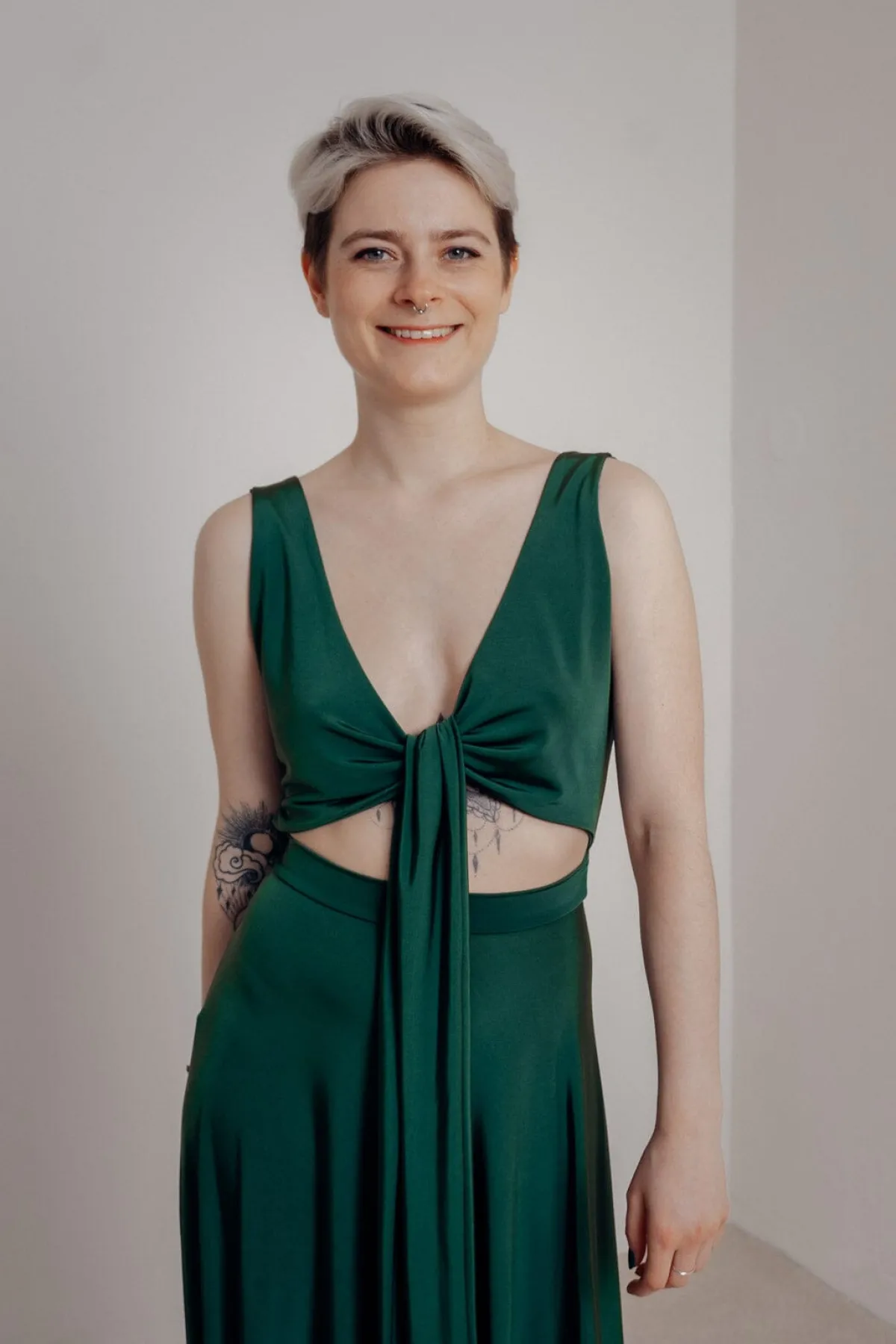 Dieses sinnliche Abendkleid ist ein absoluter Allrounder, denn es kann auf vielfältige Art getragen werden. Ob mit V-Ausschnitt oder raffiniert an der Brust gewickelt, im Rücken geknotet oder an der Taille locker zusammengebunden: der Kreativität sind keine Grenzen gesetzt. Der intensive Grünton macht das Kleid zu einem tollen Eyecatcher und versprüht sofort Lebensfreude.